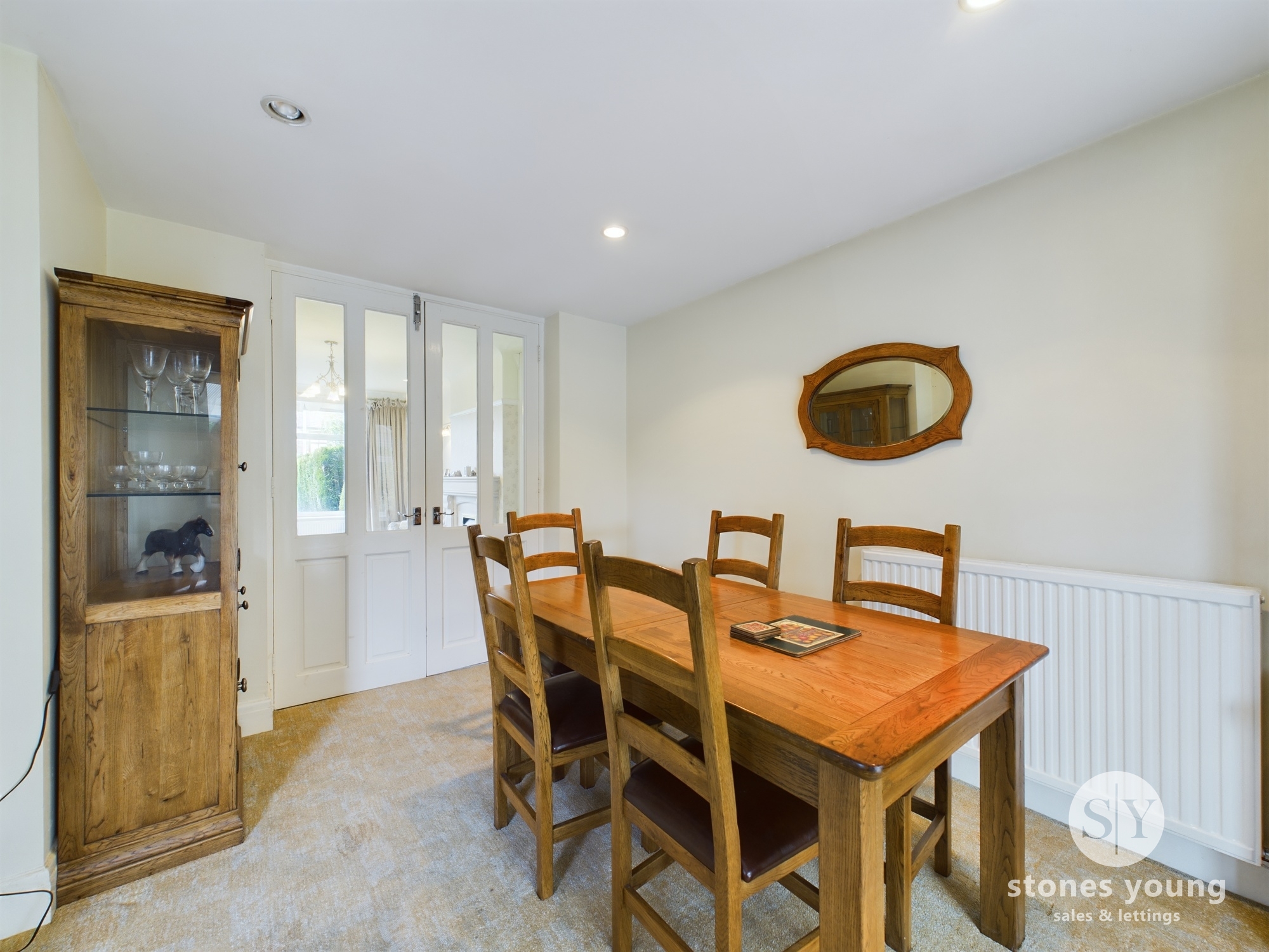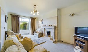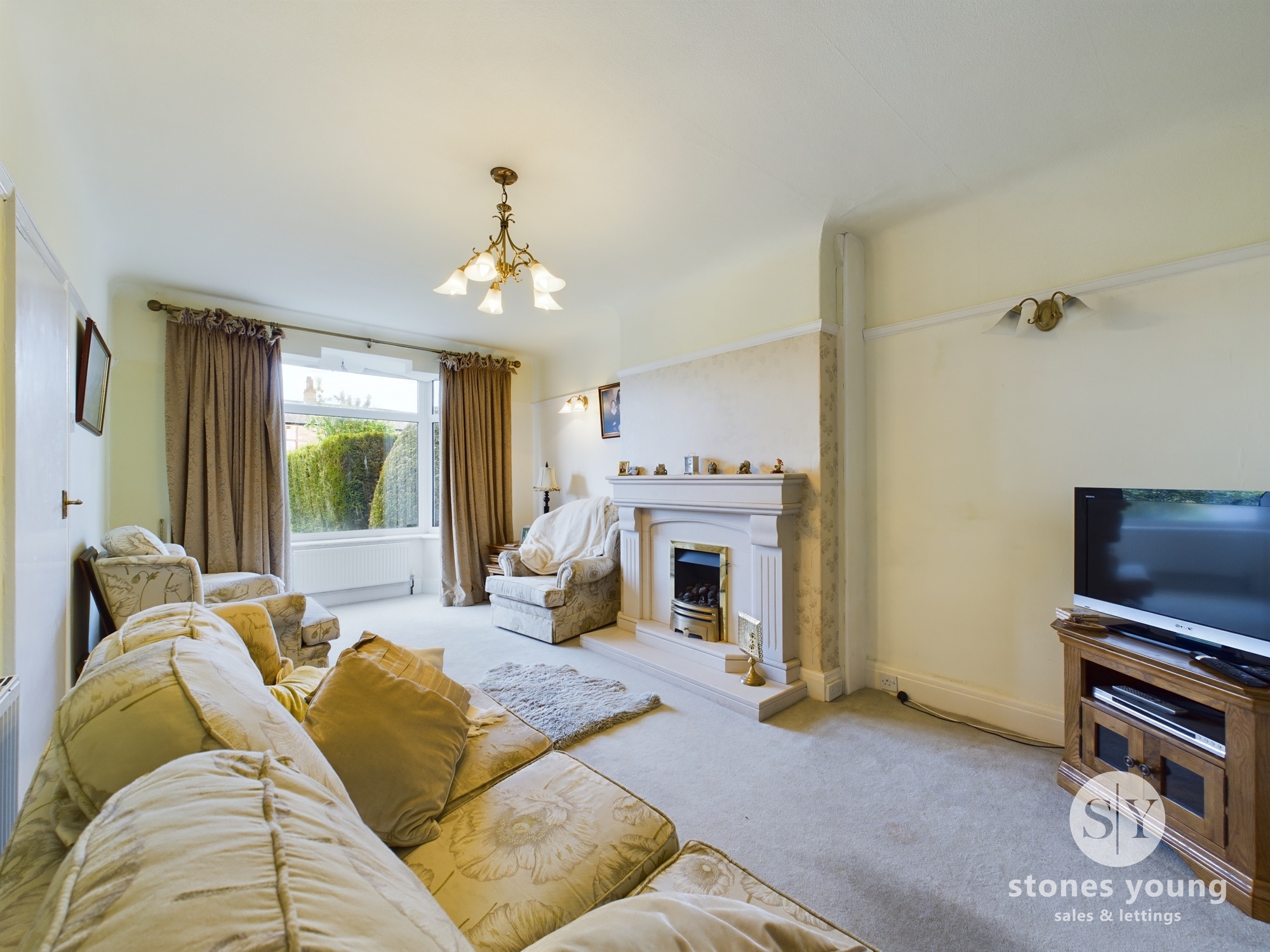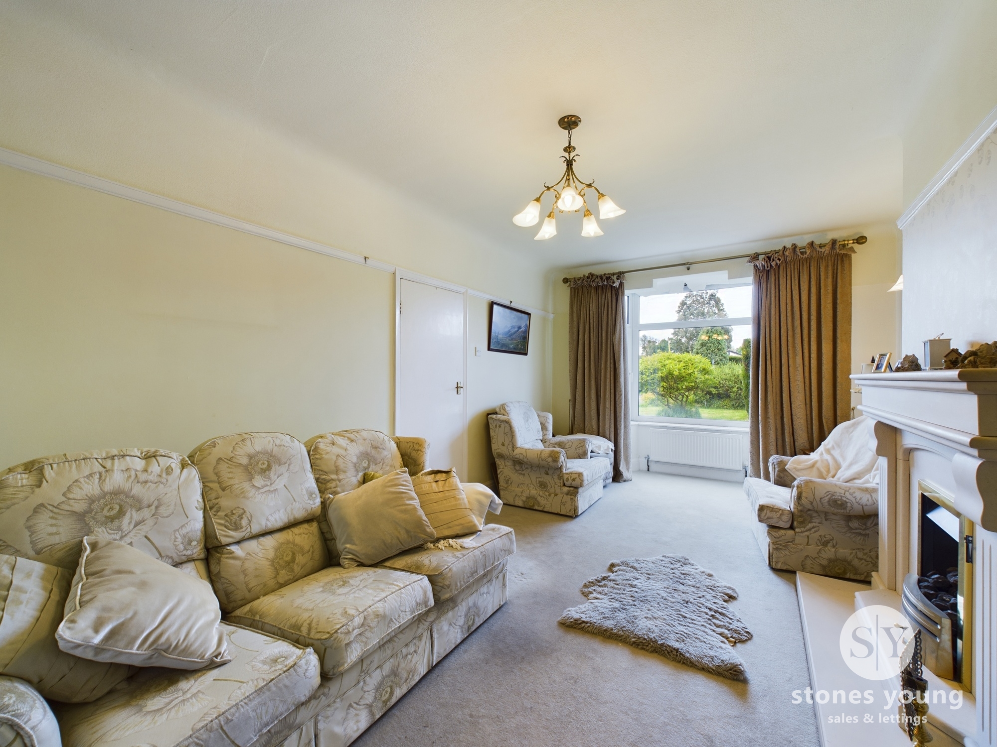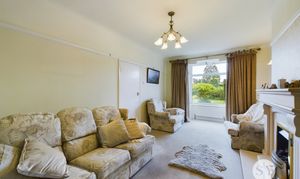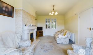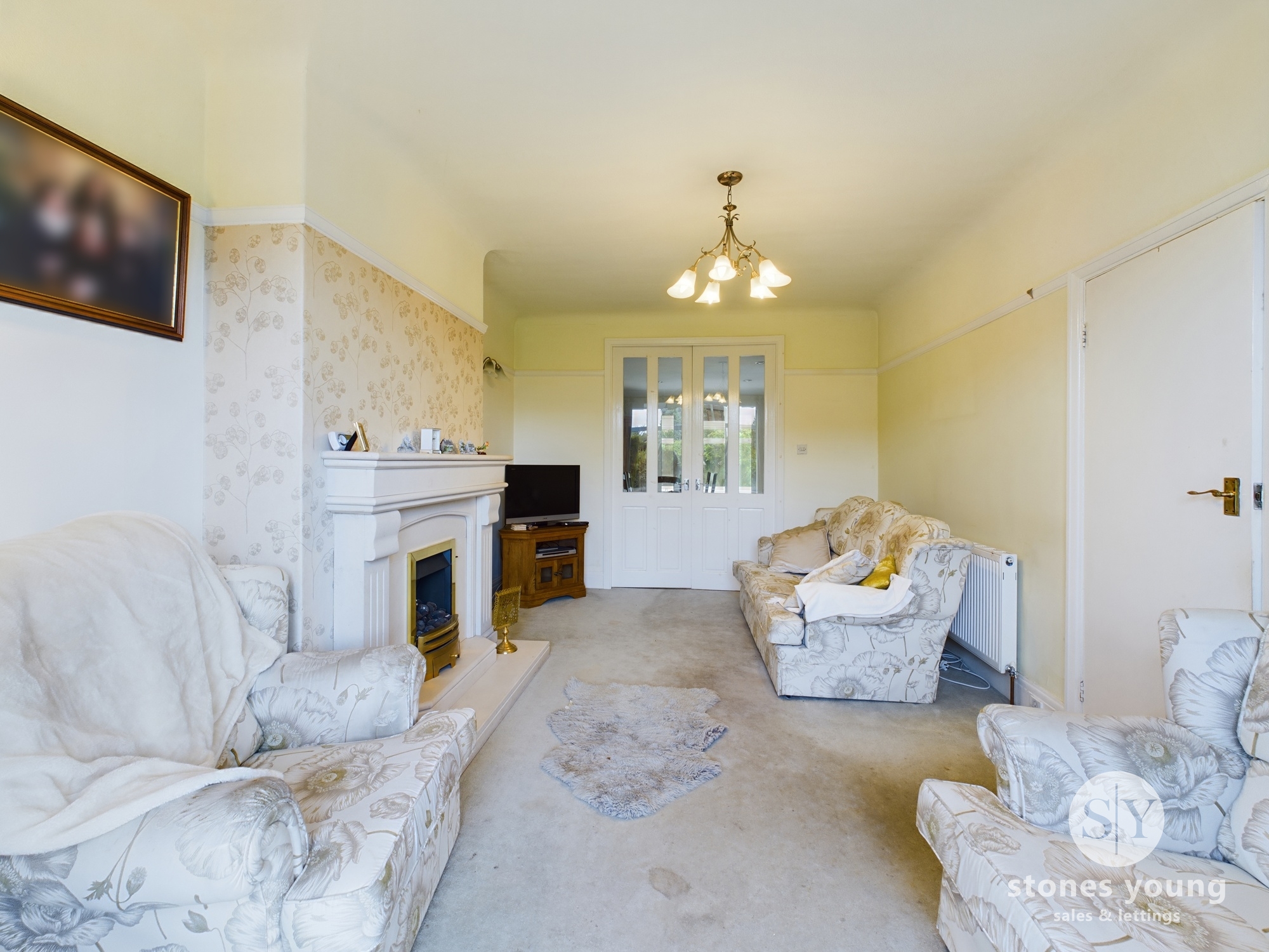 Carpet flooring, gas fire with stone hearth and surround, doors leading to dining area, panel radiator, TV point, uPVC double glazed window.