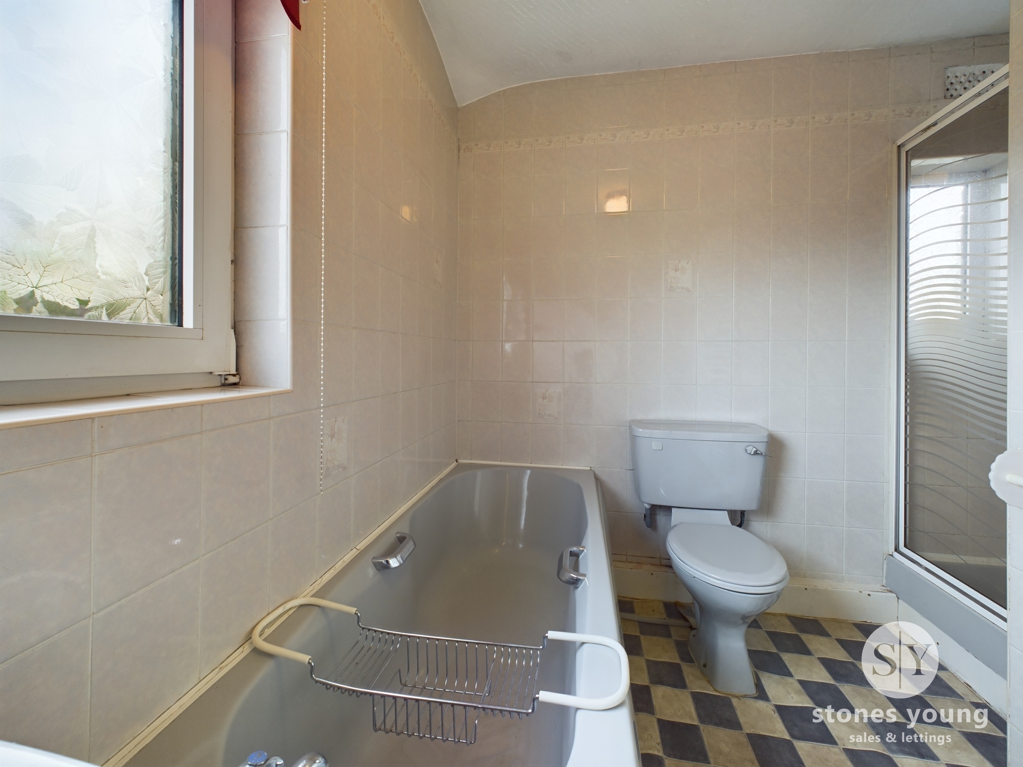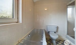 Vinyl flooring, four piece in grey, tiled floor to ceiling, heated towel radiator, frosted uPVC double glazed window.