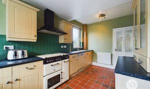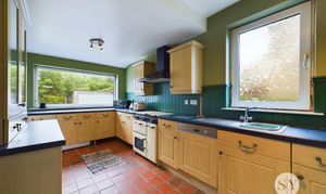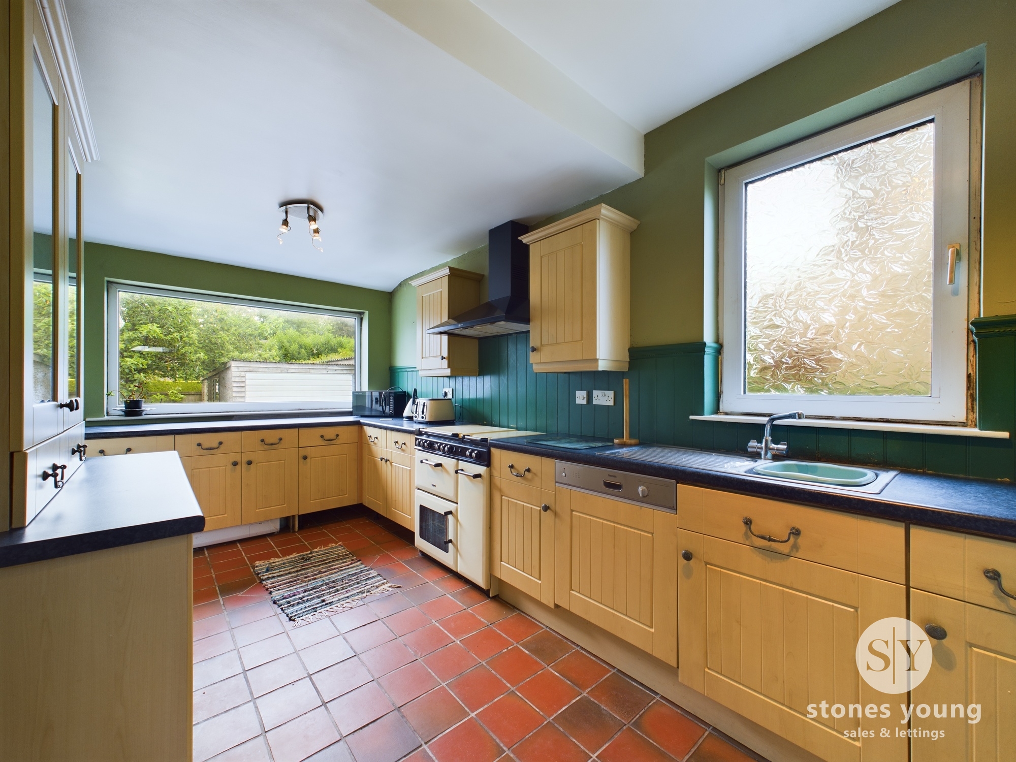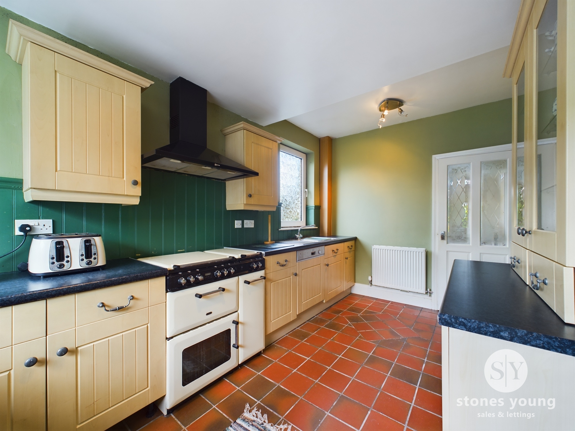 Range of fitted wall and base units with contrasting work surfaces, tiled flooring, space for gas cooker, extractor fan, integral dishwasher, washing machine, fridge and freezer, stainless steel sink and drainer, panel radiator, uPVC double glazed window x 2.