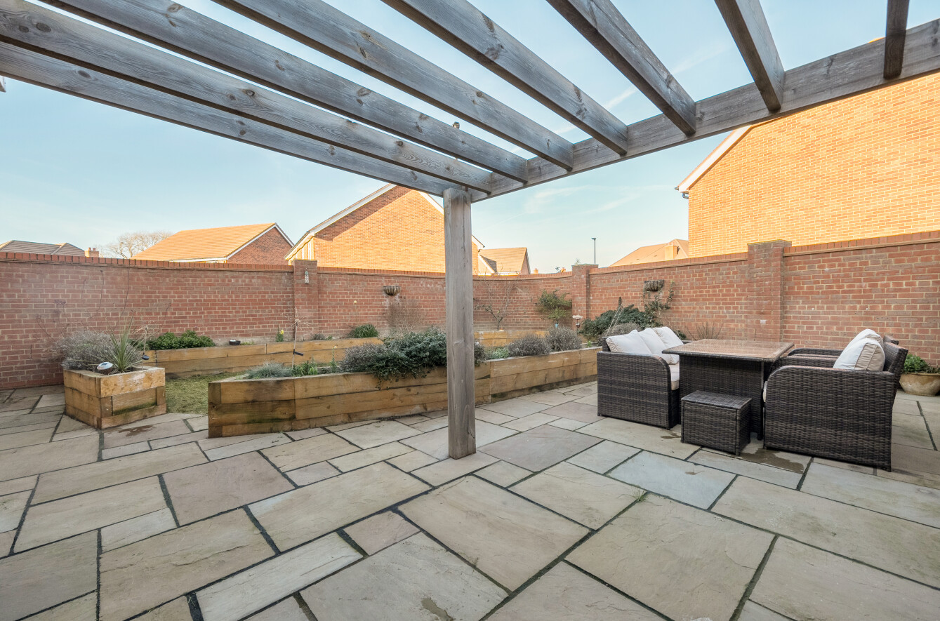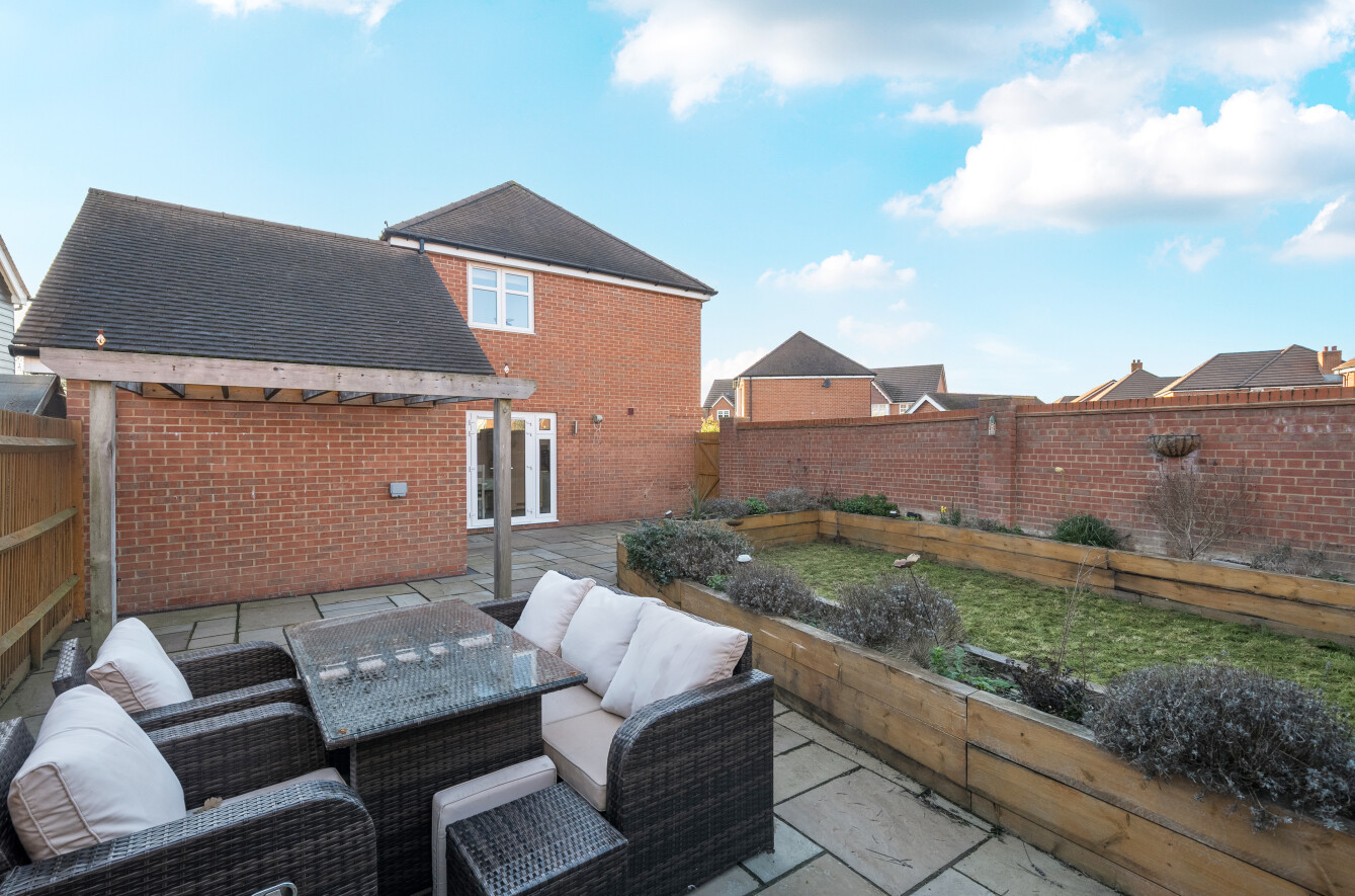 Designed for both relaxation and entertaining, the landscaped rear garden provides a wonderful extension of the living space. French doors from the dining area open onto a smartly finished patio, leading to an inviting outdoor lounge area with ample space for a hot tub, if desired. The garden is predominantly laid to lawn and complemented by thoughtfully planted borders for year-round pleasure.