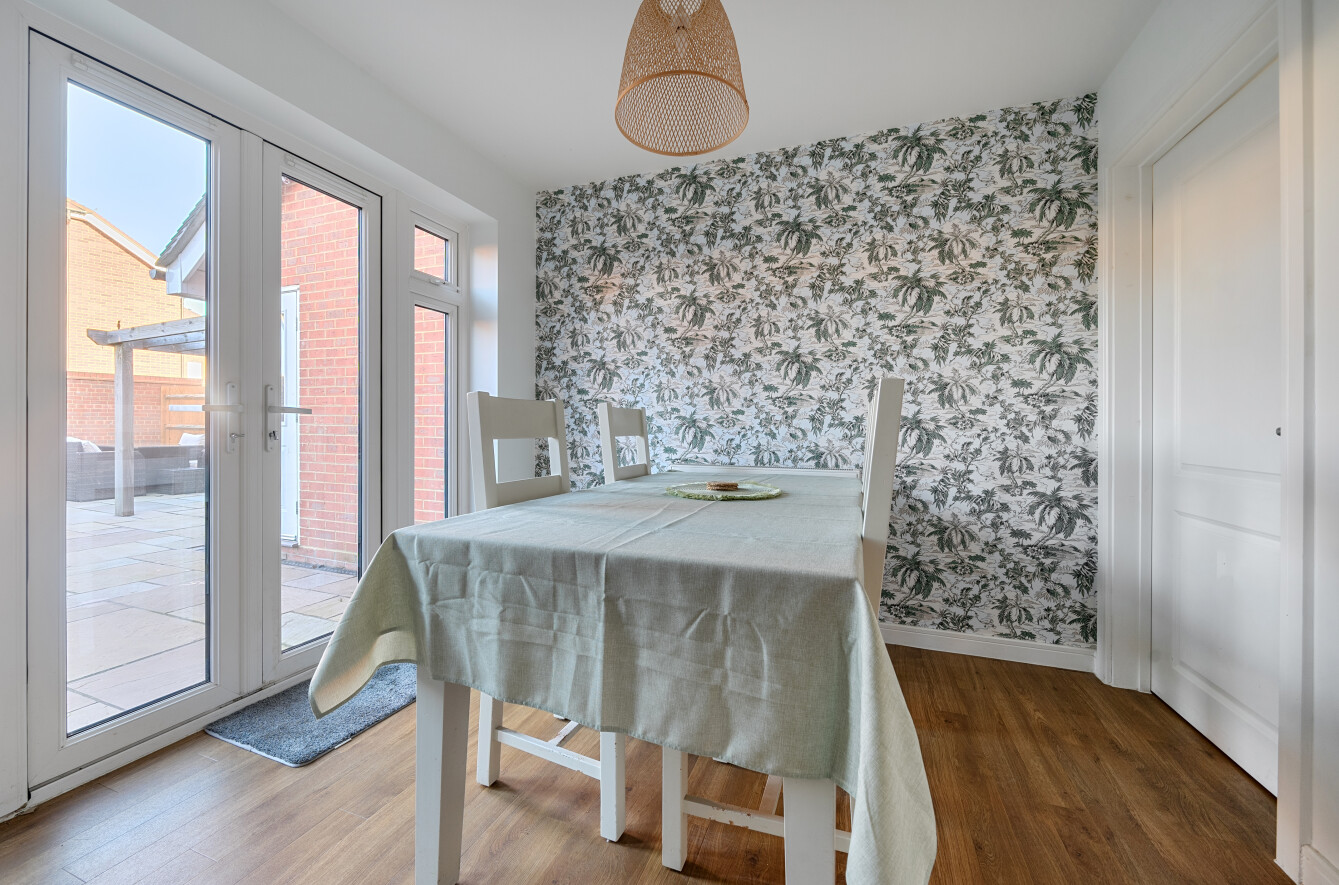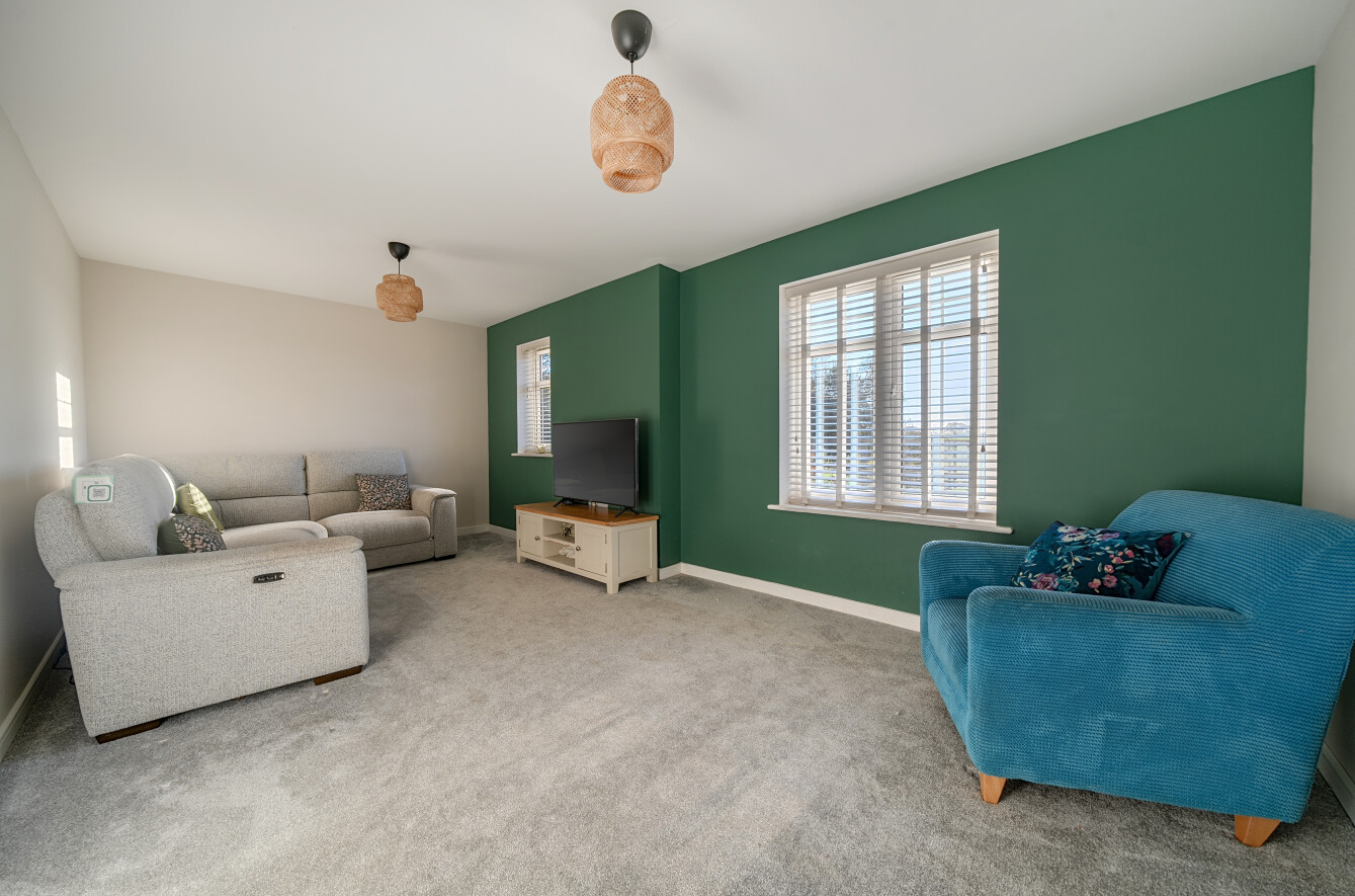 A generous reception hall provides an impressive sense of arrival and leads to the well-designed kitchen and dining room positioned to one side of the house. This bright and sociable space features a fully equipped kitchen, separate utility room and excellent storage, with attractive views across the rear garden. To the opposite side lies an elegant dual aspect living room, perfectly placed to enjoy the outlook over the neighbouring greenspace.