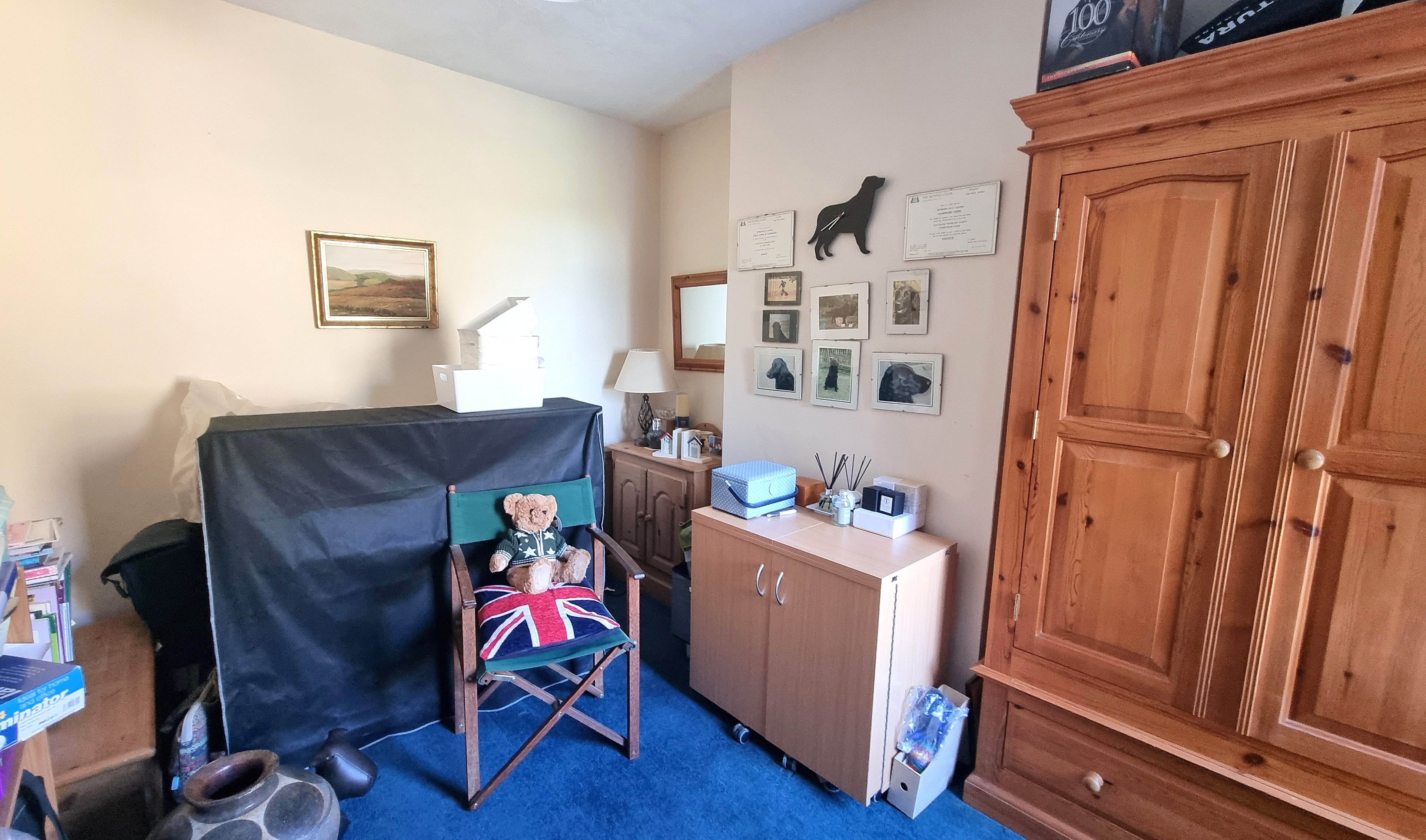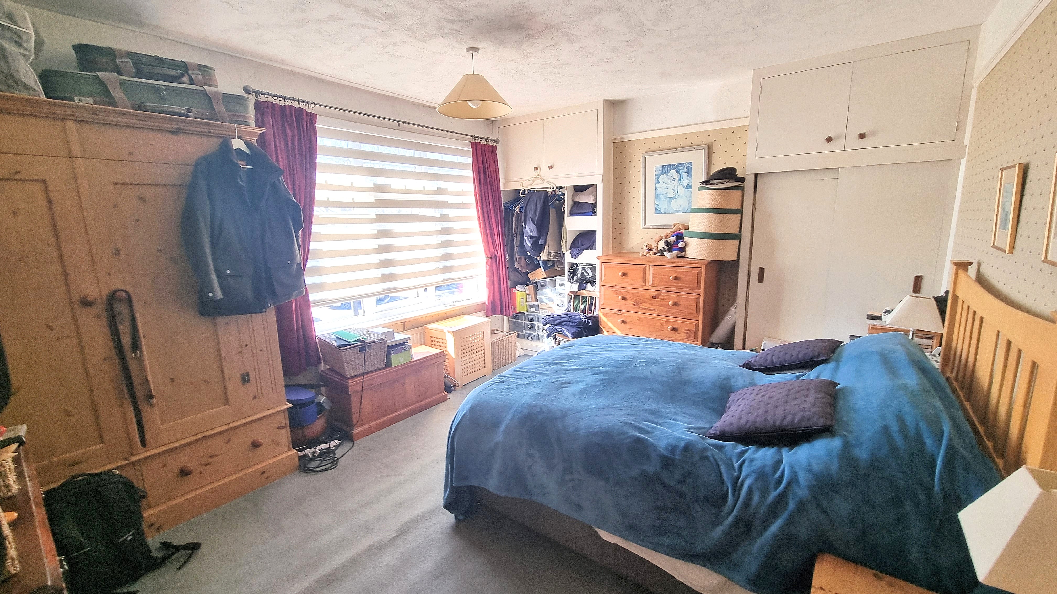 First Floor deep airing cupboard. 2 Bedrooms (Bedroom 1 + built-in wardrobes). Shower Room fitted suite, low level WC, wash basin, tiled cubicle, loft hatch and rear window.