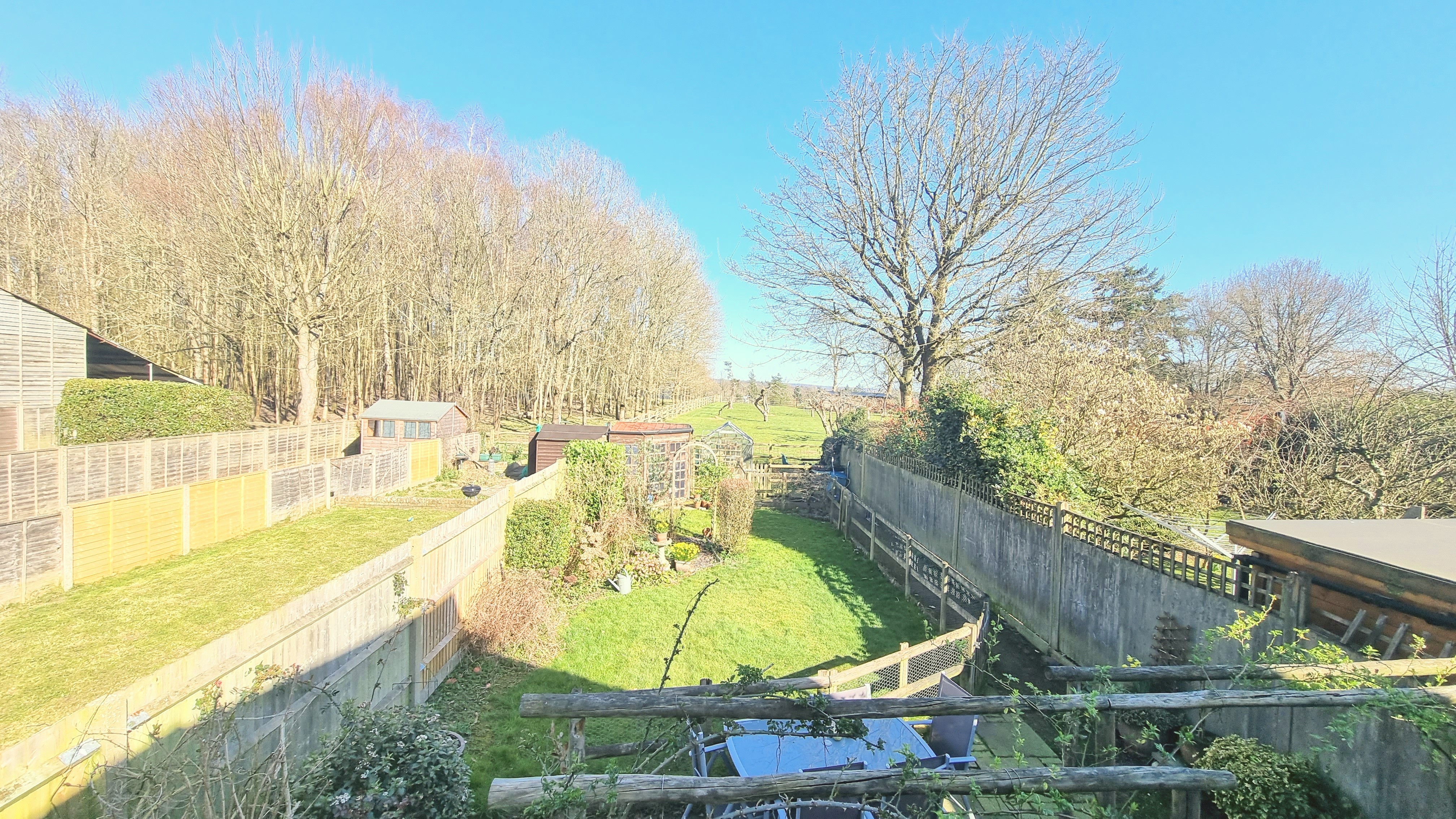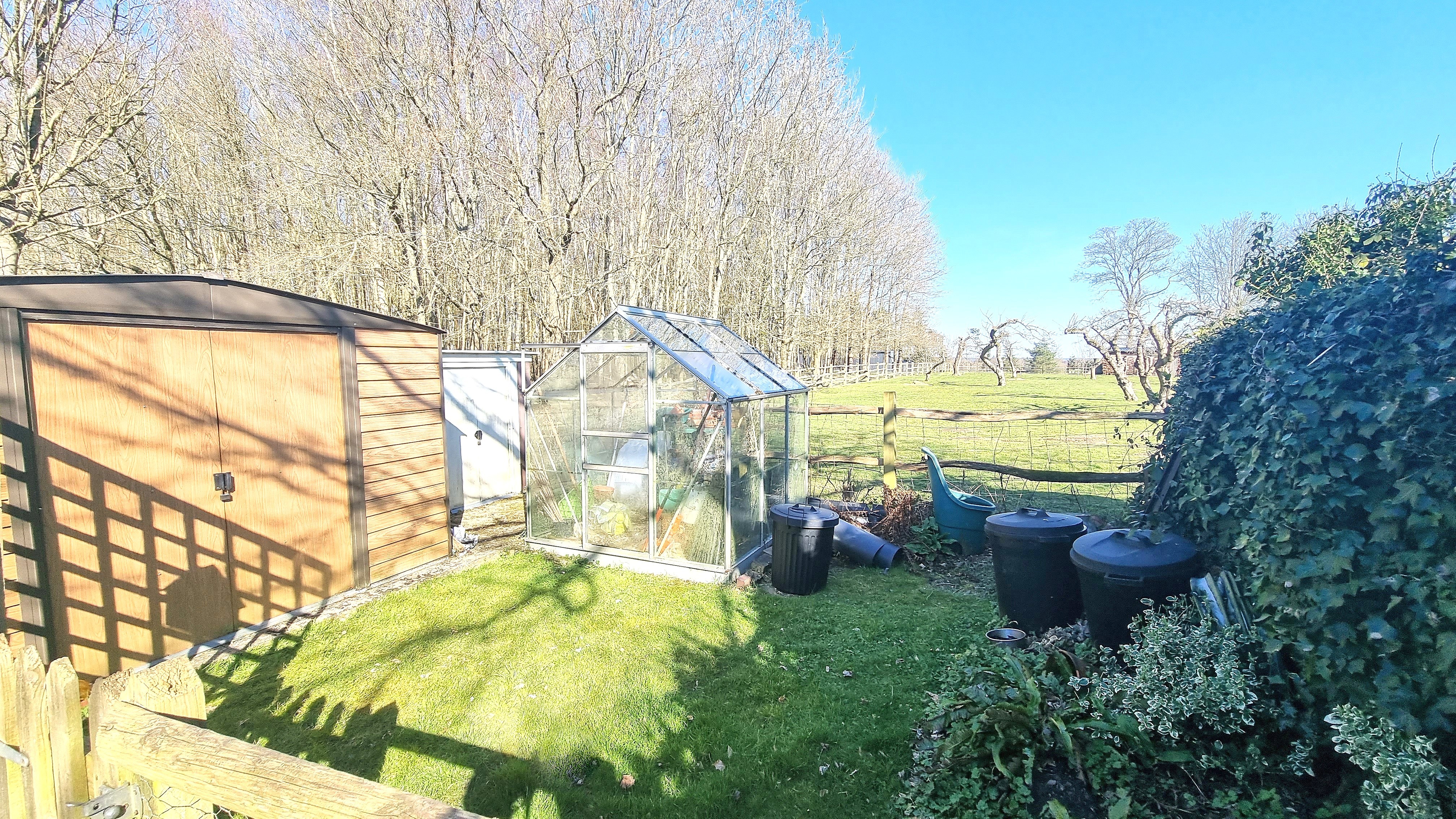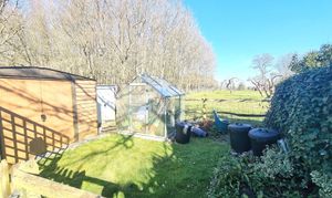 A generous East Facing Rear Garden with paved patio, areas of shaped lawns, storage sheds and greenhouse.