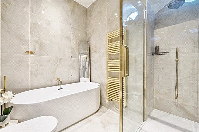 The home features impressive high ceilings, large sash windows, and refined period detailing, creating a stunning open-plan living space bathed in natural light. The contemporary kitchen is ideal for cooking enthusiasts, while the two spacious bedrooms offer comfort and versatility. The modern bathroom is complete with a stylish walk-in shower for added ease.