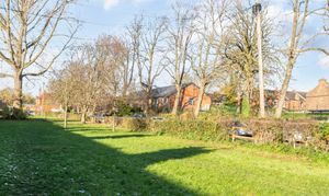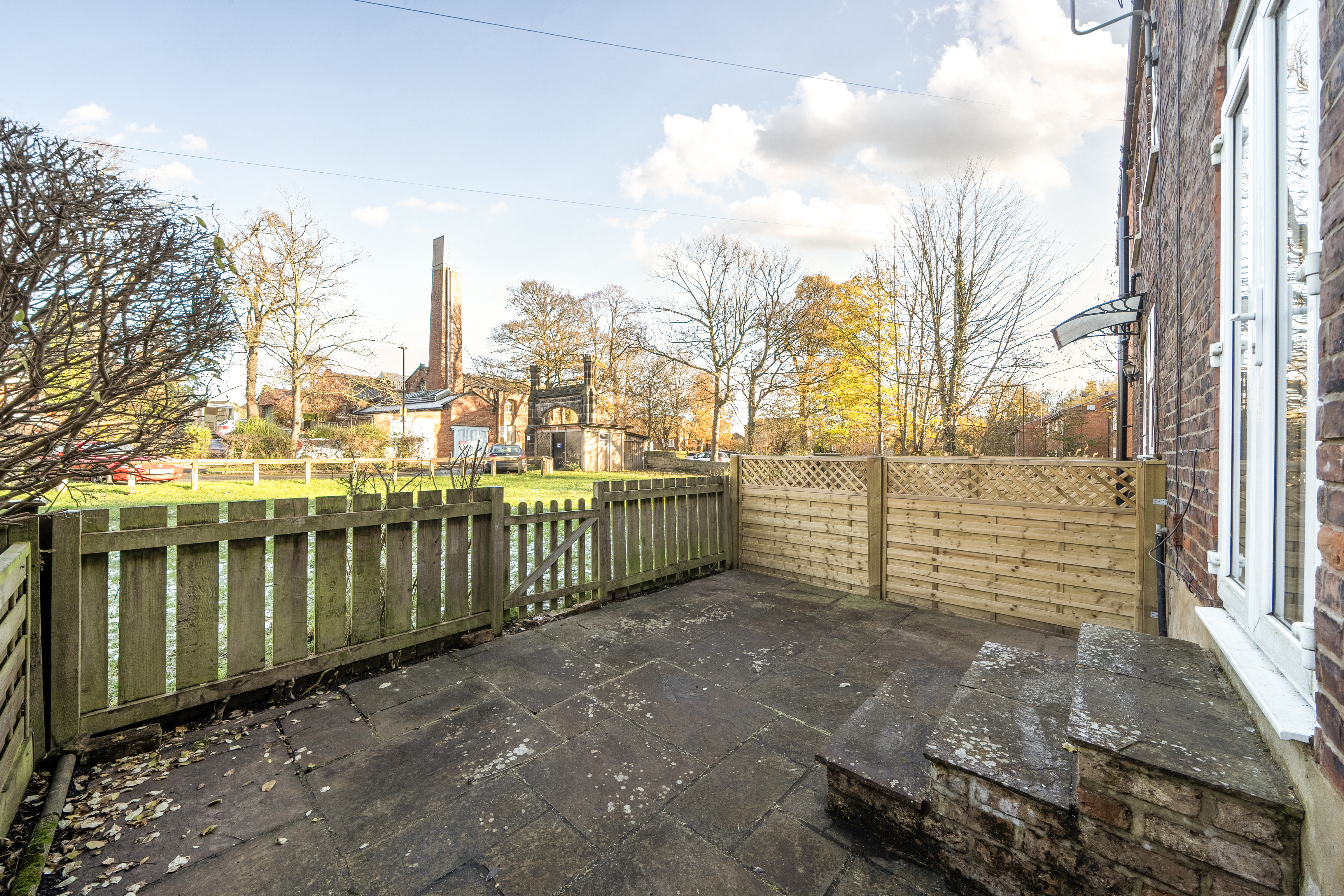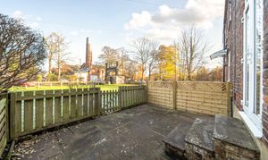 The garden is an enclosed stone patio with wooden gate, backing onto a lovely communal lawn which stretches along the whole row of houses, perfect for fostering a friendly and active community atmosphere.