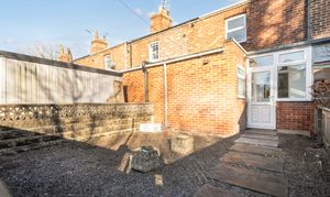 The charming red-brick property, fronted by an enclosed gravel front garden, opens into a bright porch area with direct access to the contemporary family bathroom, containing bath and walk-in shower. From here, the rest of the ground floor follows, with access to the fitted kitchen with attractive tiled splashback and then the spacious reception room with built-in storage cupboard, feature archway alcove and double door access to the outside.