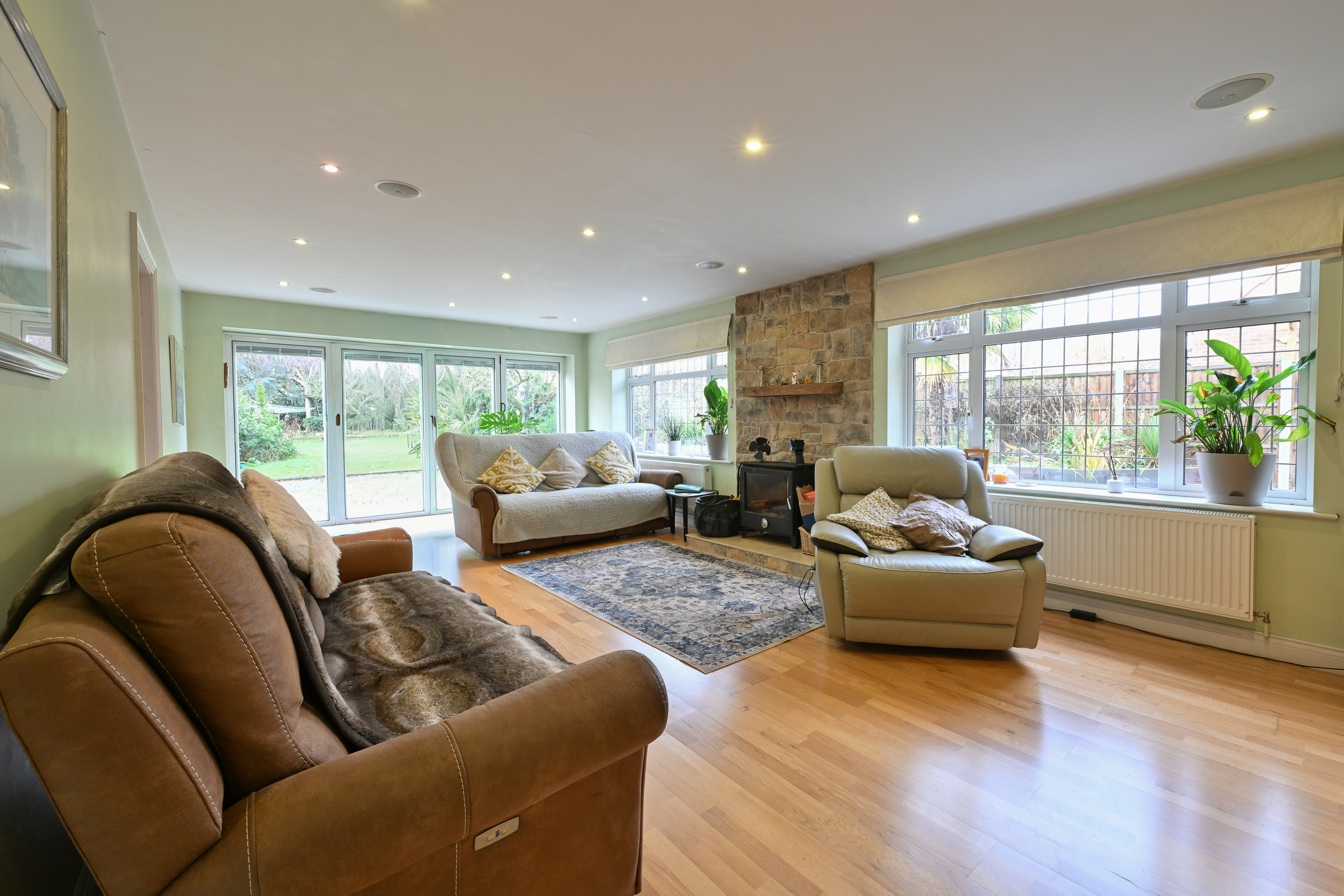 Upon entering, you are welcomed by a spacious and inviting hallway that leads to the principal reception rooms. The main living area is generously proportioned, featuring a charming log burner that creates a warm and cosy atmosphere during the cooler months. This room has bi-folding doors which open up onto a huge wrap around patio. There is a good sized study to the side of this room. Large windows throughout the home allow for an abundance of natural light and frame stunning views over open countryside, providing a tranquil and picturesque outlook from many rooms.