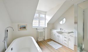 Upstairs, the property comprises four well-proportioned bedrooms, with the master being a beautiful focal point with a juliet balcony opening up to the stunning rear garden. It also has a large en-suite and walk-in wardrobe. The remaining three are all very generous in size with a further en-suite to bedroom two.