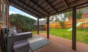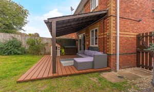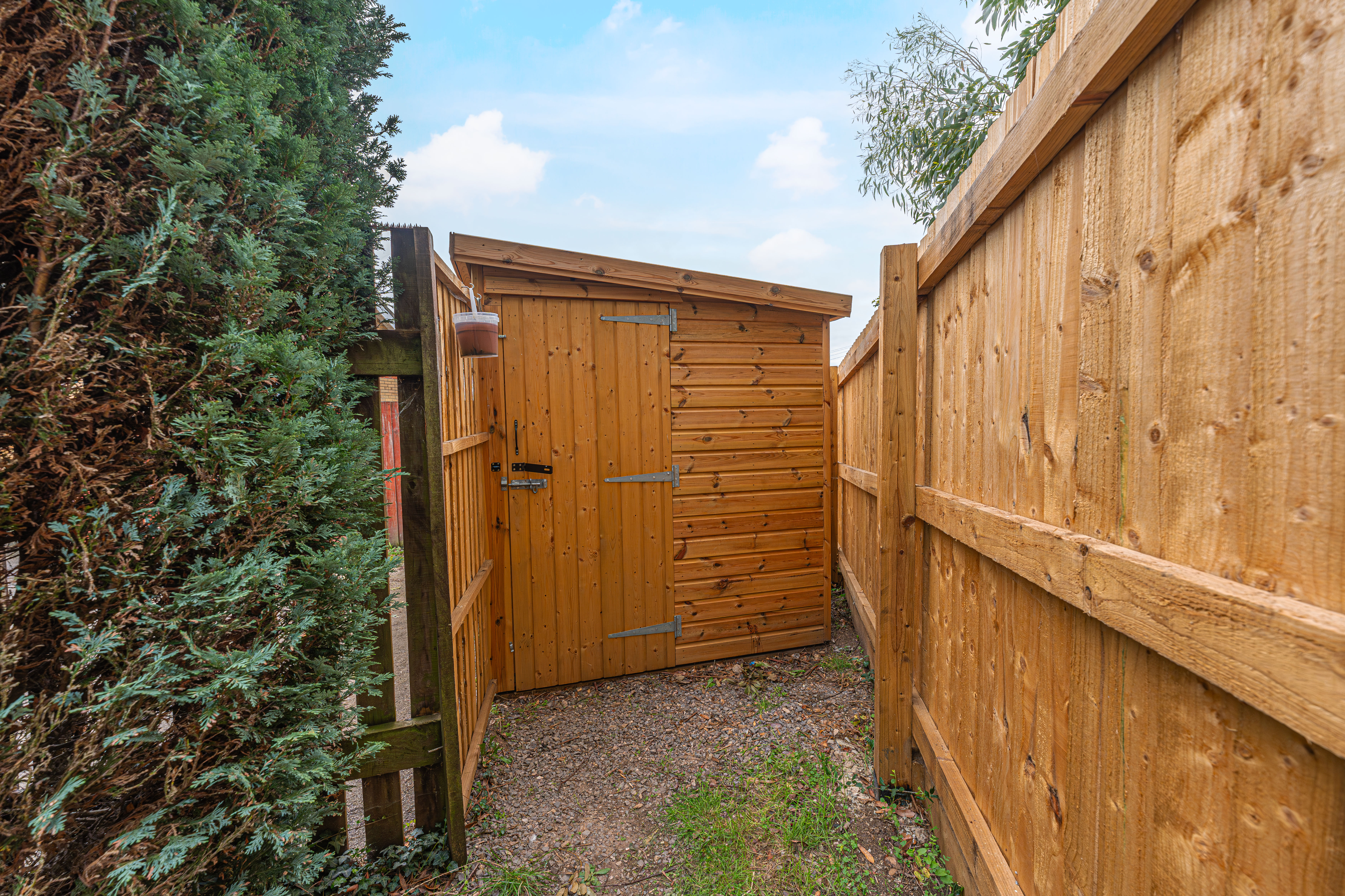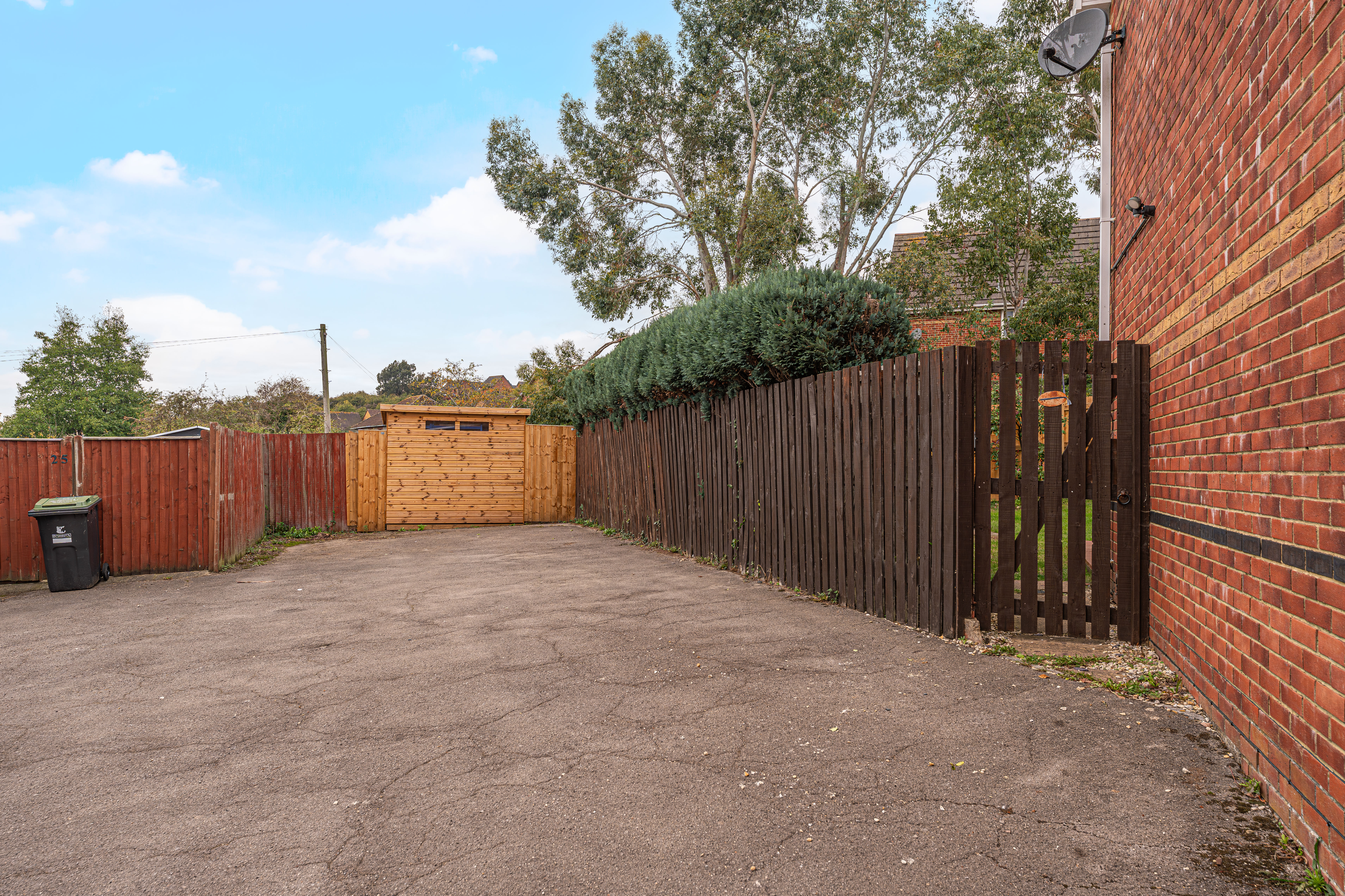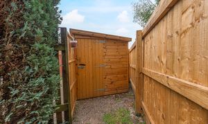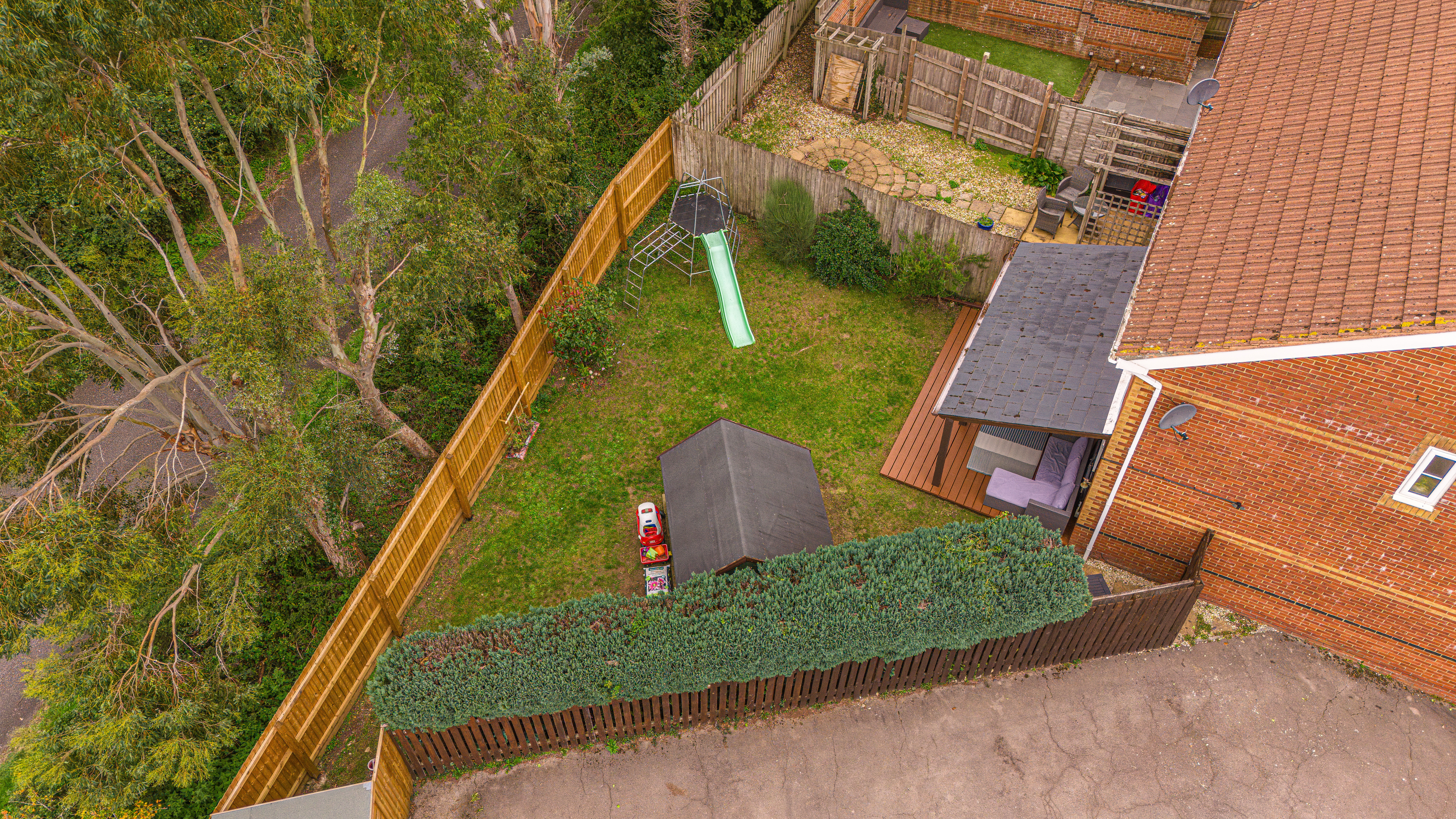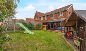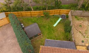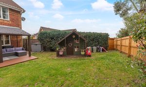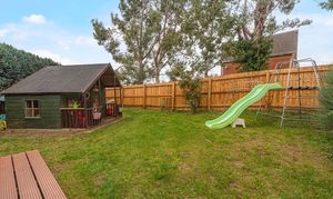 Stepping outside we have the fully enclosed rear garden, which sits on a generous corner plot, with plenty of space for unwinding and welcoming visiting friend and family. The garden mainly consists of a sizeable grass lawn, while from the house we can find a marvellous sheltered veranda which has been has been extended by the current vendors, showcasing a great space for lounging and al-fresco dining. The property also benefits from a newly constructed shed and a Wendy house for convenient storage, while a gateway from the garden connects to a shared driveway area, with allocated space for 2-3 vehicles to be parked off-road.