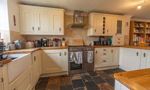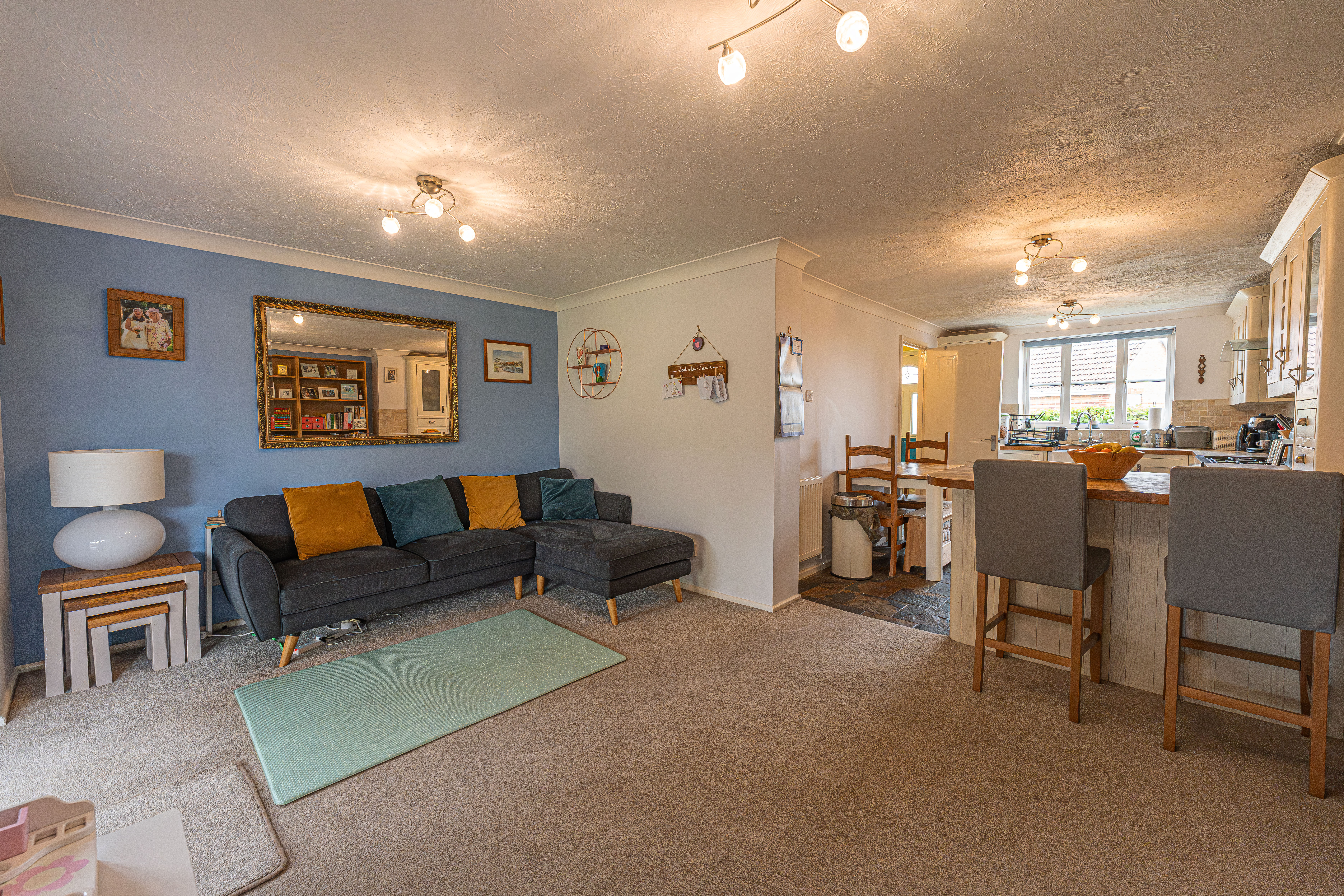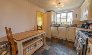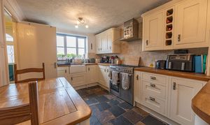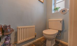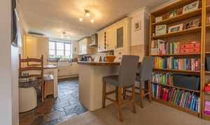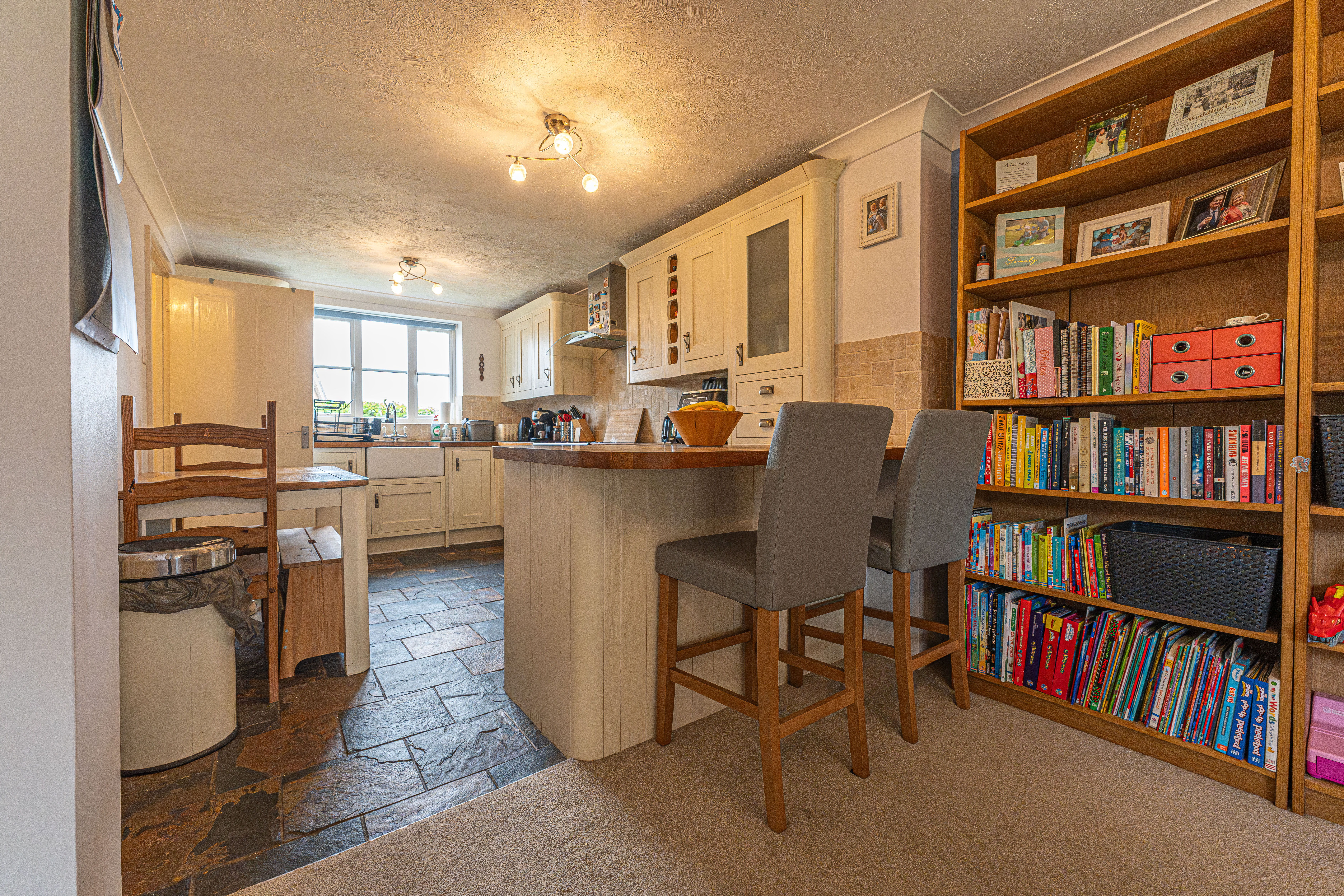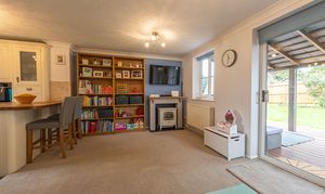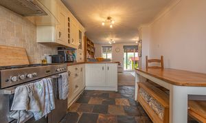 We enter this wonderful family home to the front, where we can find a W.C and a closet from the hallway which can house cloaks and utilities. Continuing through the house we come to the kitchen, which features a Belfast sink, range cooker, and plenty of convenient storage options. The kitchen is also features a charming breakfast bar and currently doubles up as the dining area, while the spacious lounge is found at the rear of the house. Connected to the kitchen by an airy open plan design, this living area offers plenty of space for various furniture layouts, and a flood of natural light through sliding doors that open to the garden, creating creating a bright and airy atmosphere that is great for relaxing and entertain visitors.