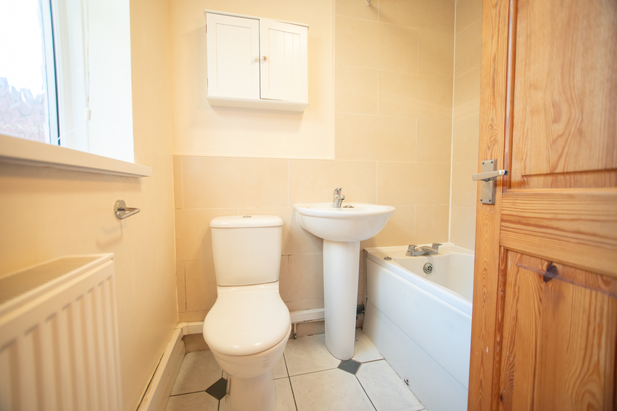 With laminate flooring, toilet, wash basin on pedestal, bath, window, and radiator.