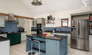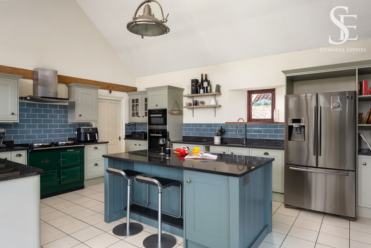 Continue through into the light, bright and inviting family kitchen diner, where a central island offers breakfast bar seating enabling casual dining and conversation. Storage is plentiful, while appliances include a bottle-green Aga, extractor hood, integrated Neff dishwasher alongside space for an American-style fridge-freezer. Opening up to a timber frame garden room with full glazing to three sides, bifolding doors and French doors to the garden again offer an indoor-outdoor flow ideal for summer soirees. A sociably designed room, where the focus is centred around the garden room and views, the kitchen is perfect for modern family living.