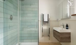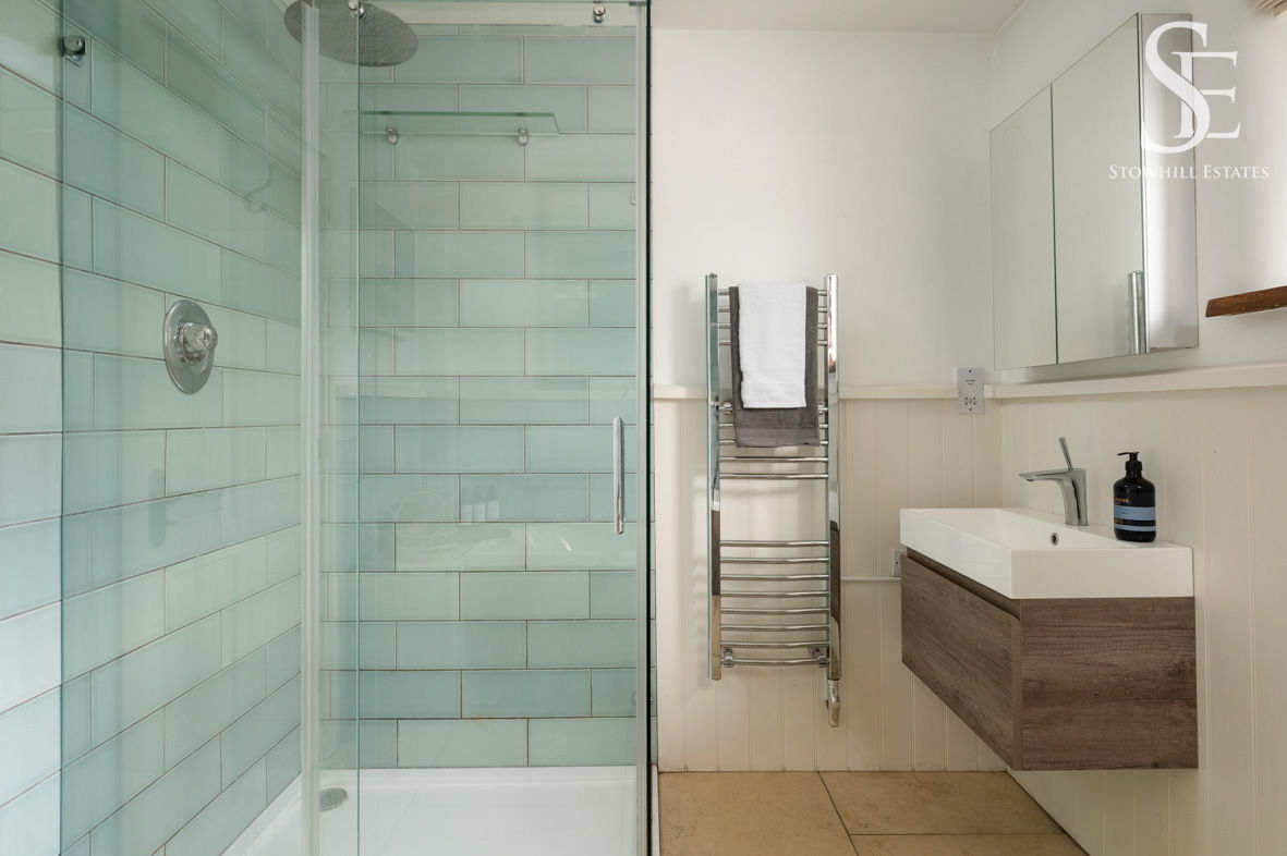 Freshen up in the bathroom to the right, which sits conveniently at the furthest end of the inner hallway, serving the bedrooms. Glazed, soft green tiles feature, behind the double-ended bathtub and in the separate shower cubicle for a stylish, spa-like finish.