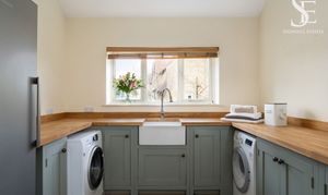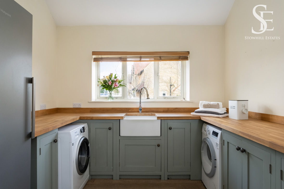 Ample space for shoes and boots can be found in the utility room to the left. Soft grey cabinetry topped in wooden worktops provides plenty of storage space, while a deep Belfast sink is ideal for scrubbing down walking boots and outerwear, with plumbing for a washer-dryer also in place.