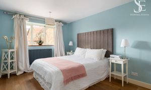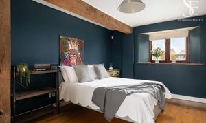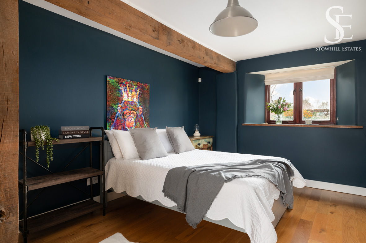 Next door, muted blue walls set a soothing mood in the third of the double bedrooms, where an exposed beam above the bed harmonises with wooden flooring underfoot. Mood lighting complements the soft natural light flowing in through the deep cottage style window overlooking the garden.