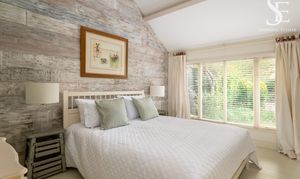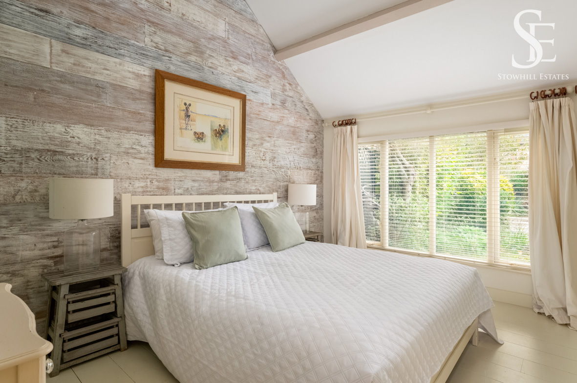 Sink into sleep in the quiet calm of the bedroom itself, where a textured stone, feature wall and double height sloping ceiling meet with a low cottage style window, framing views out over the garden.