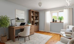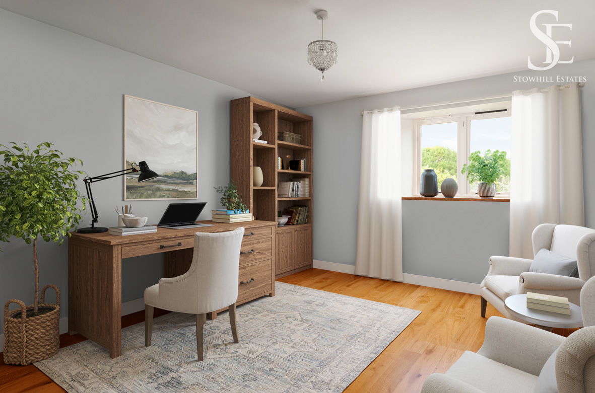 Returning to the hallway, a fourth double bedroom, dressed in earthy neutral tones for a serene feel, overlooks the garden to the front and is currently configured as a home office, highlighting the home’s flexibility.