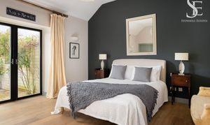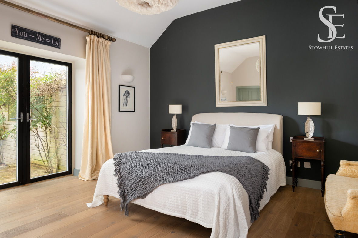 A richly toned feature wall creates an intimate, restful ambience, with wooden flooring underfoot once more beneath the high vaulted ceiling. French doors open directly to the garden, with a private and spacious en suite replete with walk-in, wet room shower, wall-mounted wash basin with vanity unit storage and WC.