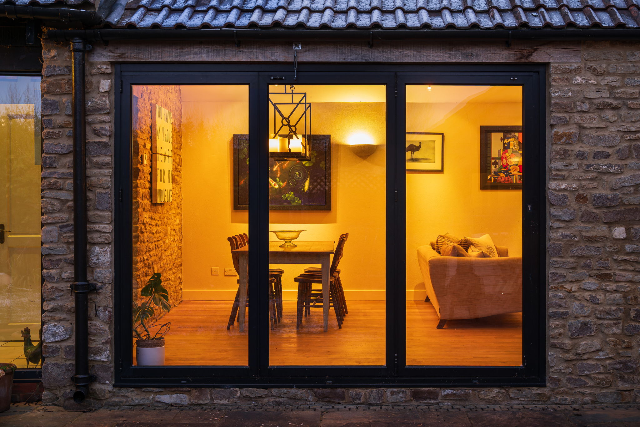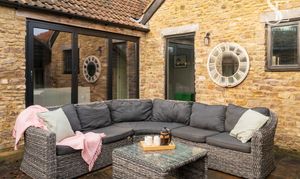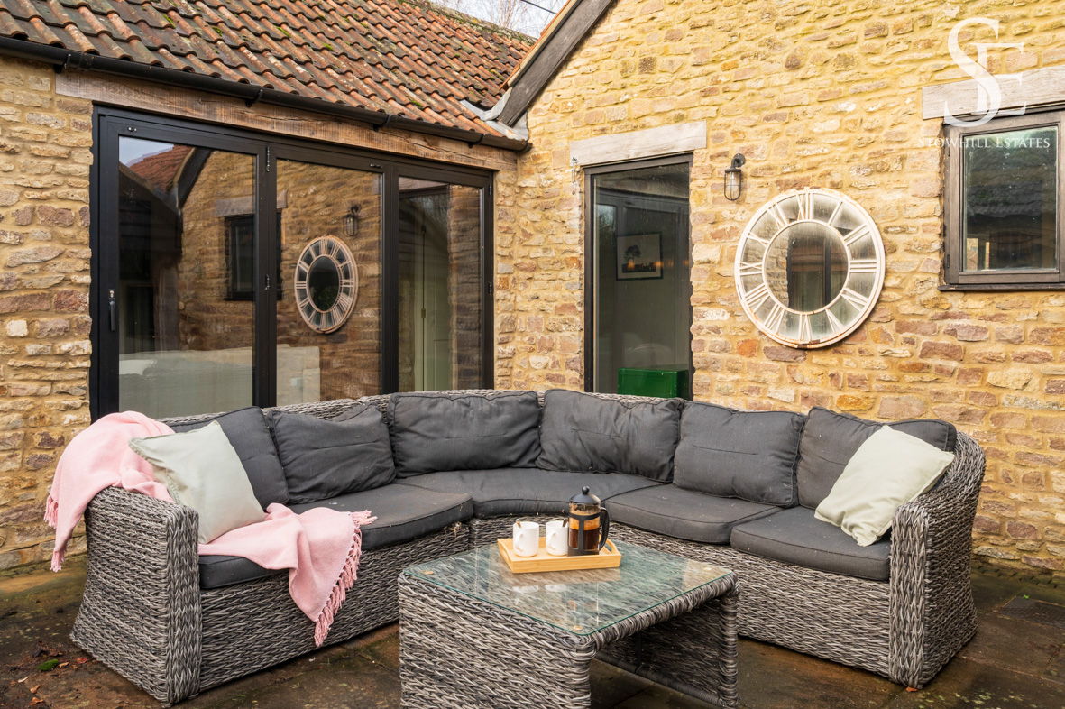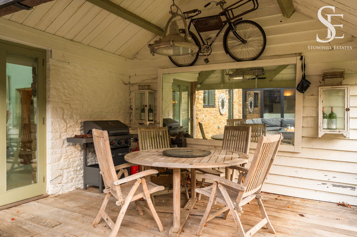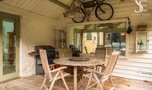 The garden at The Old Dairy is seamlessly arranged to mirror the easy, sociable flow of the home itself. Directly connected to the living spaces, a sheltered, decked seating area provides an inviting spot for outdoor dining, while further patio seating, lawn and established planting unfold beyond, offering both open space and pockets of privacy.