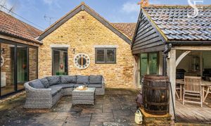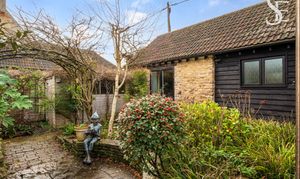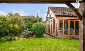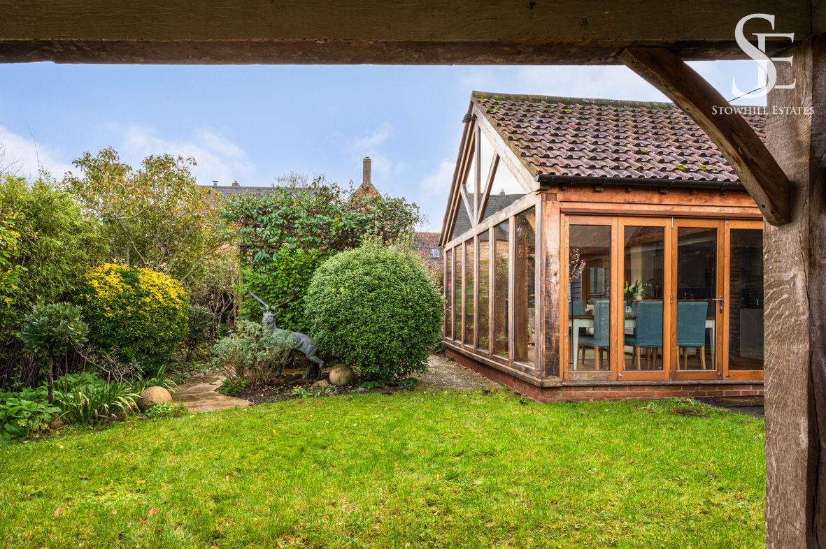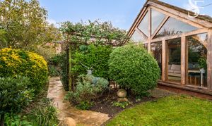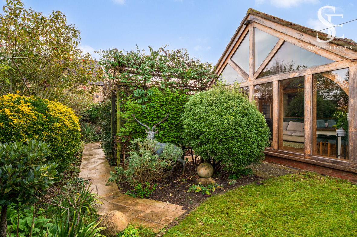 With multiple access points from the home, flow between indoors and out feels effortless, making the garden as well suited to relaxed everyday living as it is to hosting friends on long summer evenings. To the front, a timber-framed car port with adjacent storage sits discreetly alongside the approach, providing plenty of space for mowers and outdoor furniture.
