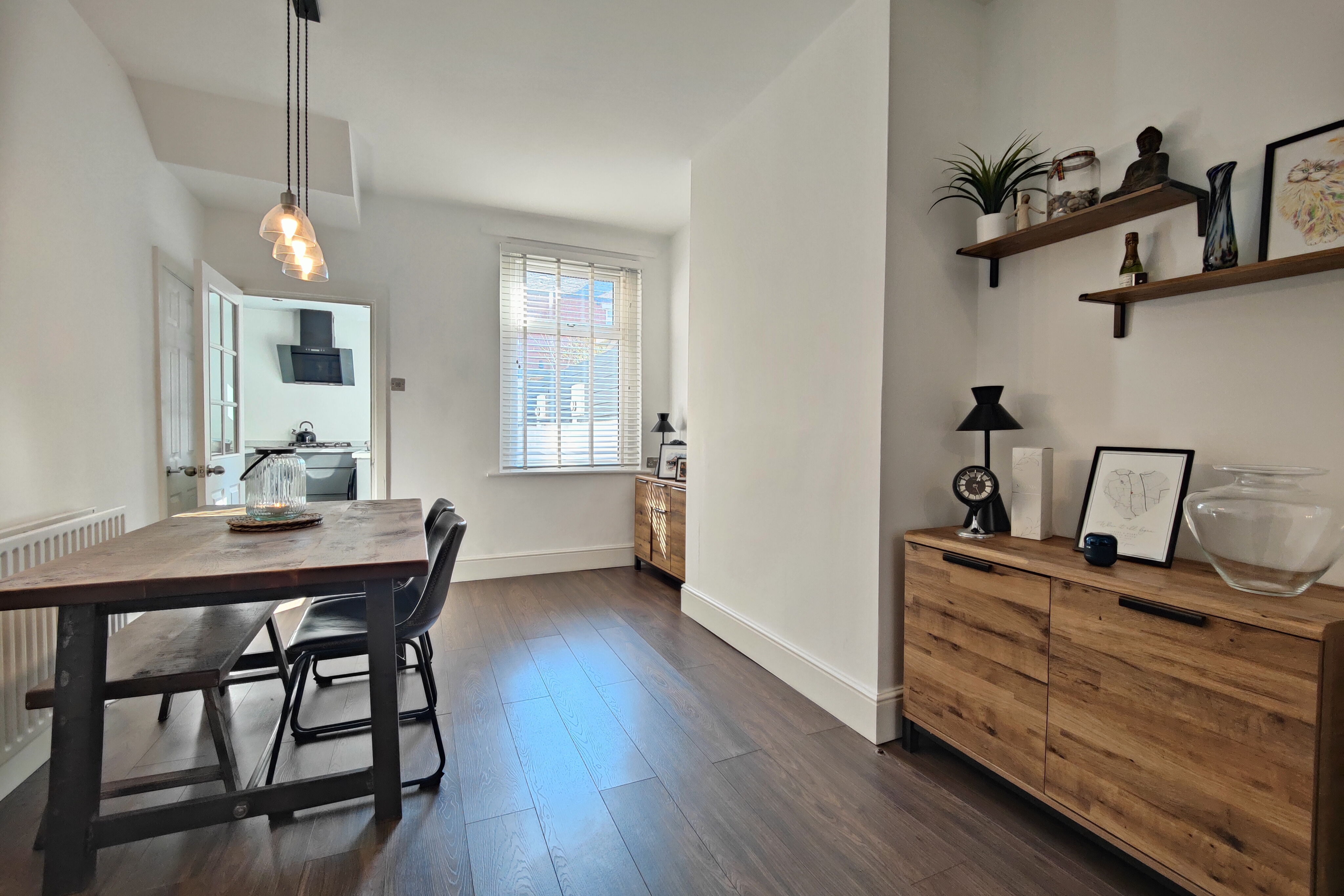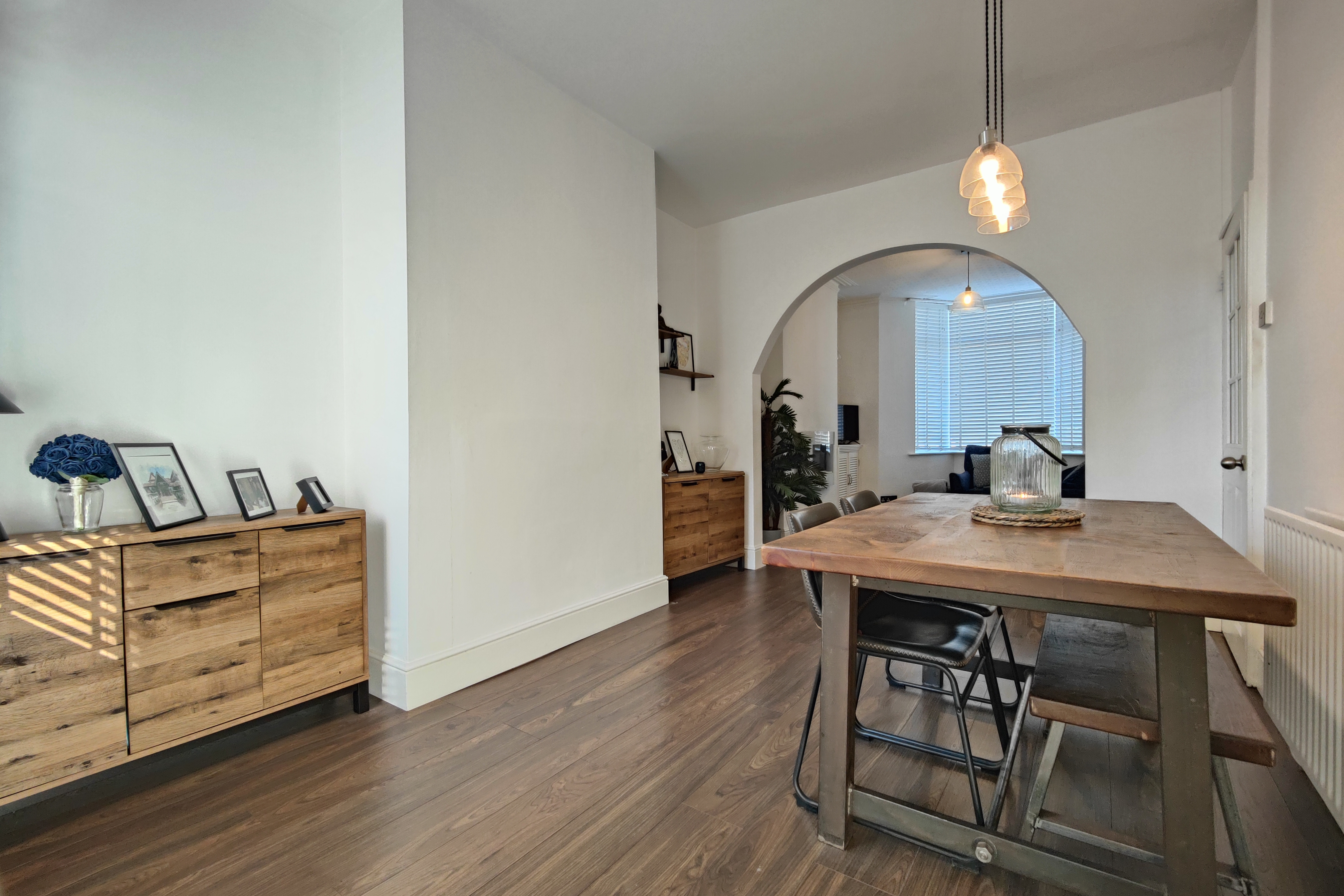 The smart front door opens to a welcoming hallway at this immaculate bay fronted home. Slate effect laminate flooring complements the fresh white décor and a door opens to a generous open plan living space. The lounge, dining room and kitchen flow beautifully with walnut effect laminate flooring and fresh light and grey décor. The bay front lounge area is to the front and has a focal point of a wall mounted, electric pebble flame effect fire. An archway connects lounge and dining areas. There is an under stair storage cupboard and a door with glazed panels opens to the kitchen. The kitchen has a grey theme and enjoys an integrated eye level oven and four ring gas hob. The double glazed back door opens to a sun trap garden. Upstairs are two generous bedrooms and a stylish four piece bathroom with corner shower enclosure, bath, wash basin and low flush WC.