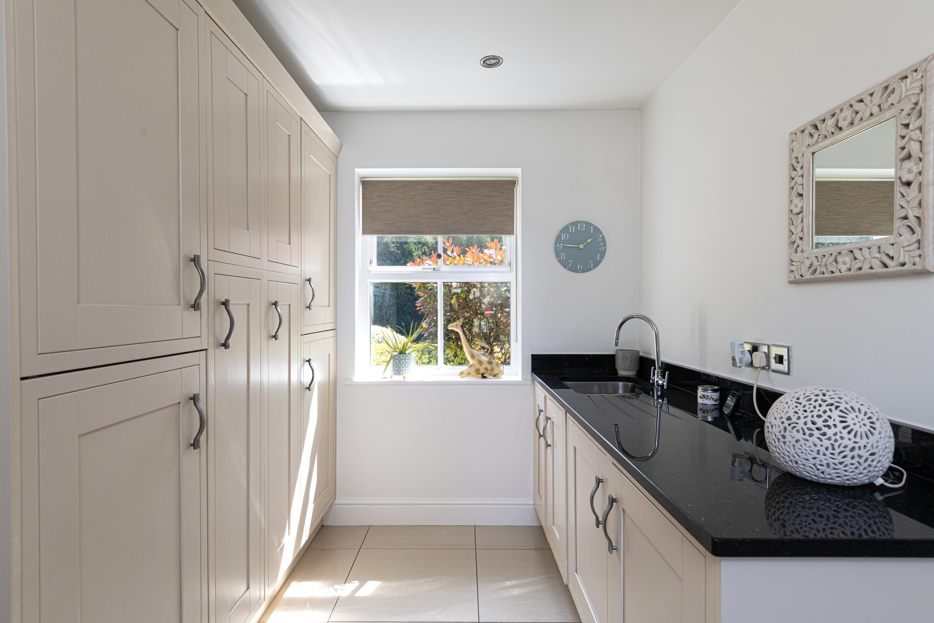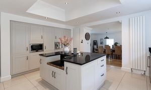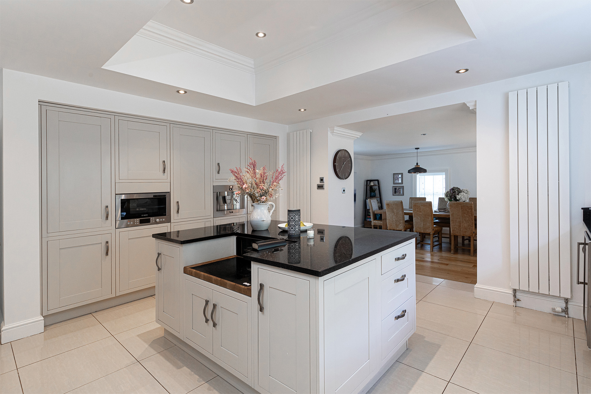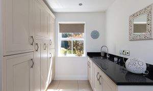The impressive kitchen with a central island includes a range-style cooker, integrated appliances, built-in coffee machine, microwave, fridge freezer, and wine cooler. The open-plan kitchen leads into a superb triple-aspect dining area suitable for entertaining guests and provides access to an enclosed patio area. Additional space for appliances is available in the utility room, which is accessible from the kitchen and fitted with modern units incorporating a sink and drainer. The ground floor cloakroom includes a WC and heated towel rail.