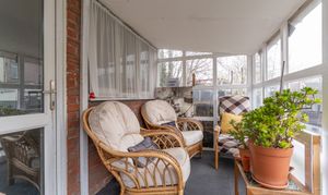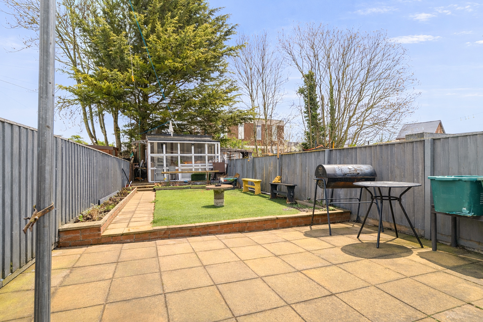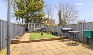 To the rear of the property is a large garden, featuring a combination of patio and lawn areas, providing plenty of space for outdoor seating, entertaining or gardening.
