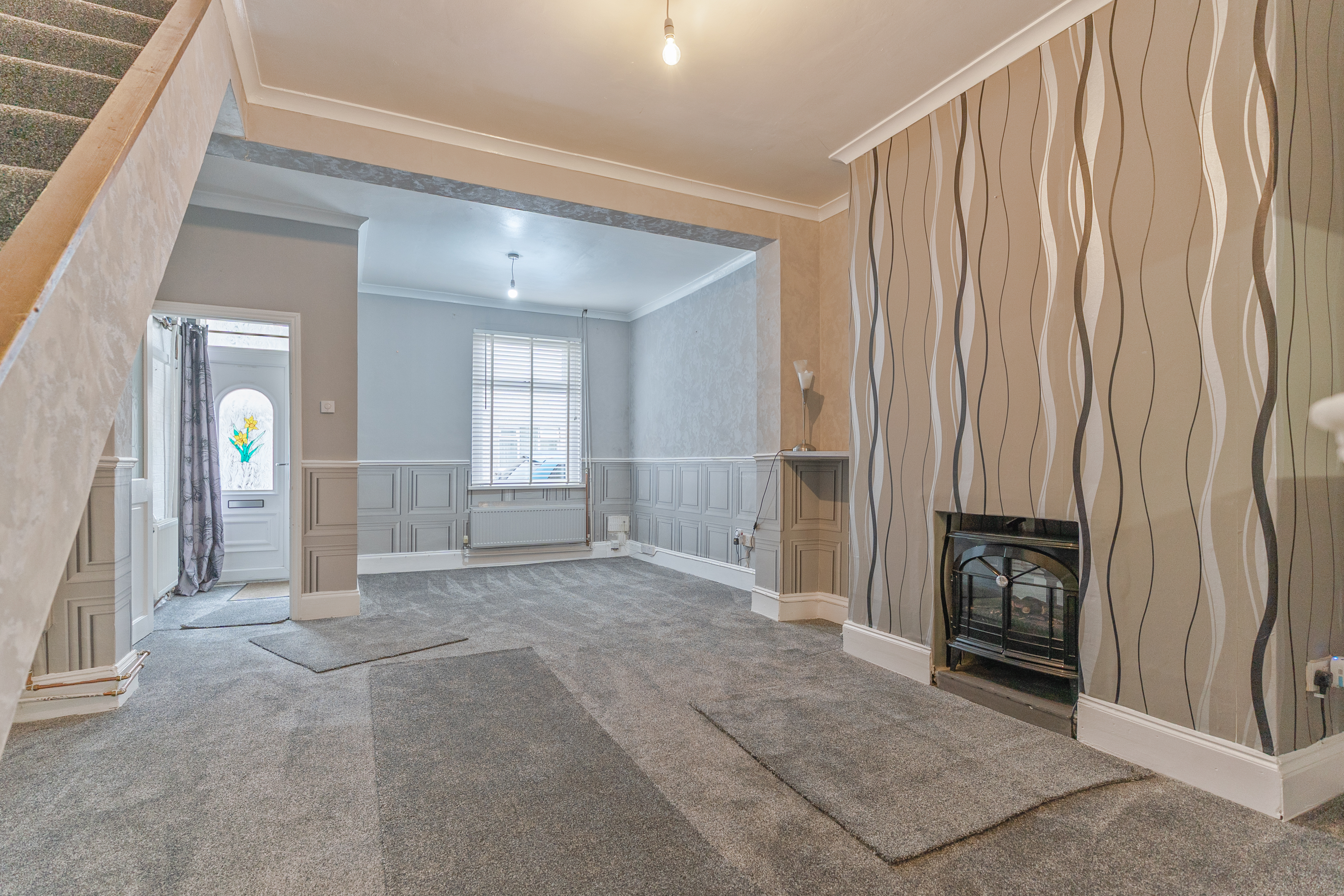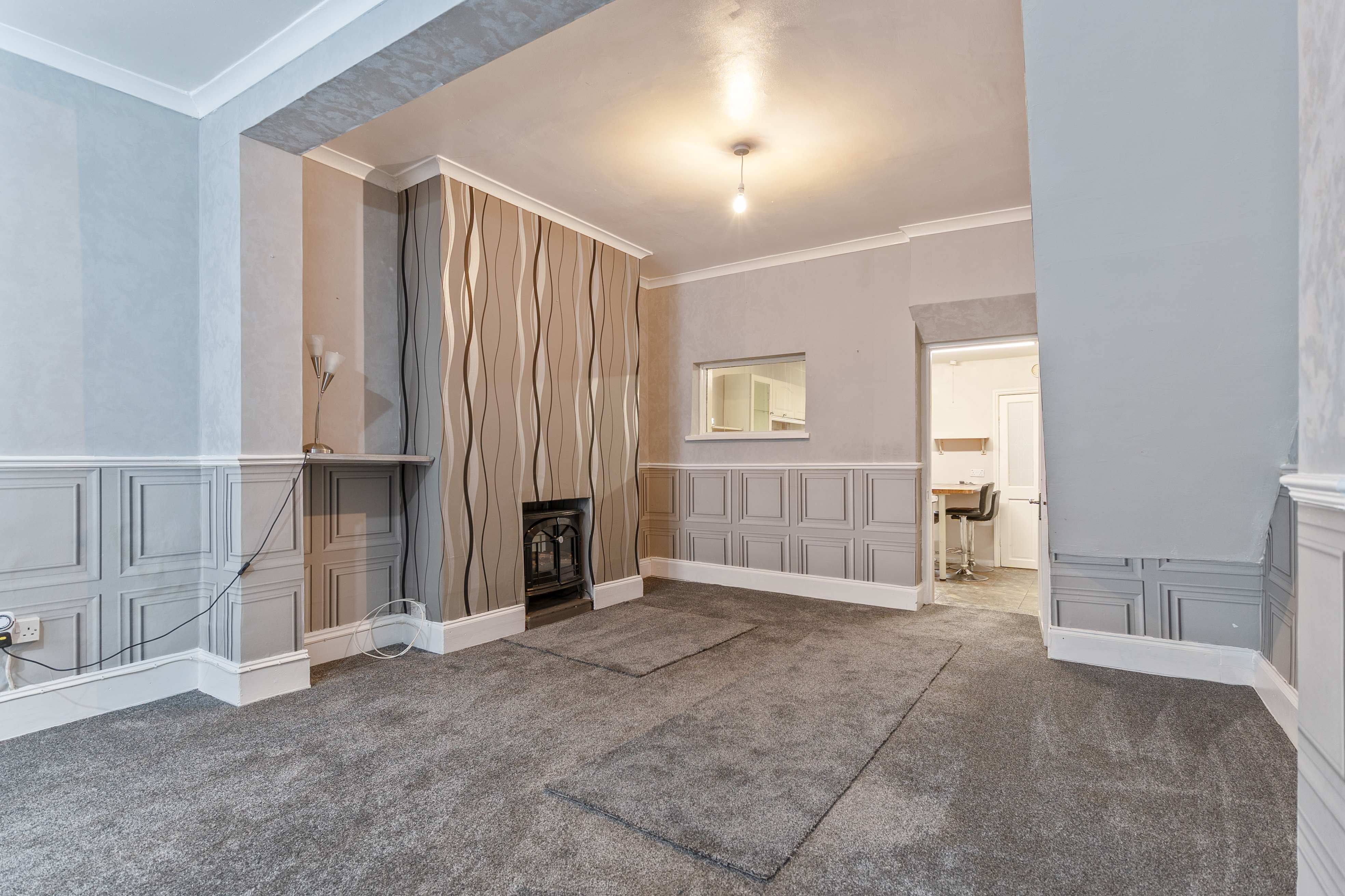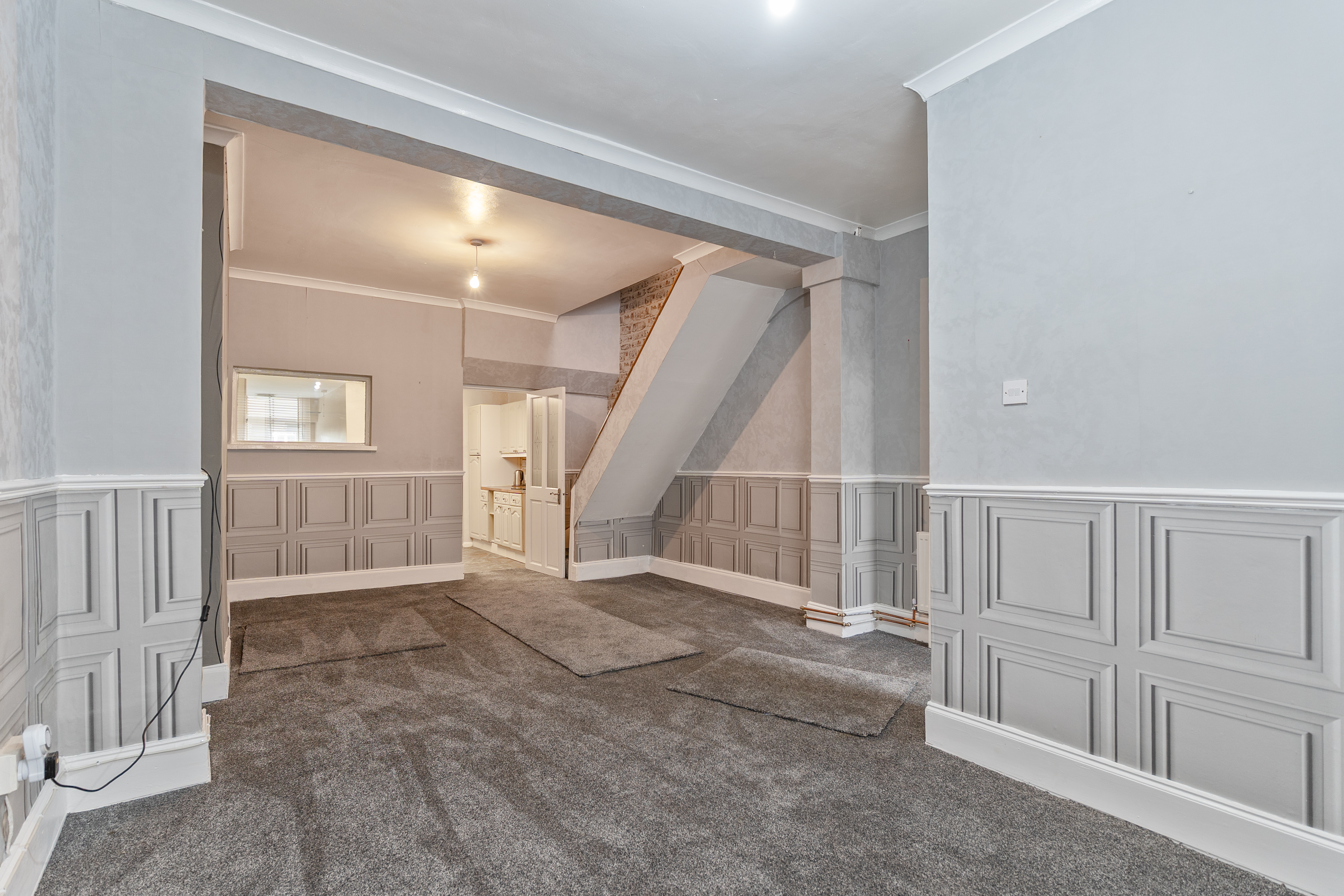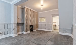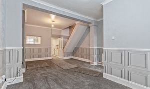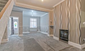 You enter the property into an initial hallway, which leads through to the main living area. The ground floor features an open plan lounge and dining room, characterised by tall ceilings and offering a spacious and versatile layout. This area also provides access to the staircase leading to the first floor and through to the kitchen, which offers ample storage and workspace. The kitchen benefits from patio doors opening out to the rear garden and also provides access to the ground floor bathroom.