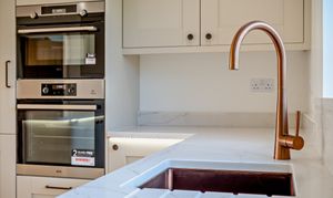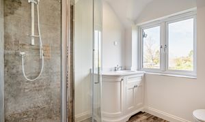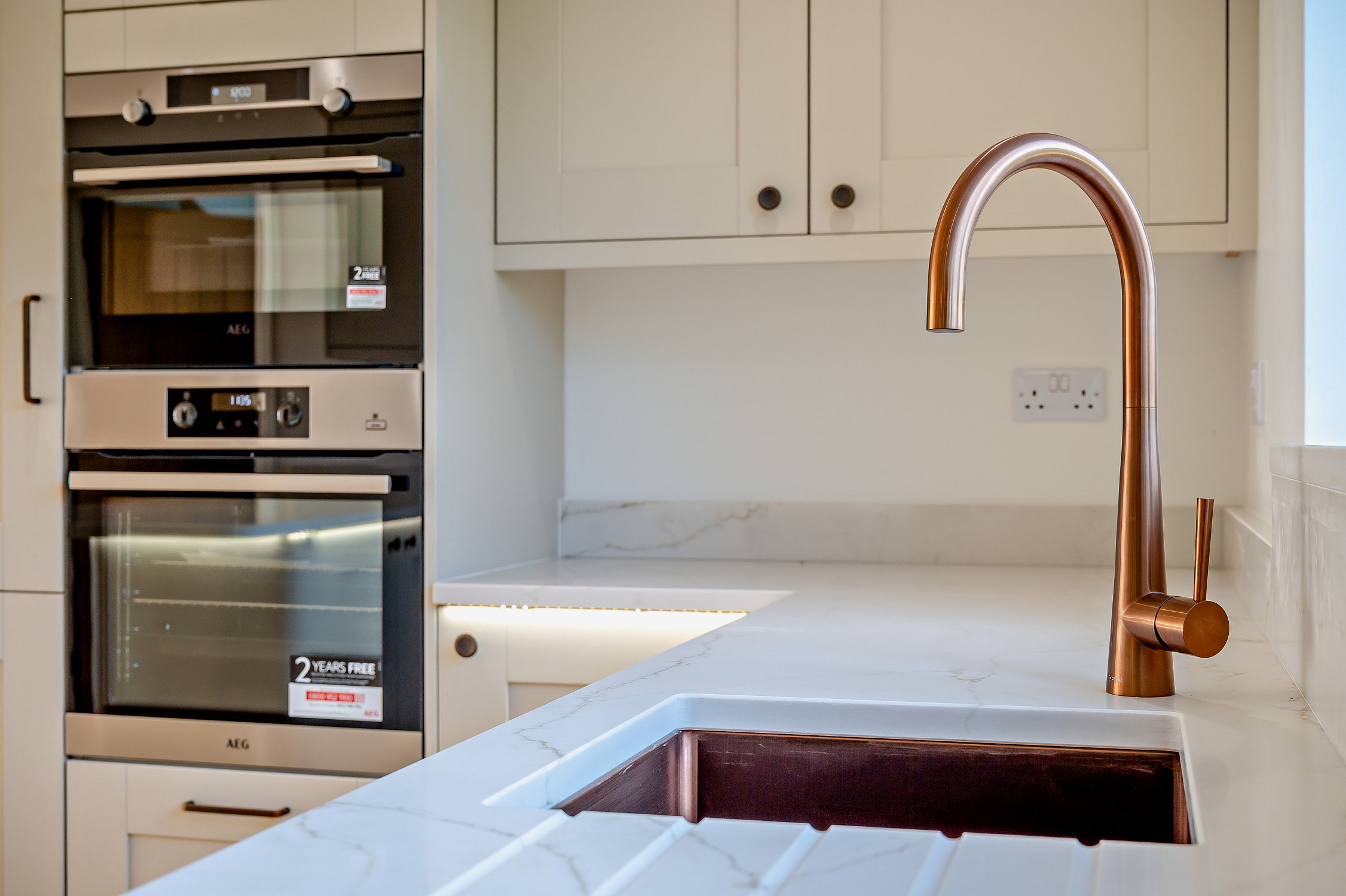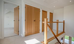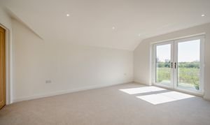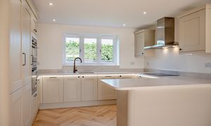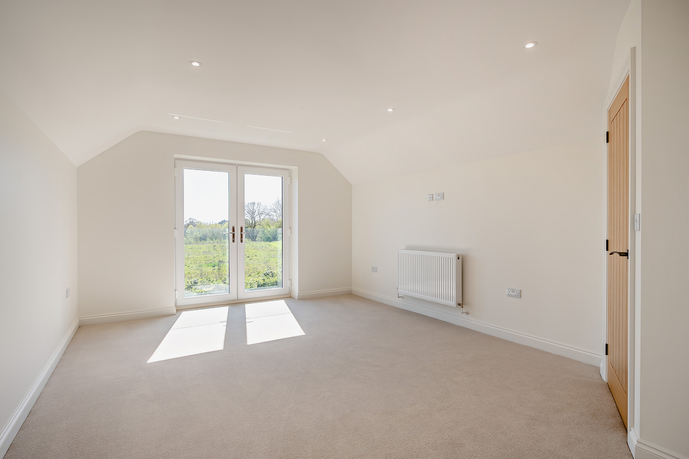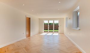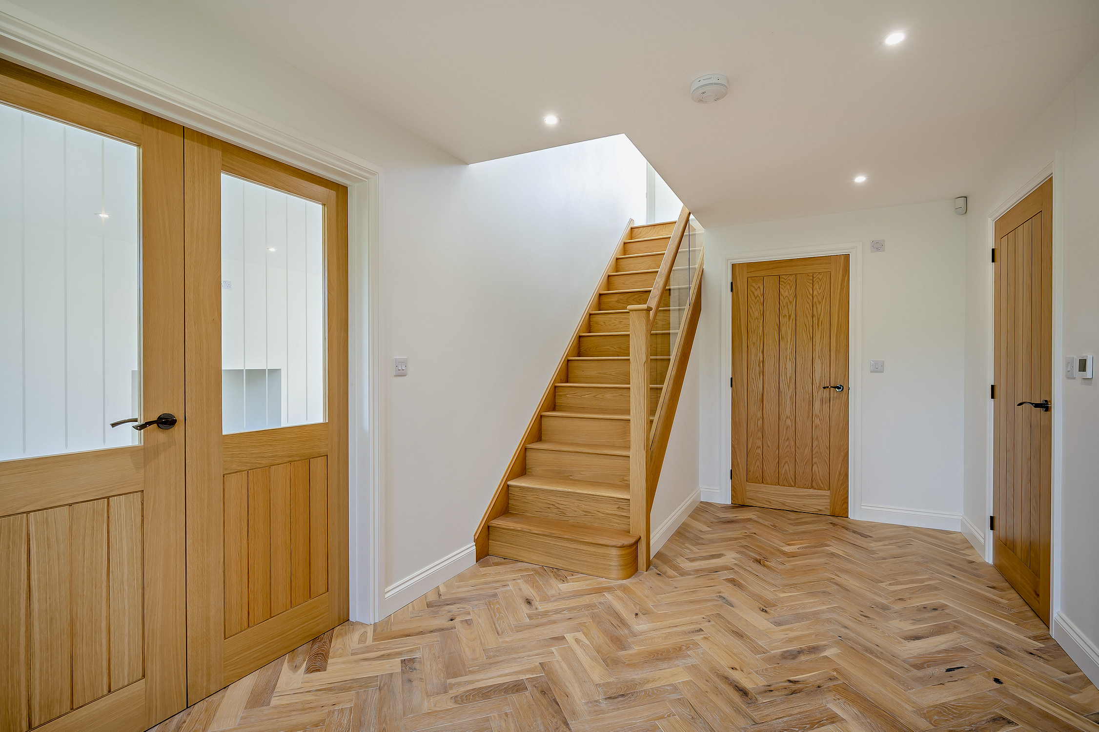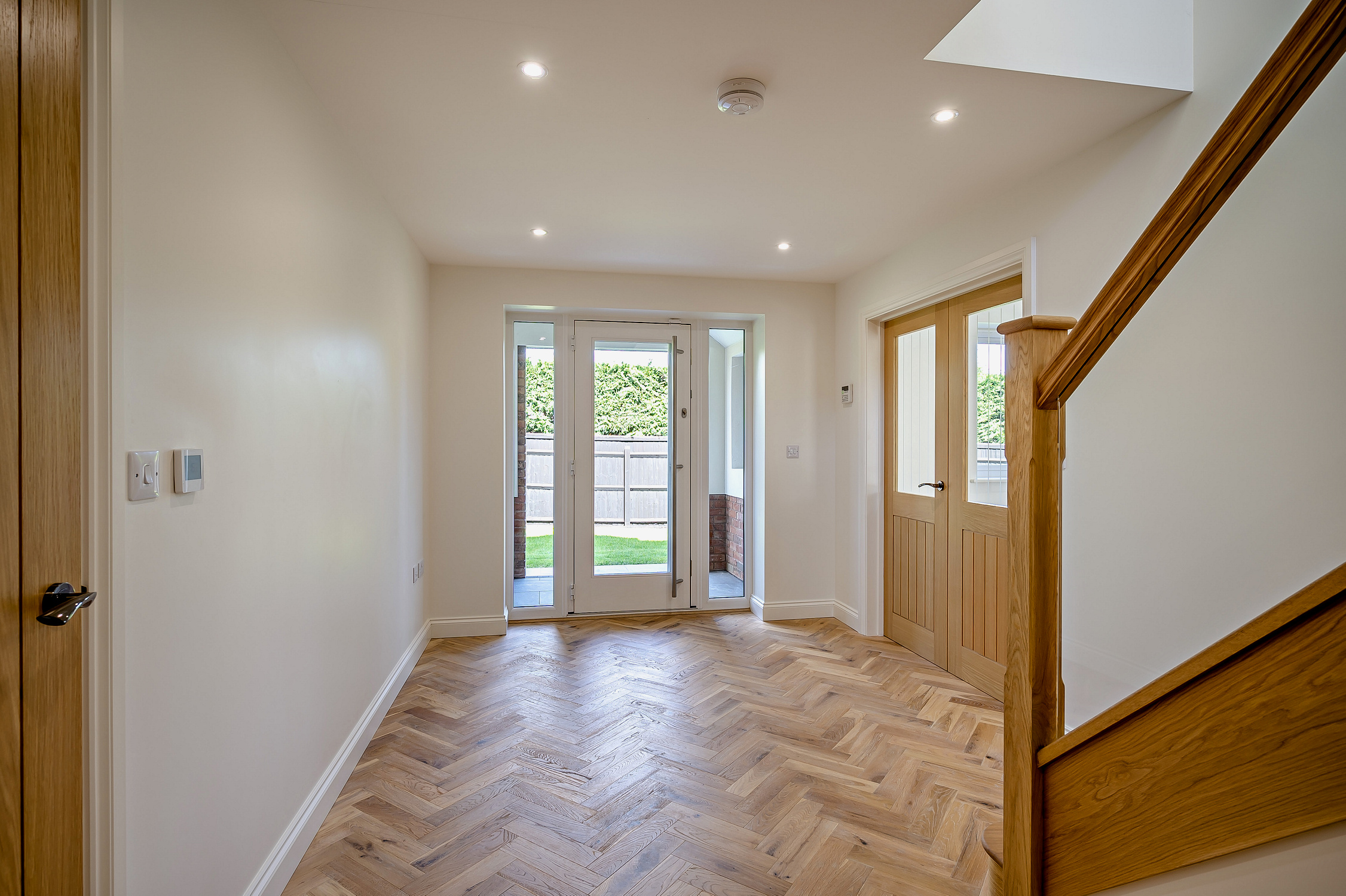 Inside, the accommodation is generous, well‑balanced, and finished to an exacting standard. The ground floor flows beautifully, with herringbone oak flooring enhancing the principal spaces and reinforcing the home’s quiet sense of quality. Four double bedrooms are complemented by three en‑suite bathrooms, creating a layout that works equally well for family life and hosting. Two of the bedrooms benefit from glass Juliette balconies overlooking the rear garden.