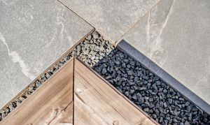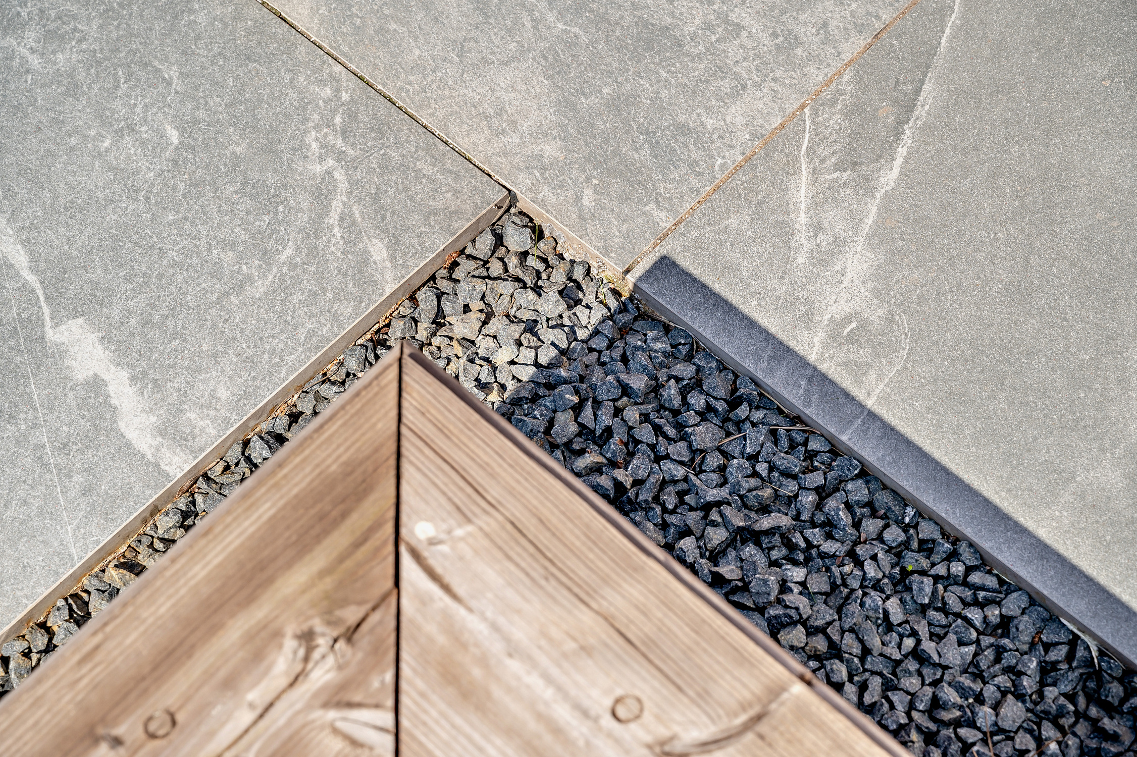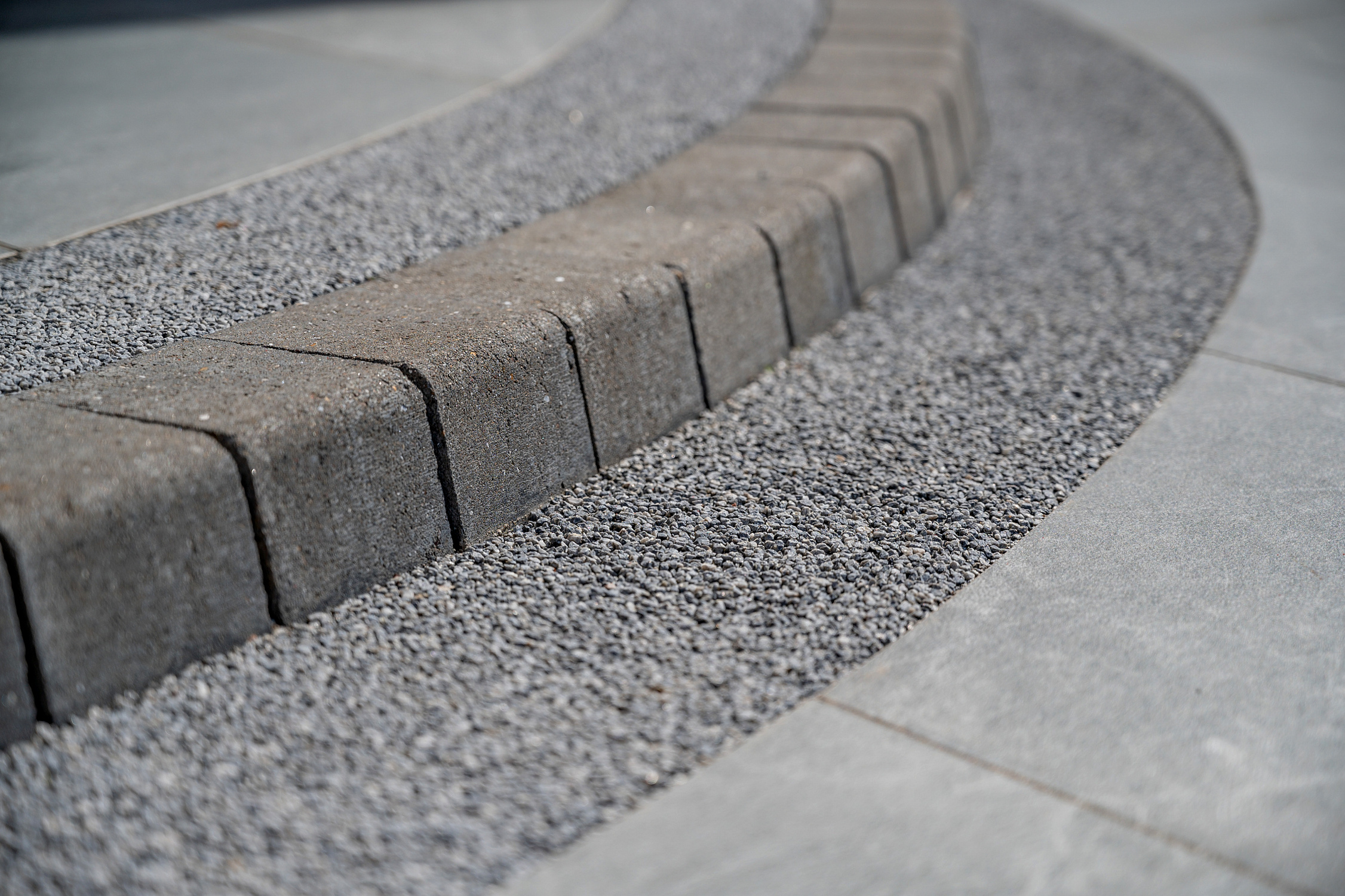 - Elegant external landscaping featuring porcelain terraces with resin‑set gravel edging, curved steps and integrated lighting