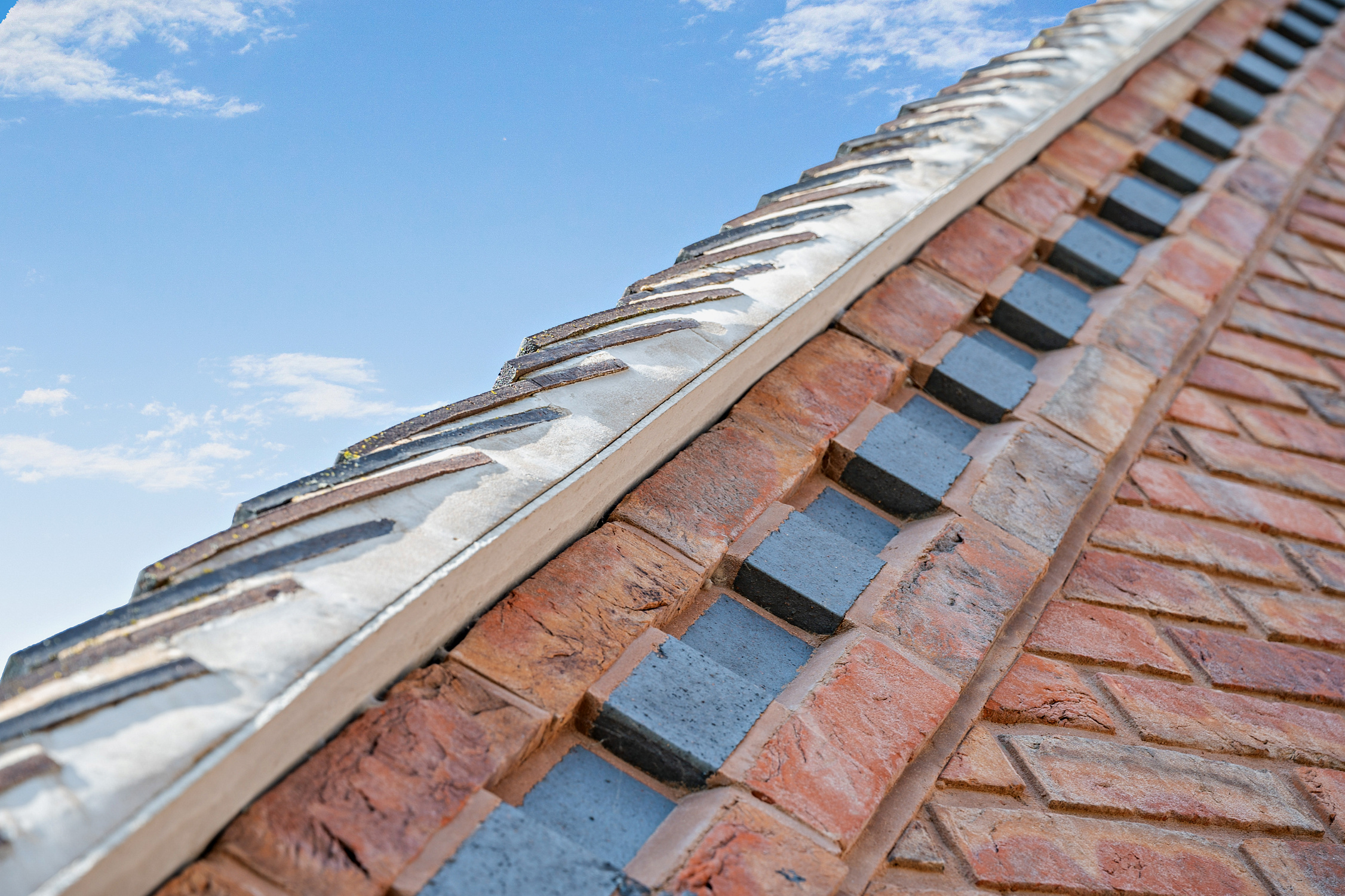 - Distinctive architectural roof design with intricate detailing and diamond‑pattern tiled finis