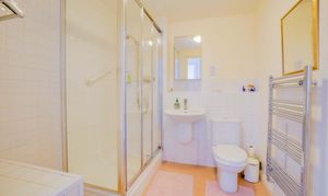 With a shower cubicle with a shower head over, wash hand basin, WC, storage cupboard, partly tiled walls, vinyl flooring, a heated chrome towel rail.