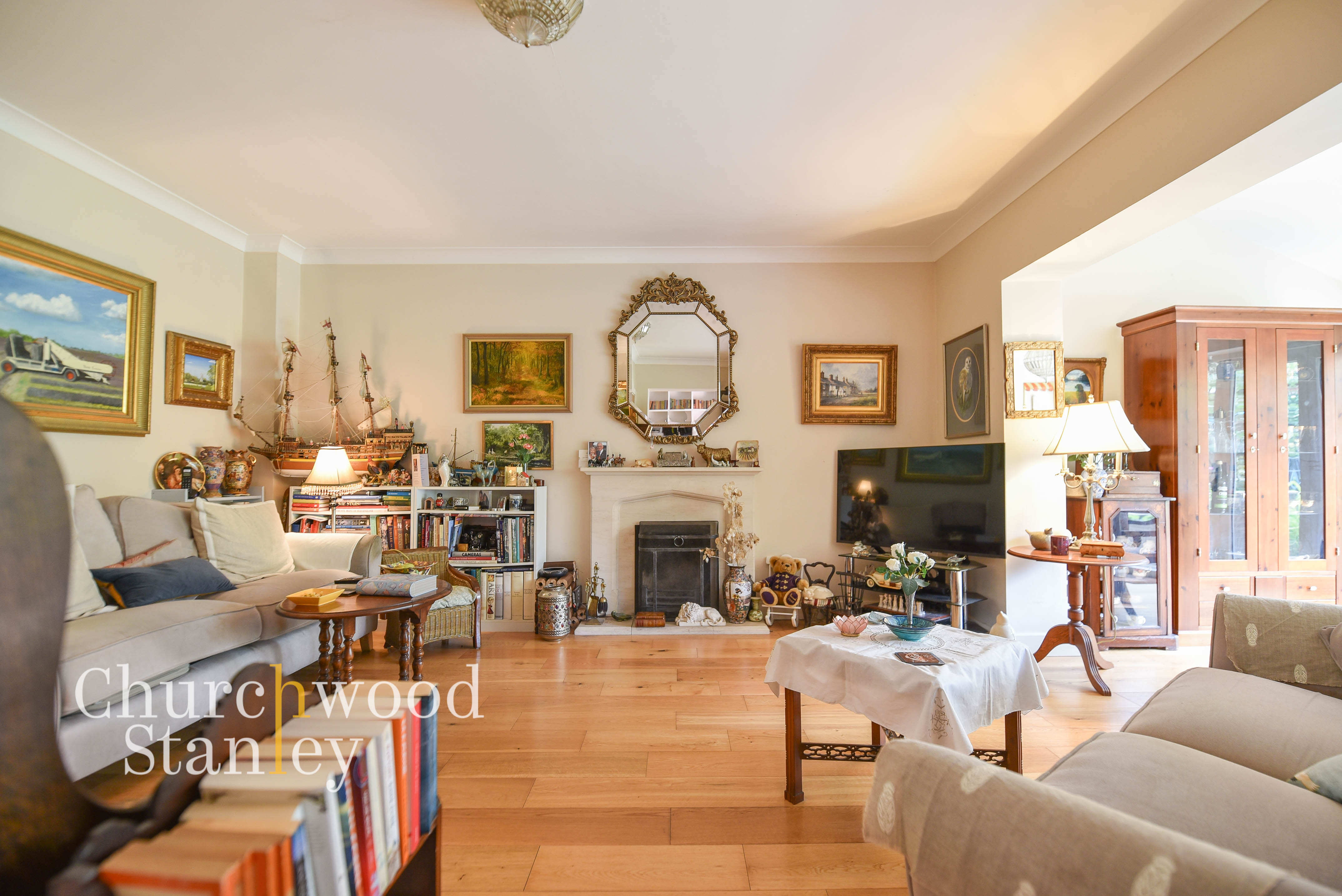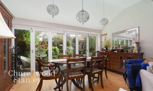 A wonderfully proportioned and inviting space, thoughtfully designed for both relaxation and entertaining found centrally, offering an excellent sense of flow with its open connection to the adjoining dining area and study. Natural light floods through the wide rear glazing, giving the room a bright, uplifting atmosphere while framing garden views. A central feature fireplace provides a warm focal point, perfectly complemented by the soft neutral décor and quality solid wood flooring that adds a natural elegance underfoot. The generous floor area allows for multiple seating configurations, easily accommodating both a formal sitting area and a casual reading or family zone. This space strikes an ideal balance between cosiness and openness. Whether used for quiet evenings by the fire or lively gatherings with friends and family, the living room is a versatile heart of the home that captures both comfort and charm.