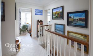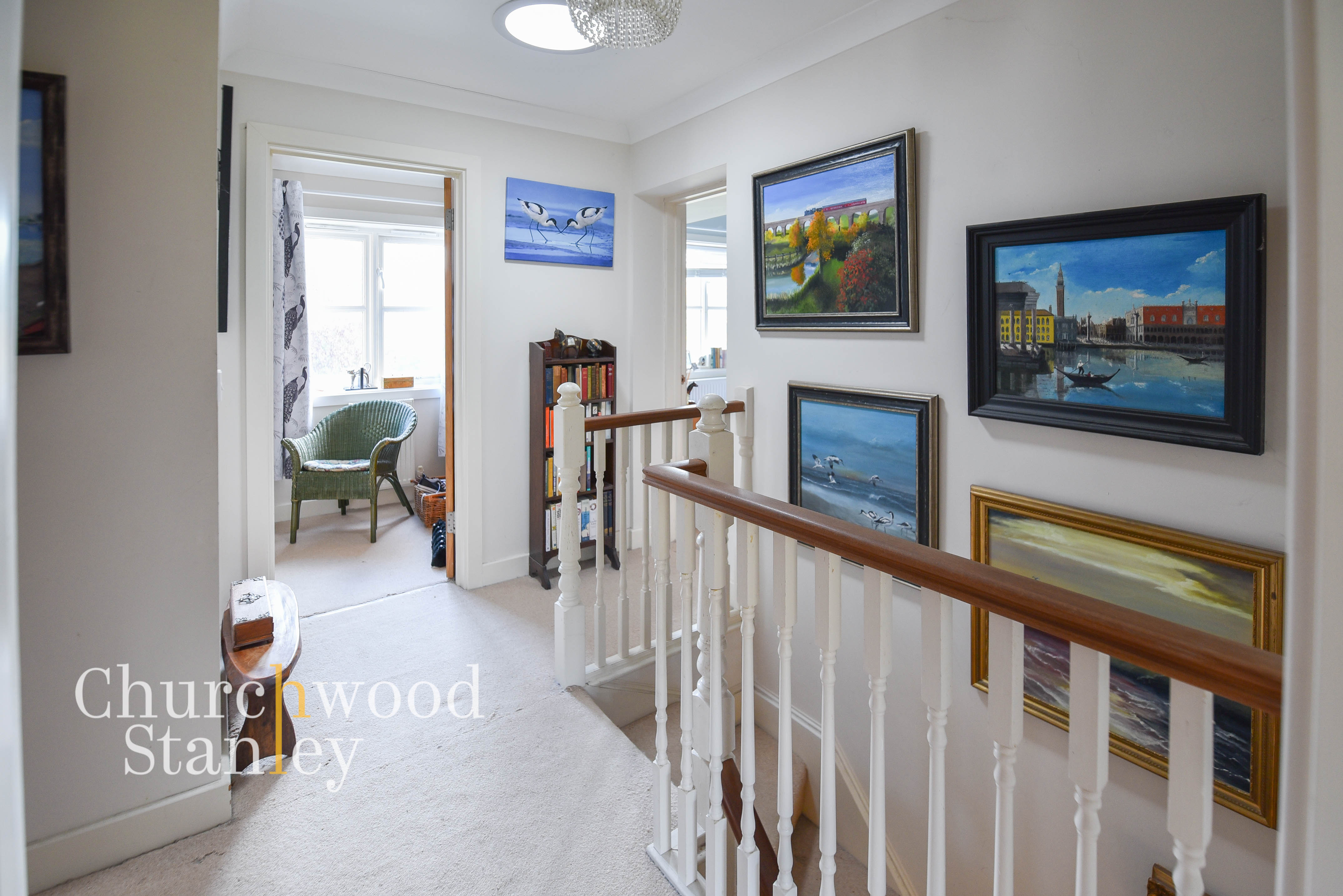 Upstairs, the landing is bright and airy, with a sun tunnel drawing in extra light and a white balustrade adding a touch of elegance.