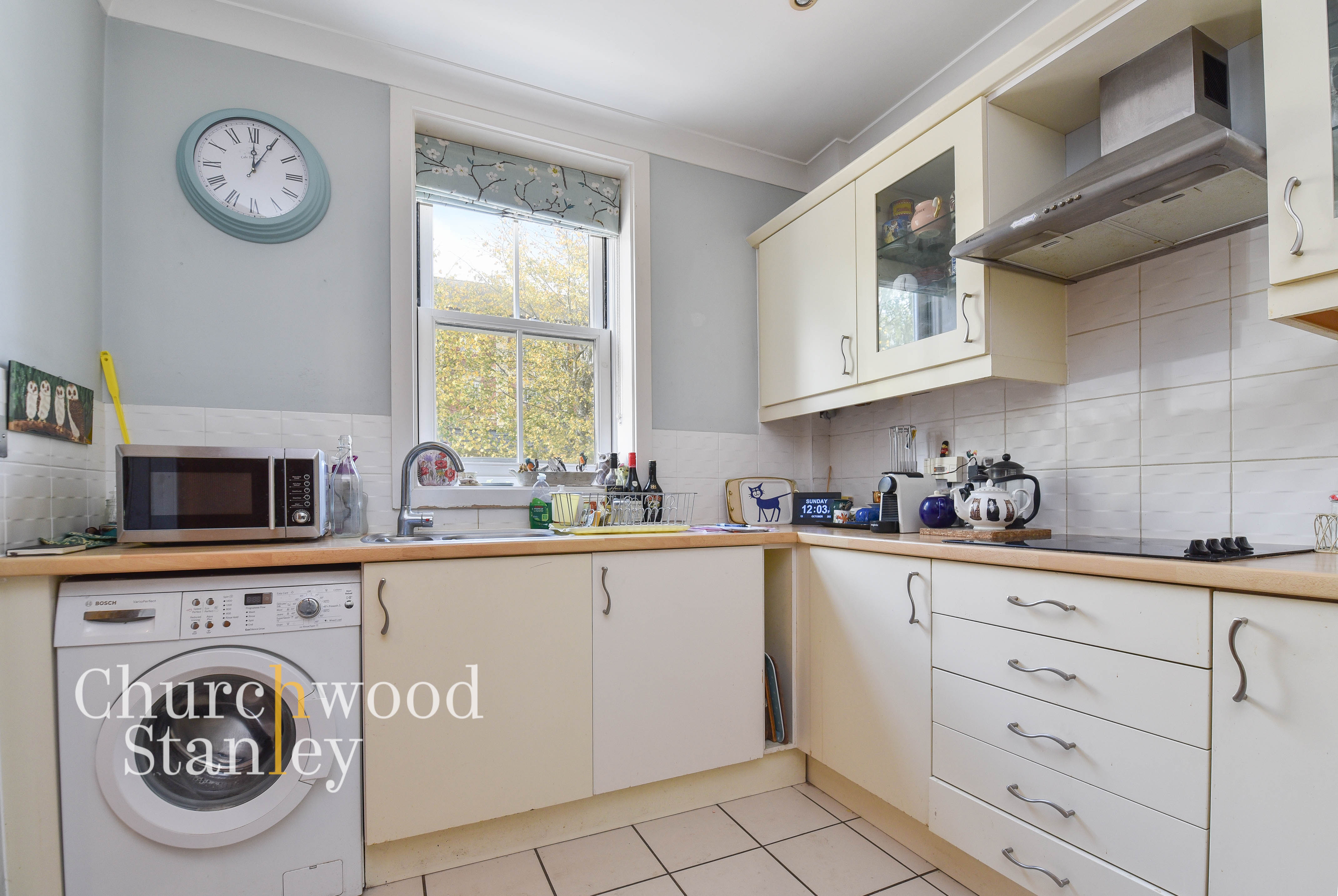 The kitchen is a bright and well-planned space designed for practicality. Set to the front of the home, it features a generous range of cream shaker-style cabinets complemented by modern brushed steel handles and tiled splashbacks for easy maintenance. The worktops offer great preparation space, and the layout allows for an efficient workflow between the sink, hob, and preparation areas. Available beneath the counter is a plumbing for a washing machine, while space is provided for a freestanding fridge and additional appliances. A built-in electric hob and stainless steel extractor hood sit neatly within the cabinetry, giving the kitchen a tidy, cohesive appearance. Natural light streams through the sash-style front window, highlighting the soft grey and neutral colour palette that keeps the room feeling fresh and inviting. Tiled flooring ensures durability and easy cleaning, making this a practical everyday kitchen well suited to family living or entertaining.