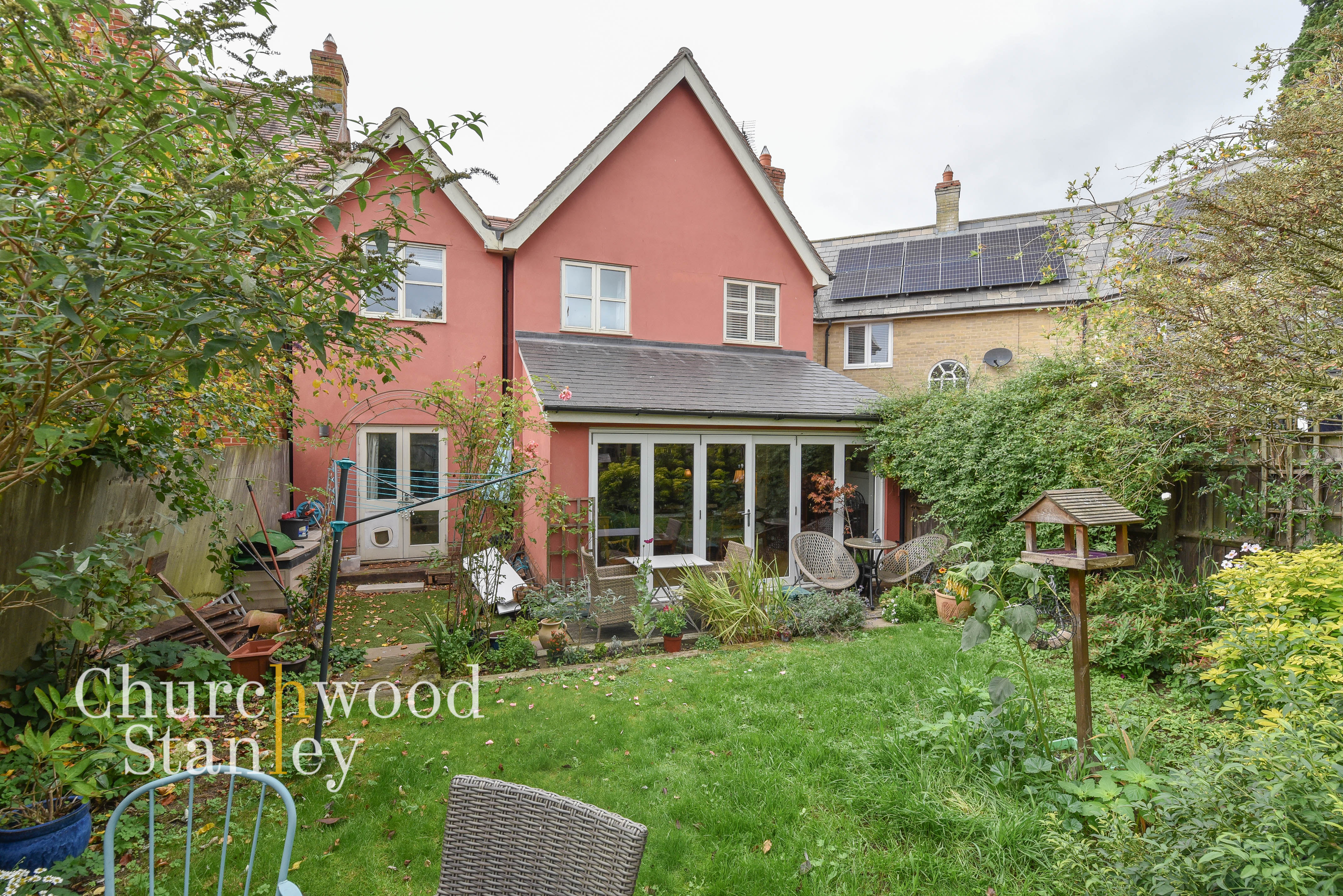 The rear garden is a delightful, secluded space, mature planting and well-established borders bring year-round colour, while two distinct seating areas provide ideal spots for morning coffee or evening dining. A lawn sits at the centre, framed by greenery and dotted with shrubs and seasonal flowers, making this a genuinely tranquil extension of the home.
