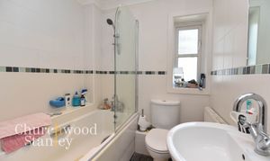 The family bathroom is neatly presented with a white suite comprising a panelled bath with glass shower screen, pedestal basin, and close-coupled WC. A slim border of mosaic tiles adds a touch of colour to the otherwise clean, bright walls. Natural light filters in through a frosted window, creating a fresh and practical space ideal for everyday use.