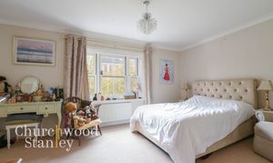 The main bedroom, positioned to the front, is notably spacious with two sash windows, twin fitted wardrobes and a calm, restful feel. It benefits from its own en suite shower room, fully tiled and complete with a corner shower, pedestal basin, and concealed-cistern WC, a smart, practical space finished in soft neutral tones.