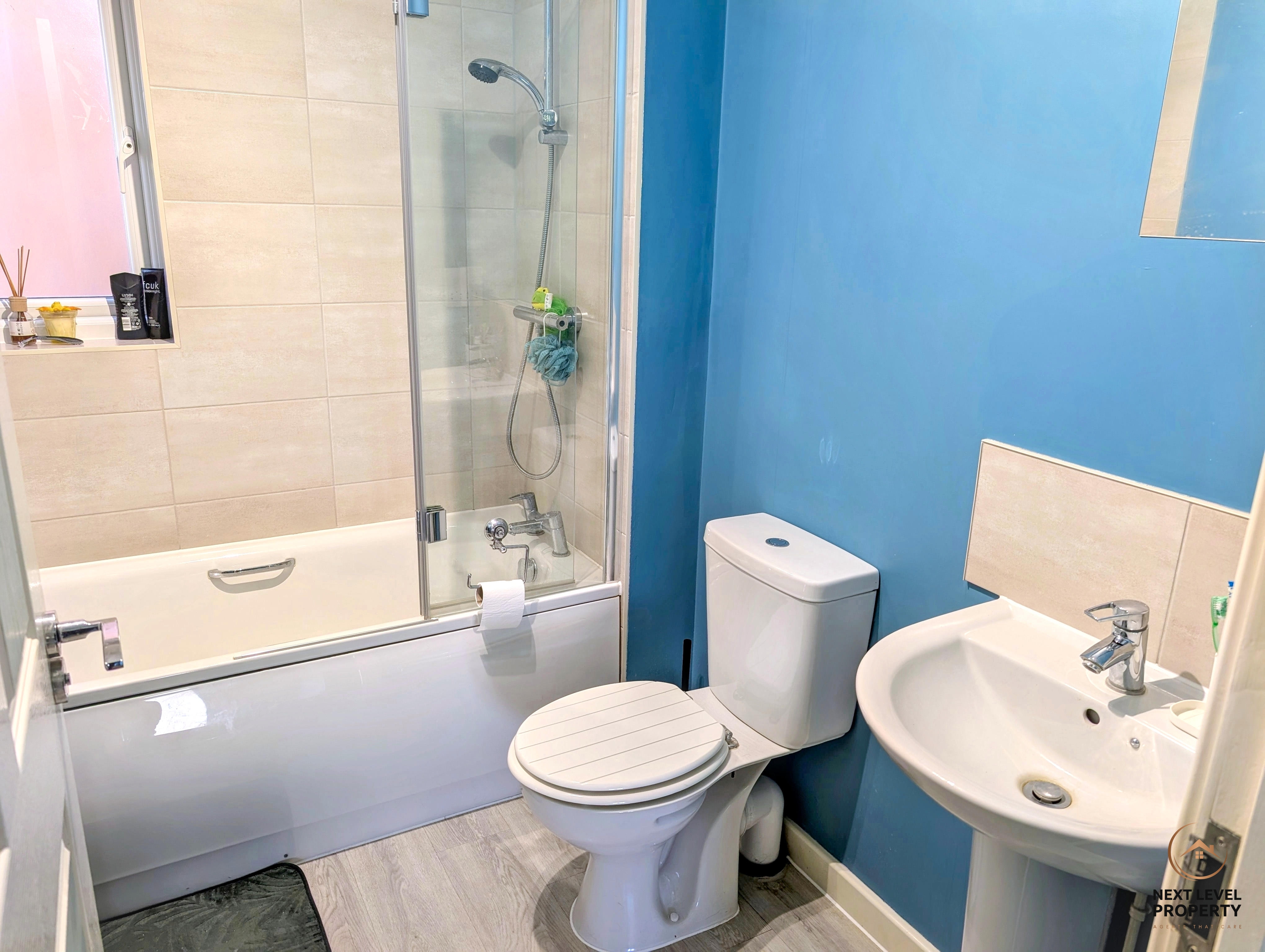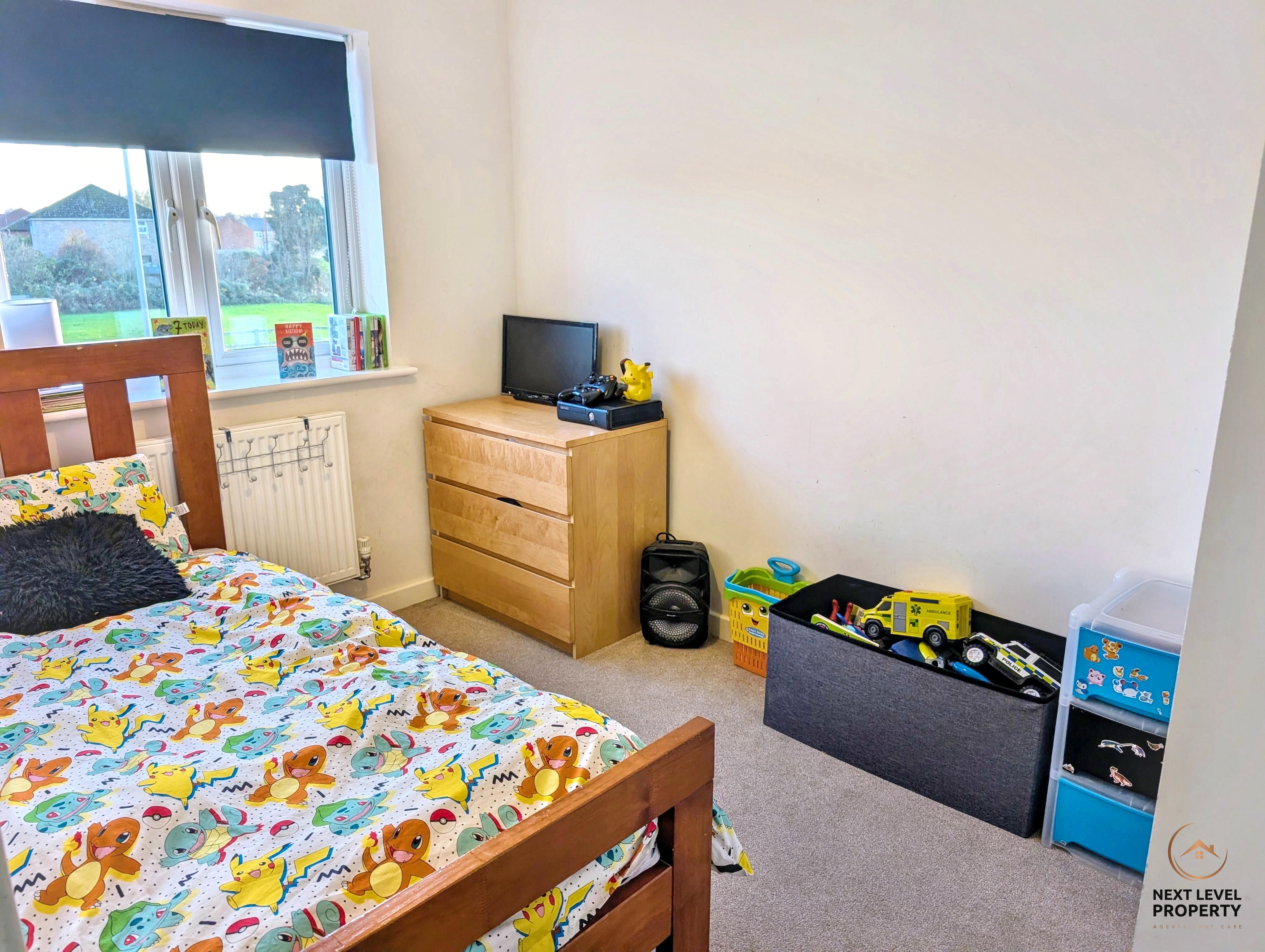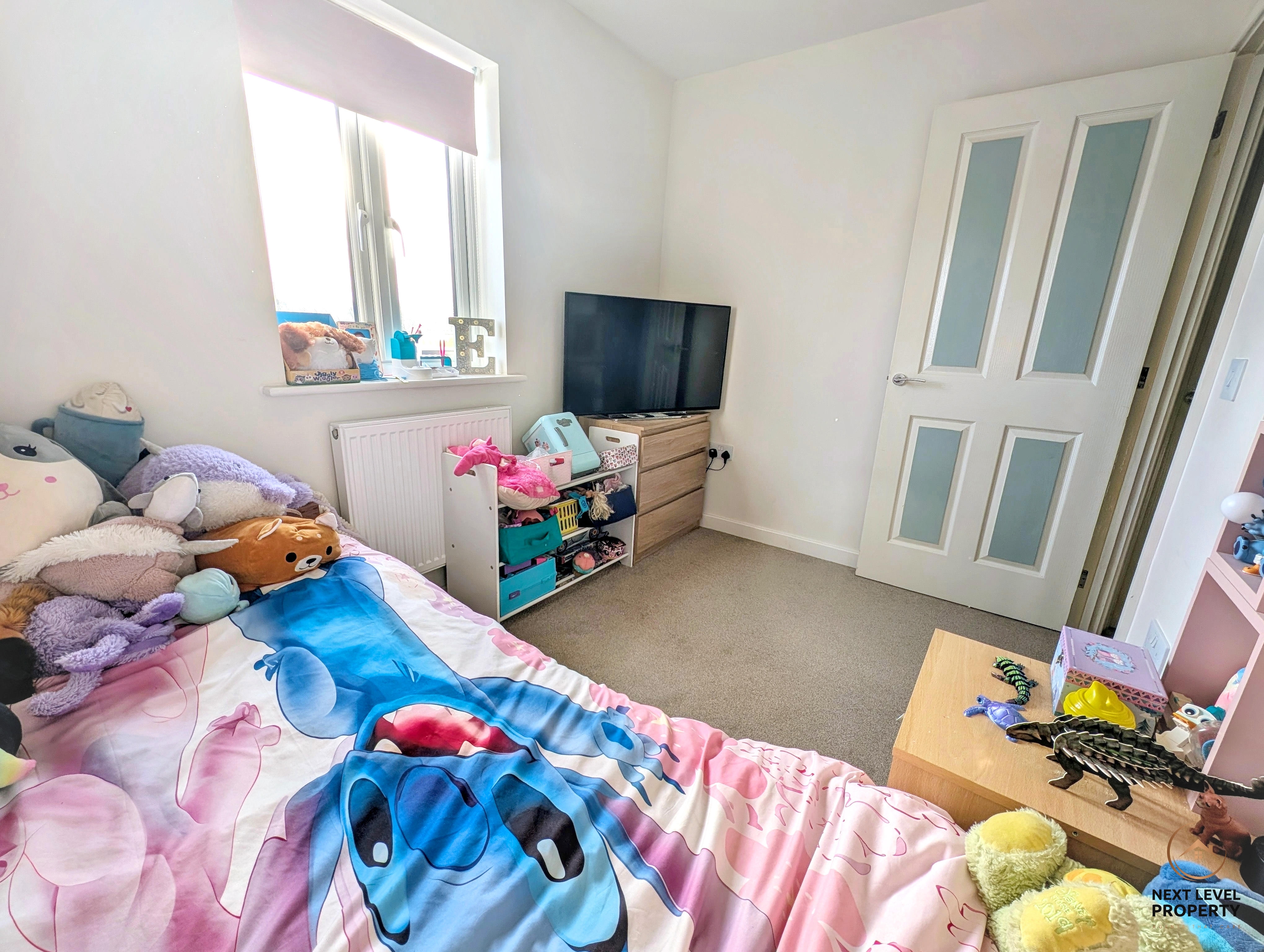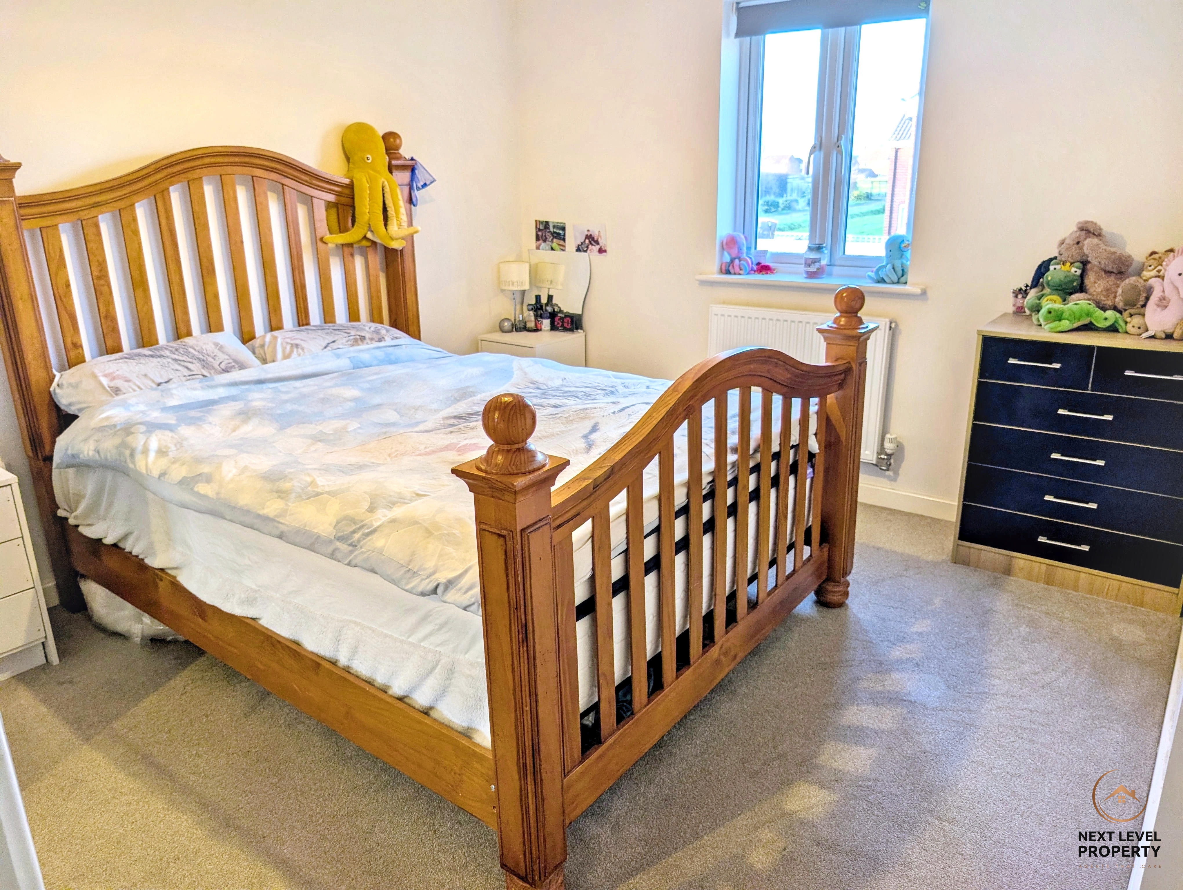 The principal bedroom overlooks the rear garden and offers ample space for a king-size bed along with wardrobes, drawers and bedside furniture. Bedroom two is another good-sized double room, also overlooking the garden. Bedroom three enjoys views across the playing field and towards the three allocated parking bays. Bedroom four is the smallest of the four, yet still a comfortable single room with space for a bed and additional furniture.