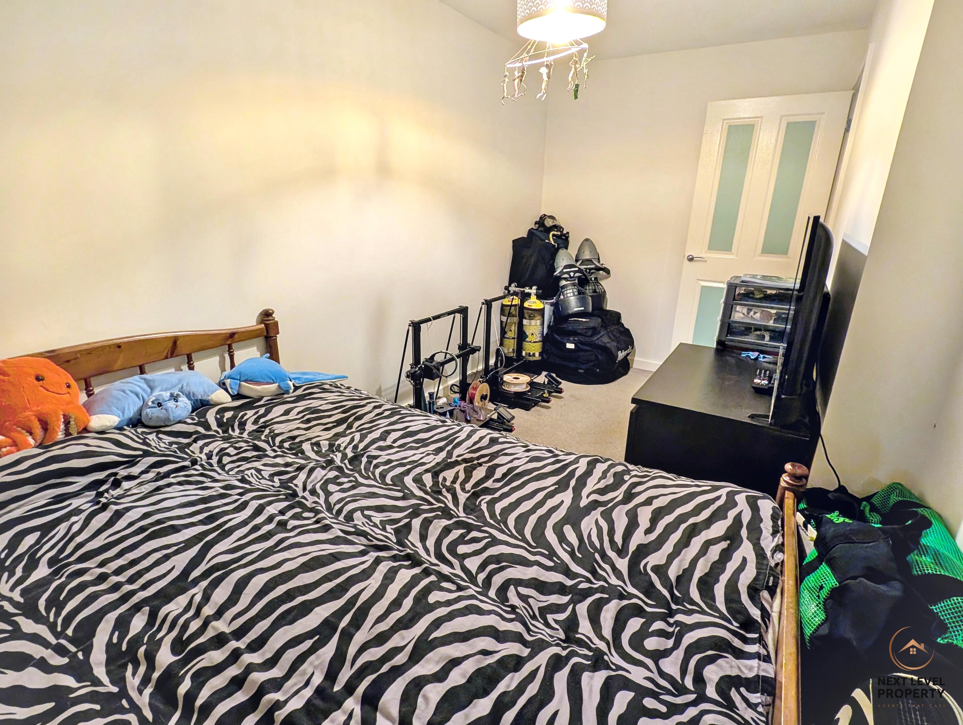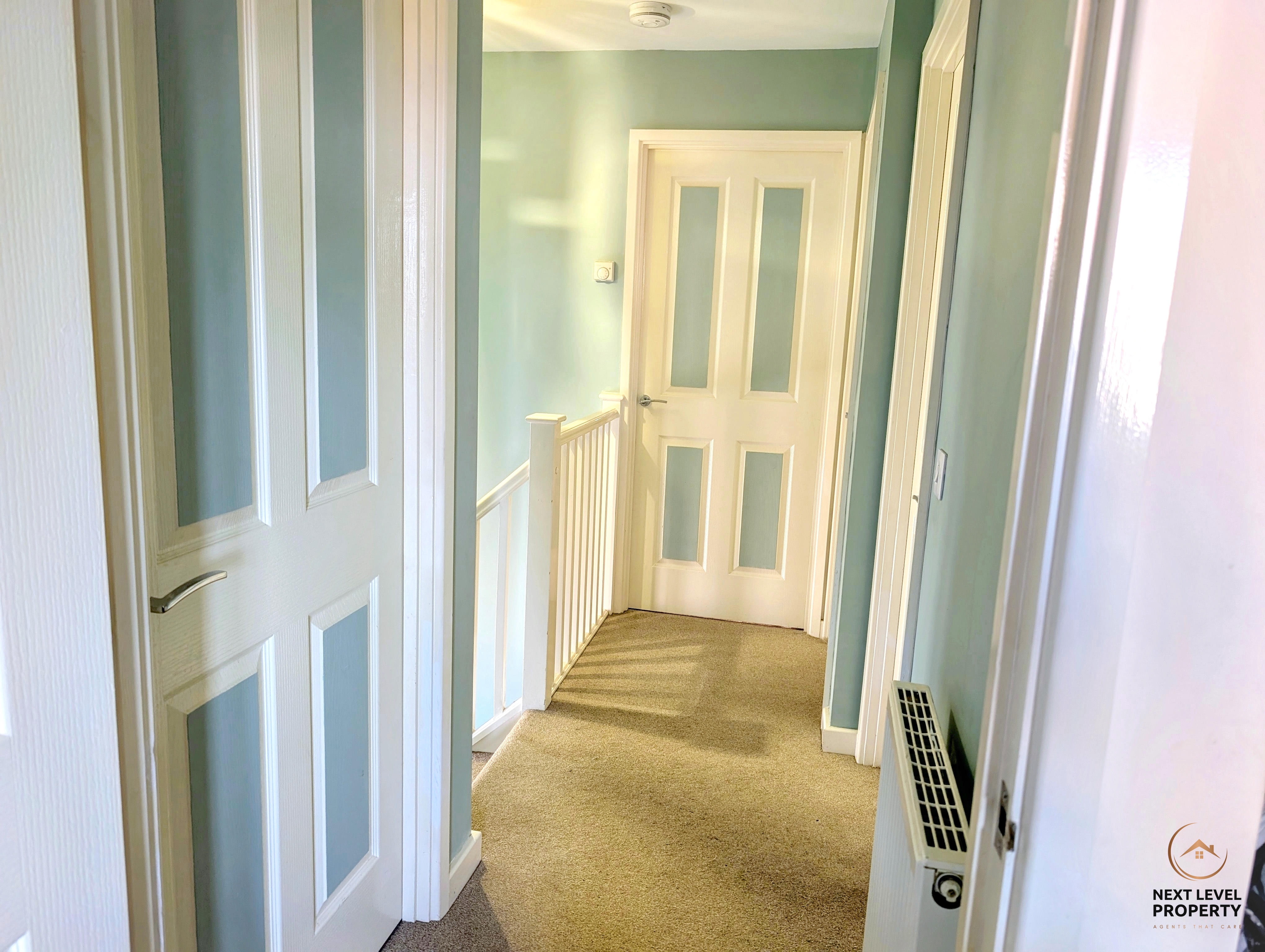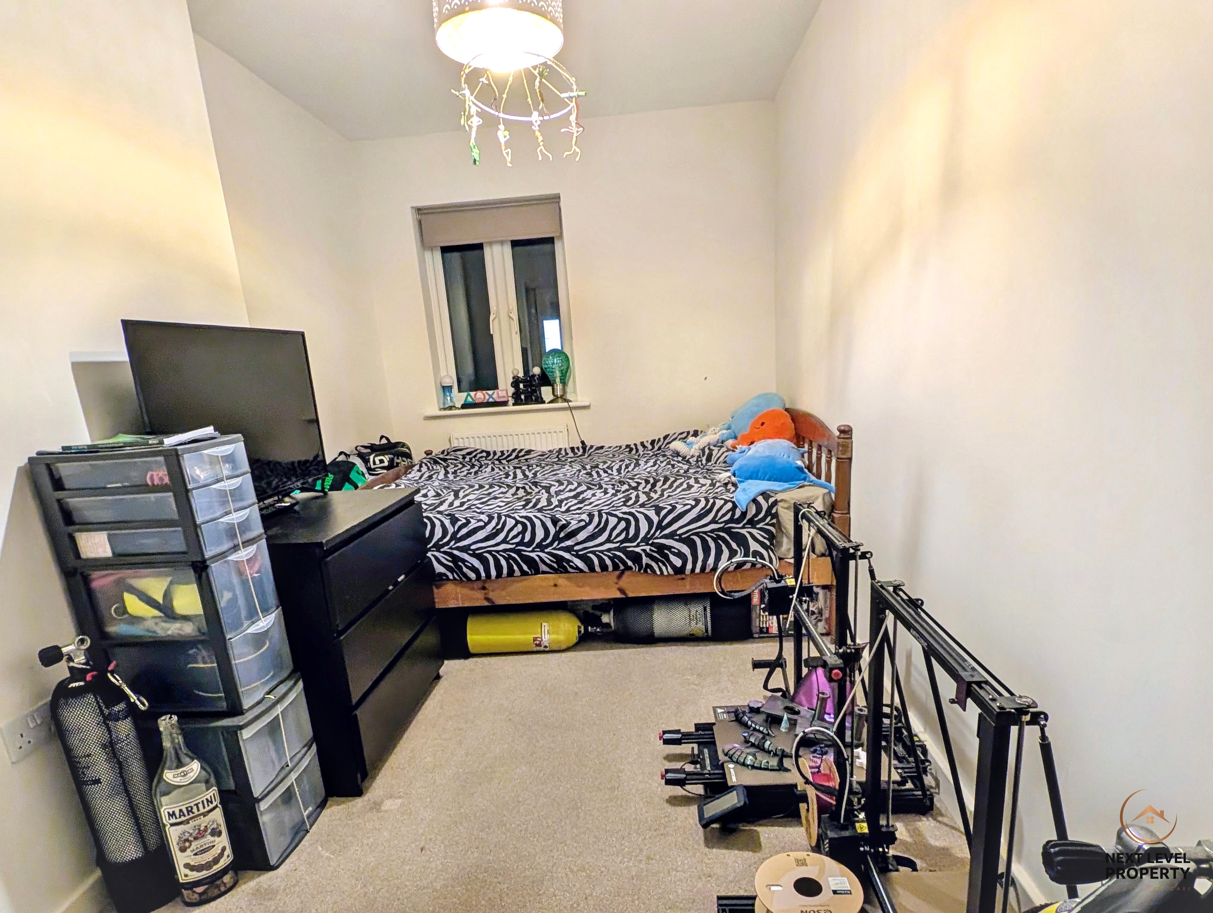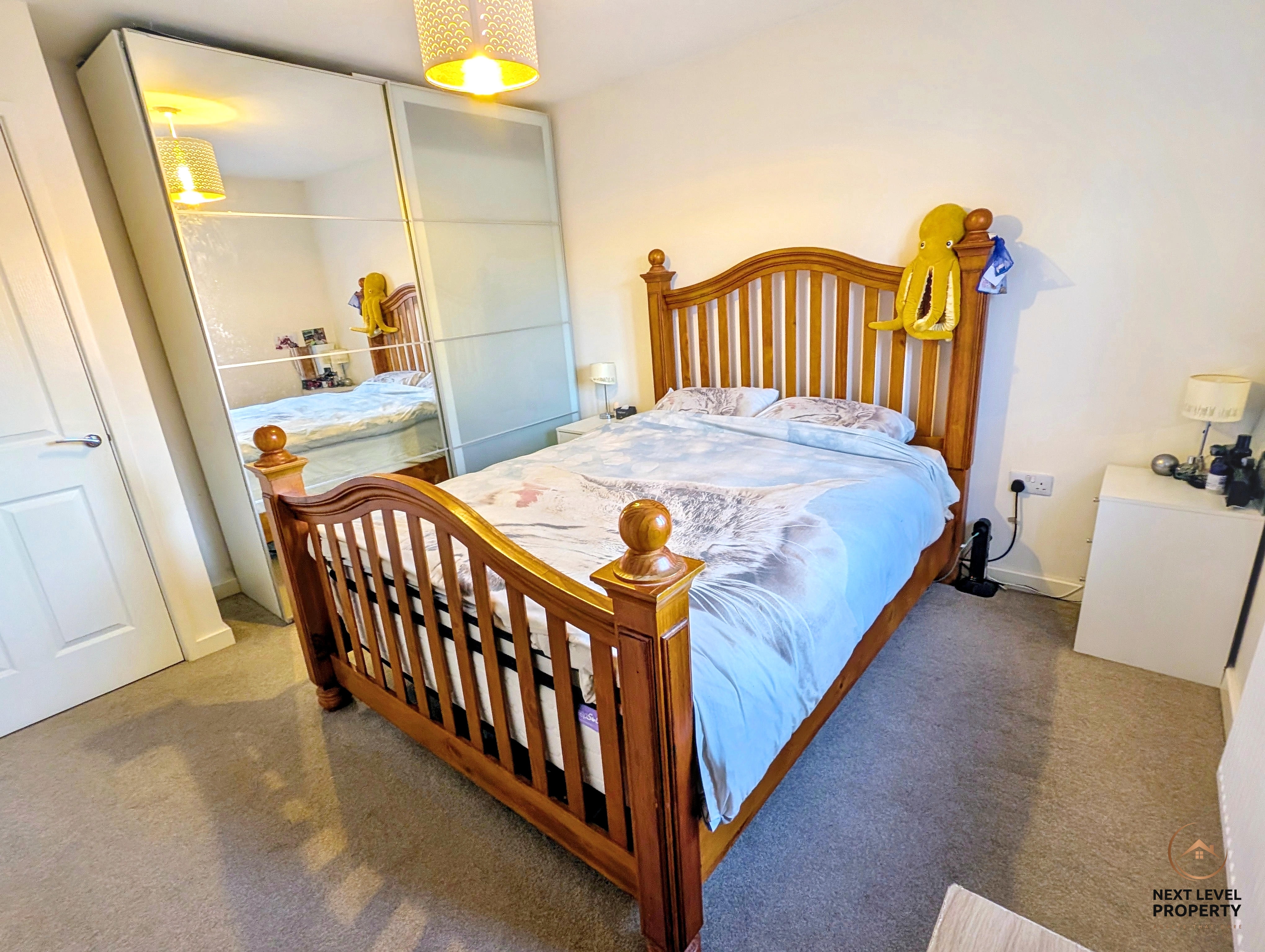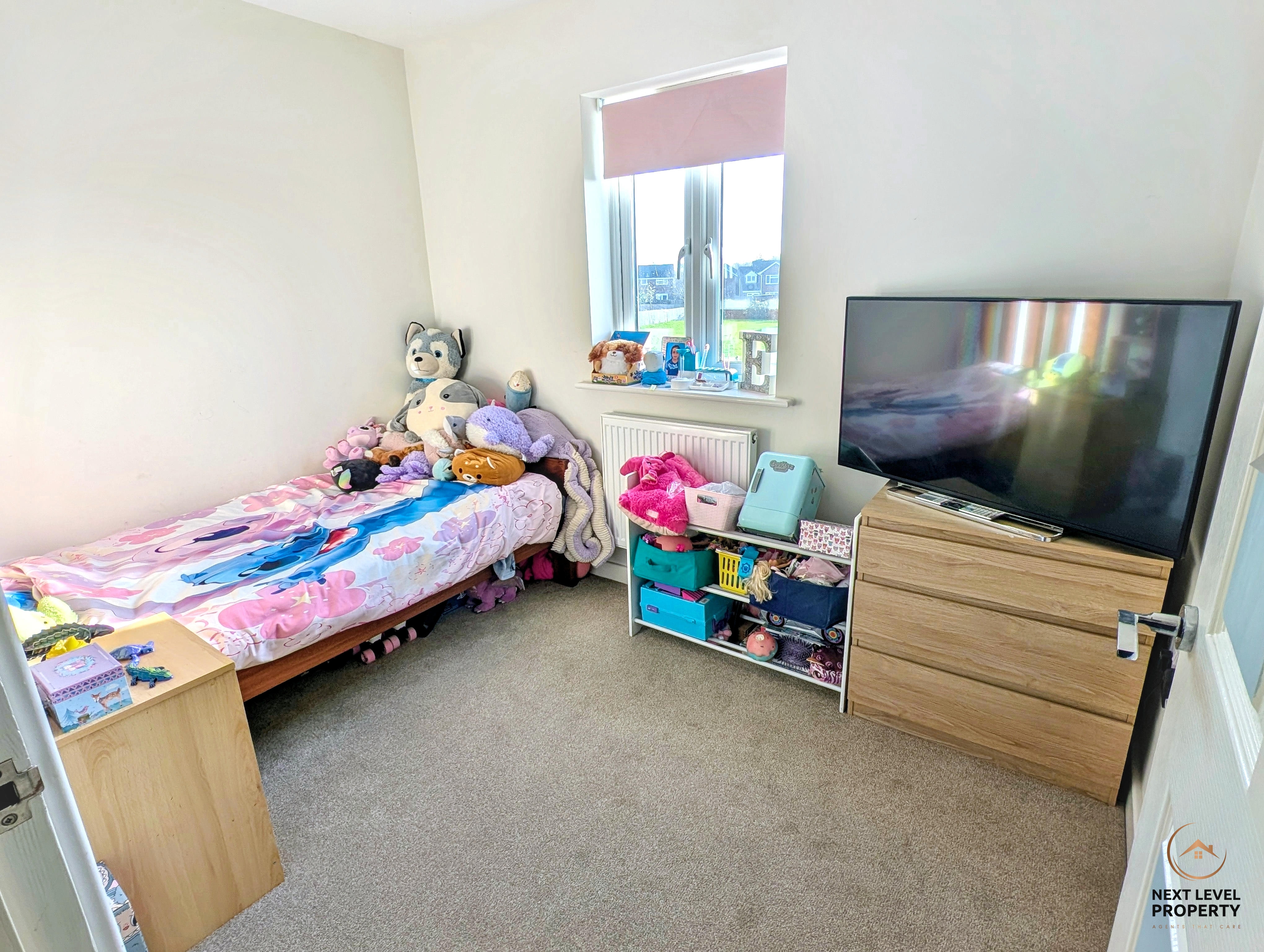 The principal bedroom overlooks the rear garden and offers ample space for a king-size bed along with wardrobes, drawers and bedside furniture. Bedroom two is another good-sized double room, also overlooking the garden. Bedroom three enjoys views across the playing field and towards the three allocated parking bays. Bedroom four is the smallest of the four, yet still a comfortable single room with space for a bed and additional furniture.