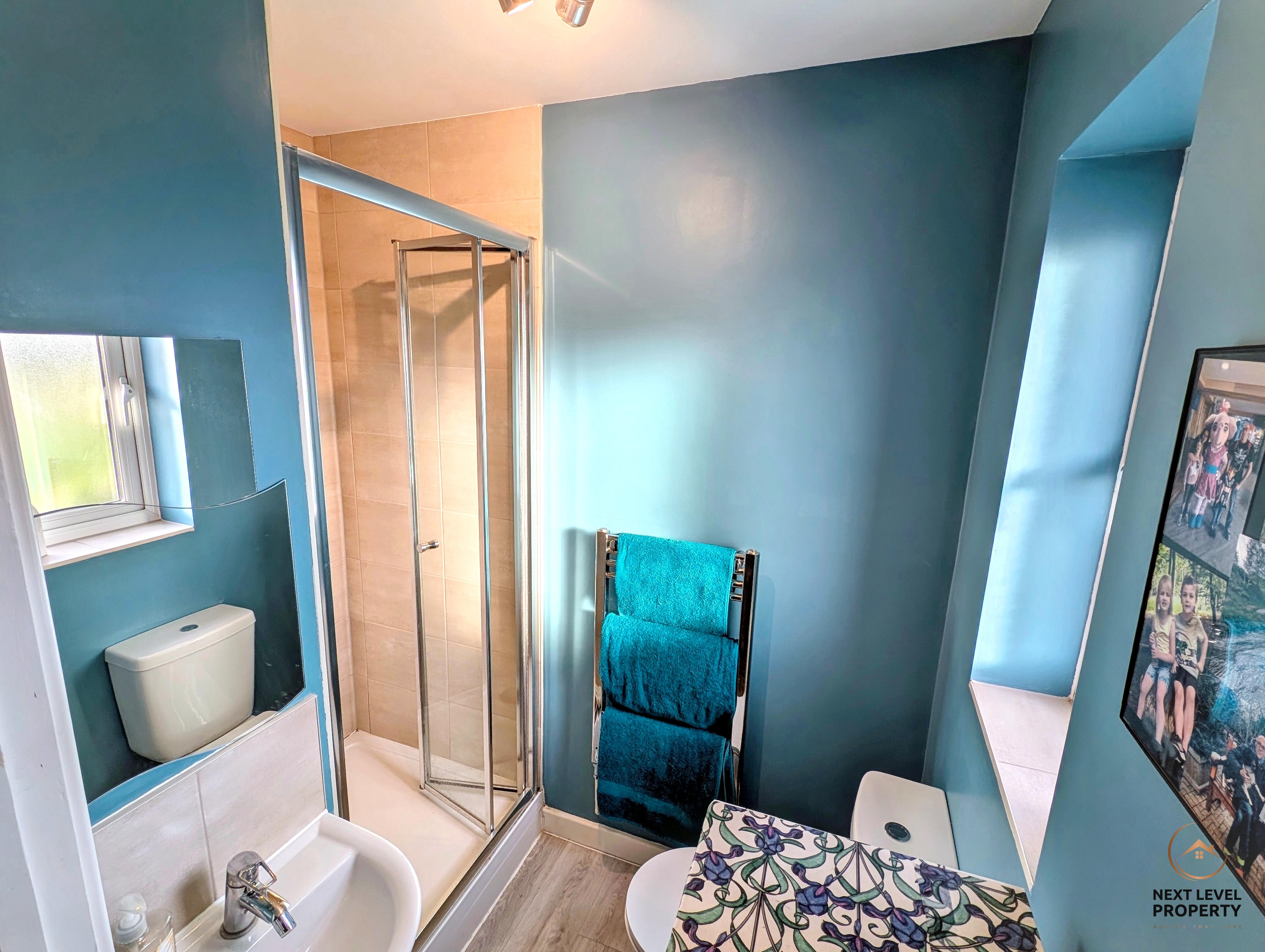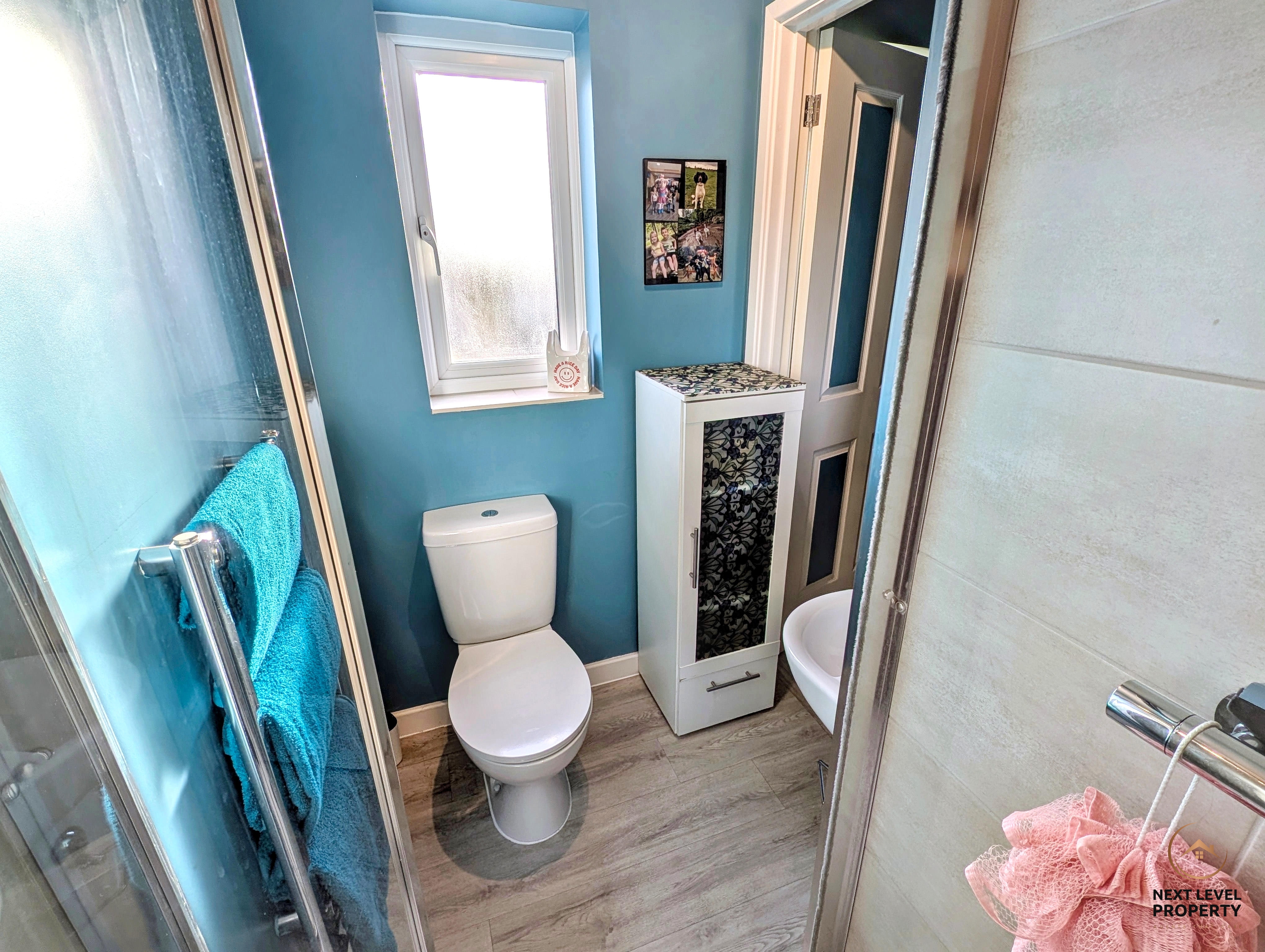 Returning through the hallway, you’ll find two large storage cupboards along with a convenient ground floor bathroom, complete with a shower, wash basin, WC and heated towel rail.