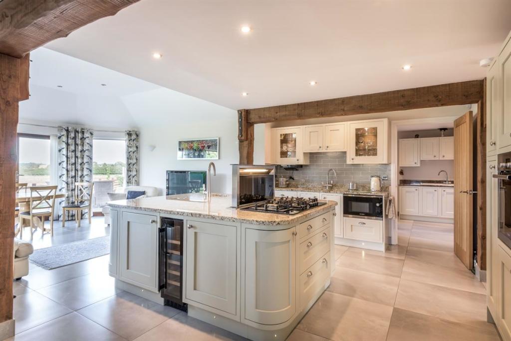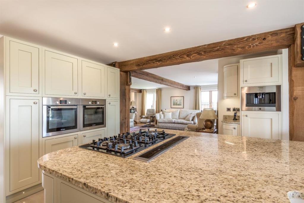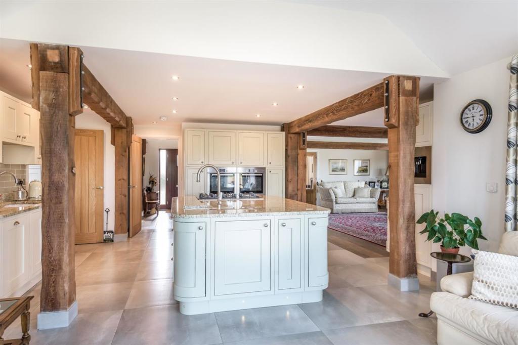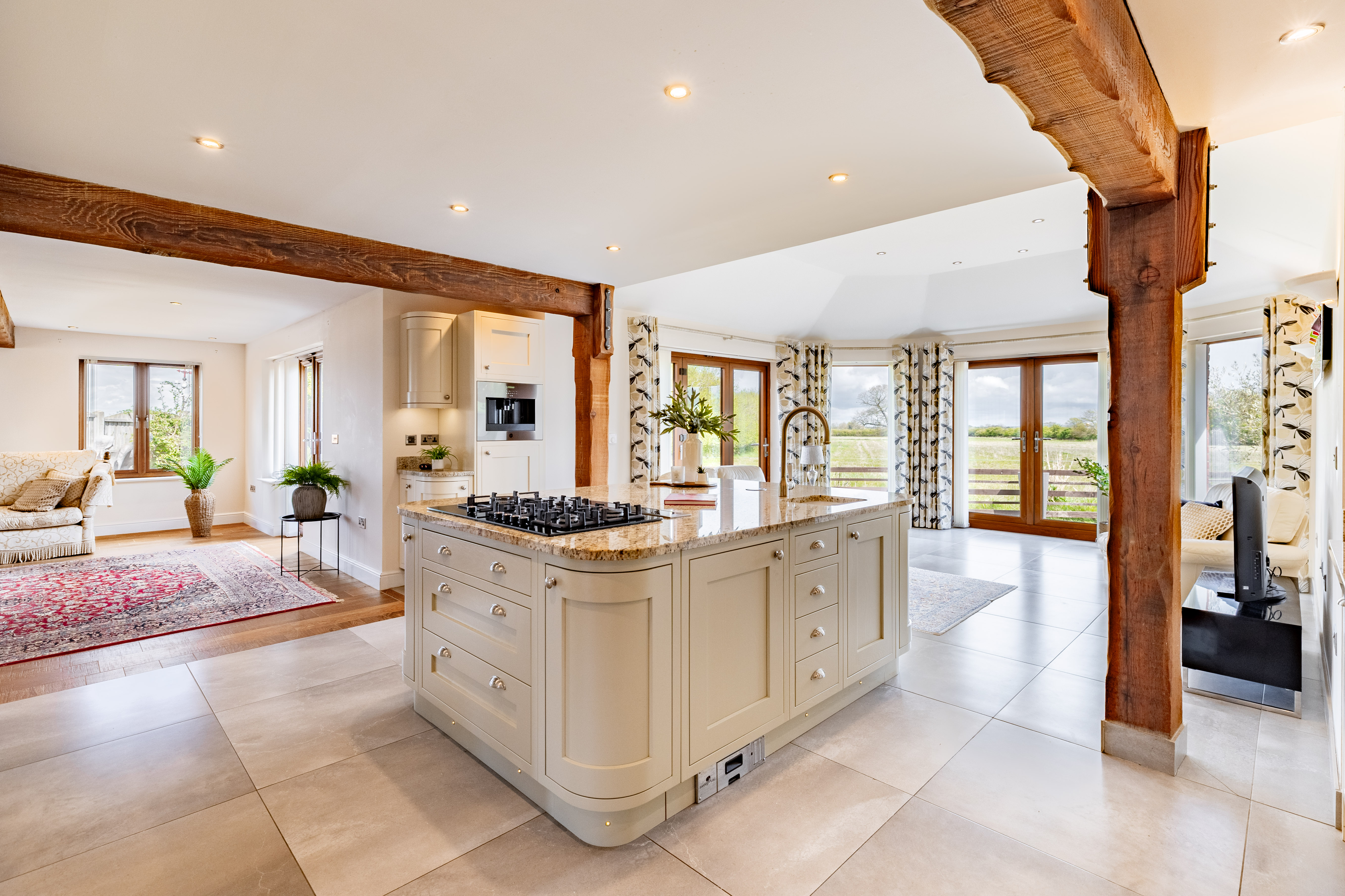 Whilst entertaining, the double doors to the impressive, open plan living room can be thrown open. There is still that rustic countryside feel in this expansive room with exposed timbers. But, the central granite kitchen island clearly defines the living room from the kitchen area.
