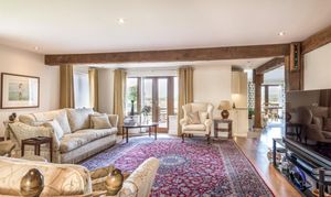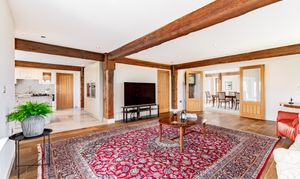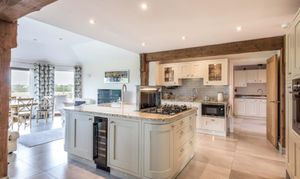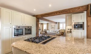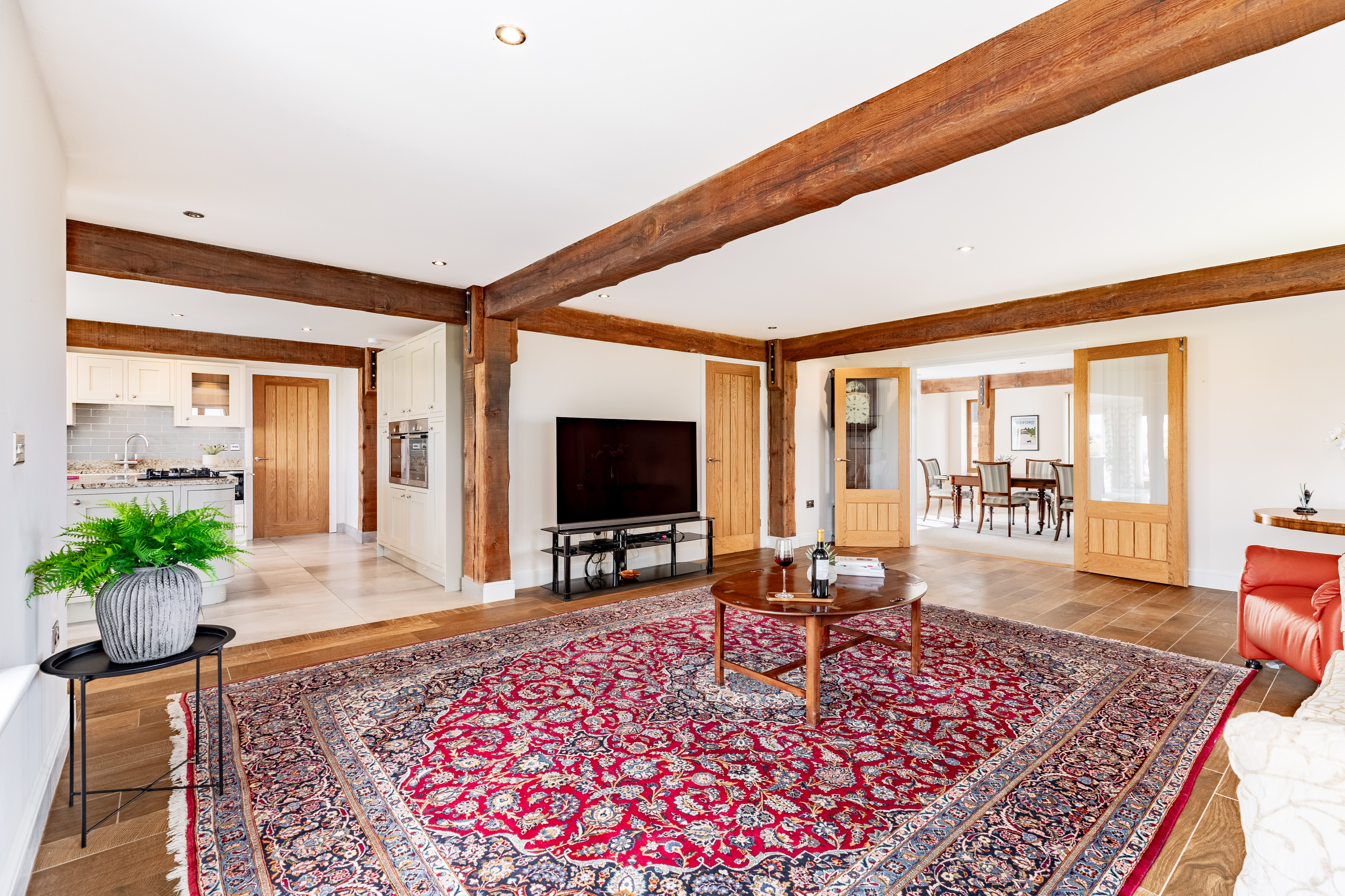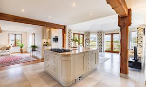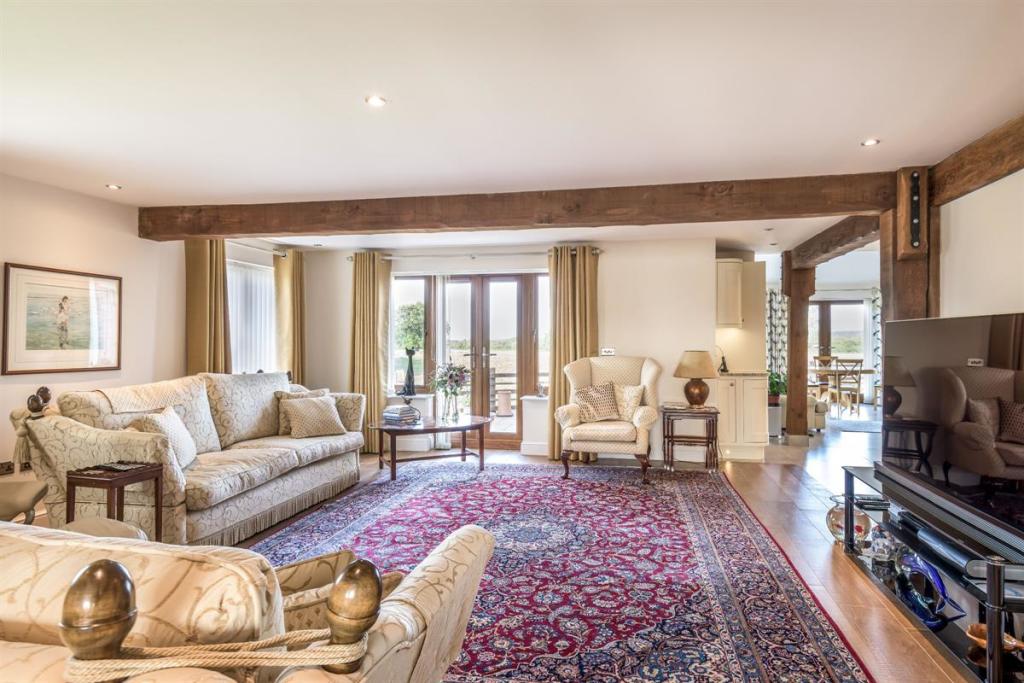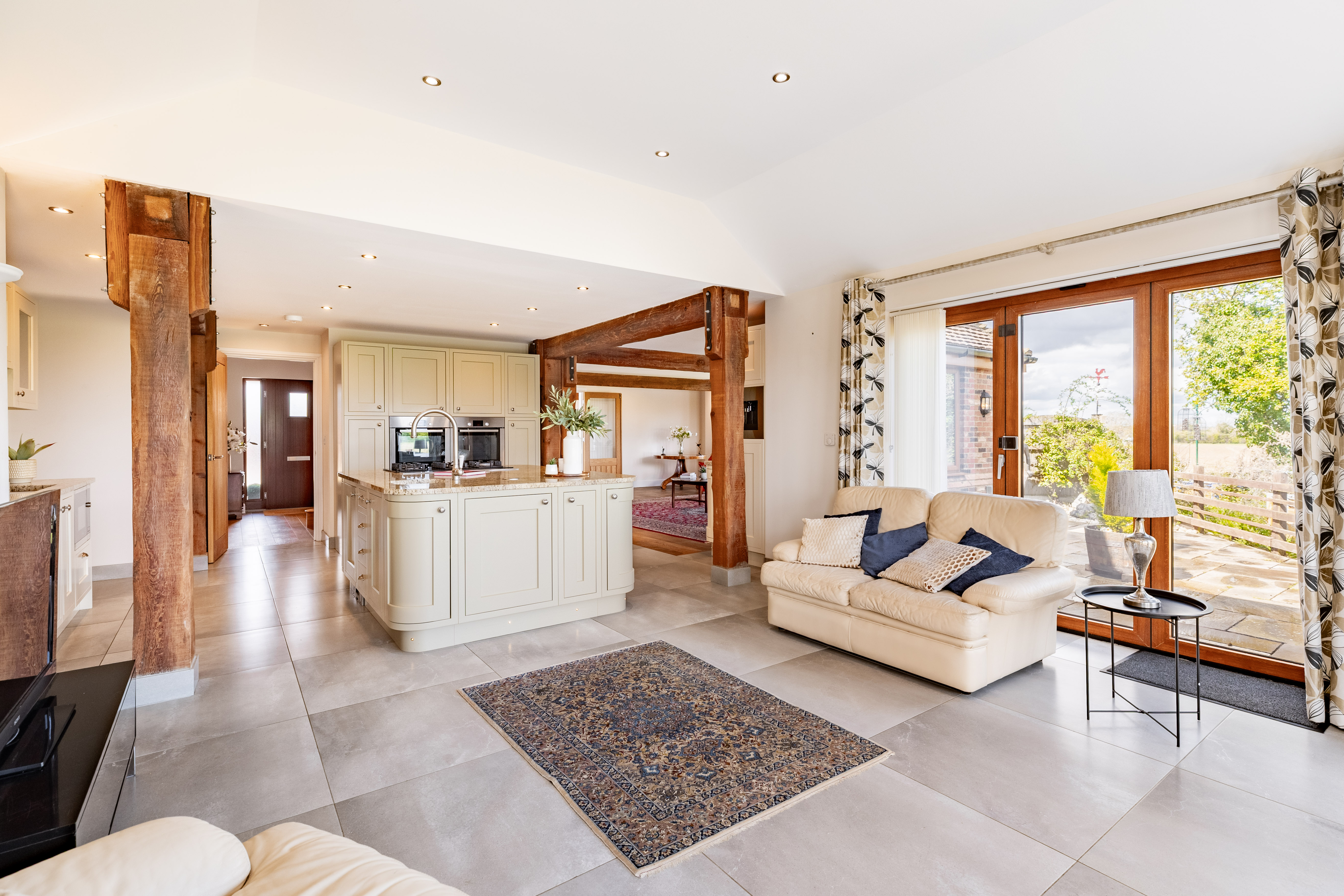 Whilst entertaining, the double doors to the impressive, open plan living room can be thrown open. There is still that rustic countryside feel in this expansive room with exposed timbers. But, the central granite kitchen island clearly defines the living room from the kitchen area.