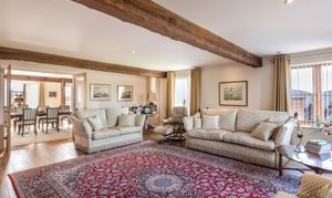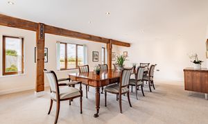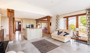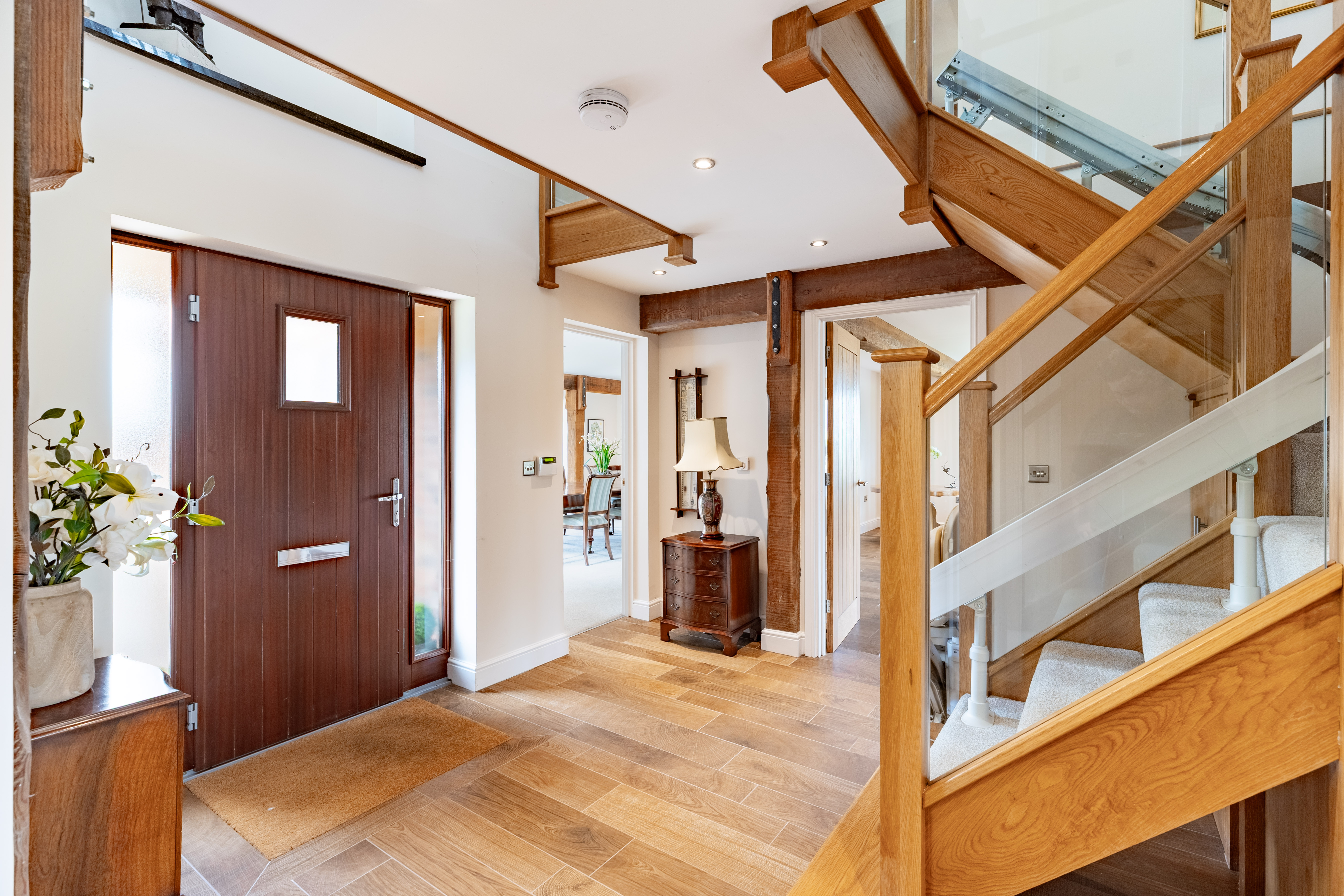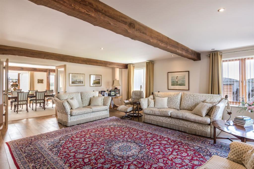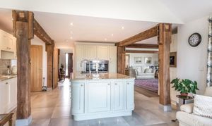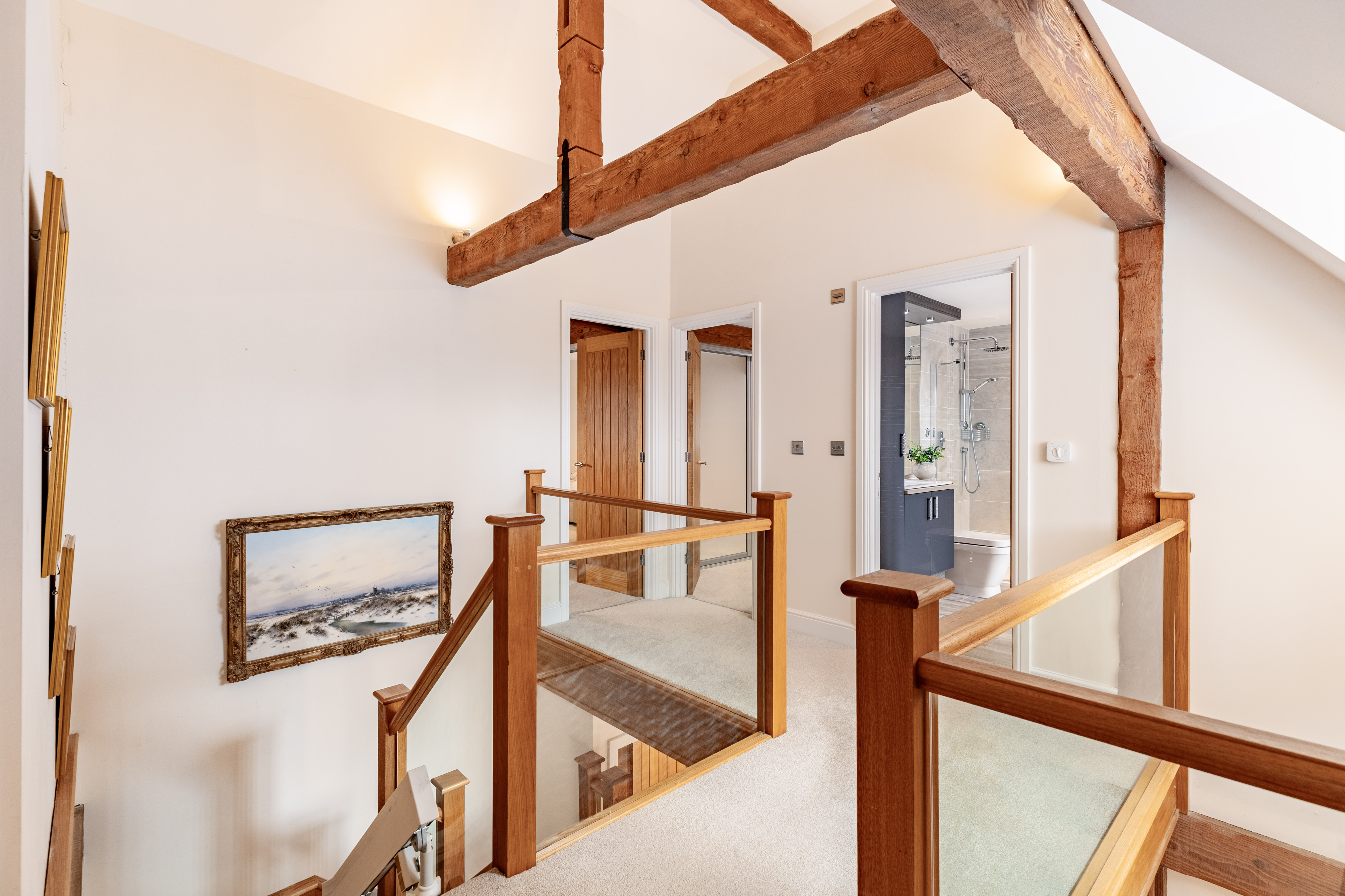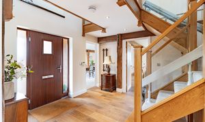 The front door welcomes you into the entrance hallway of this wonderfully spacious 4 bedroom home. The eye is drawn upwards to the glazed staircase and galleried landing, as light from the windows above pour down and fill the hallway. Oozing charm and character throughout as the exposed posts and beams showcase the rustic honesty and attention to detail.
