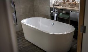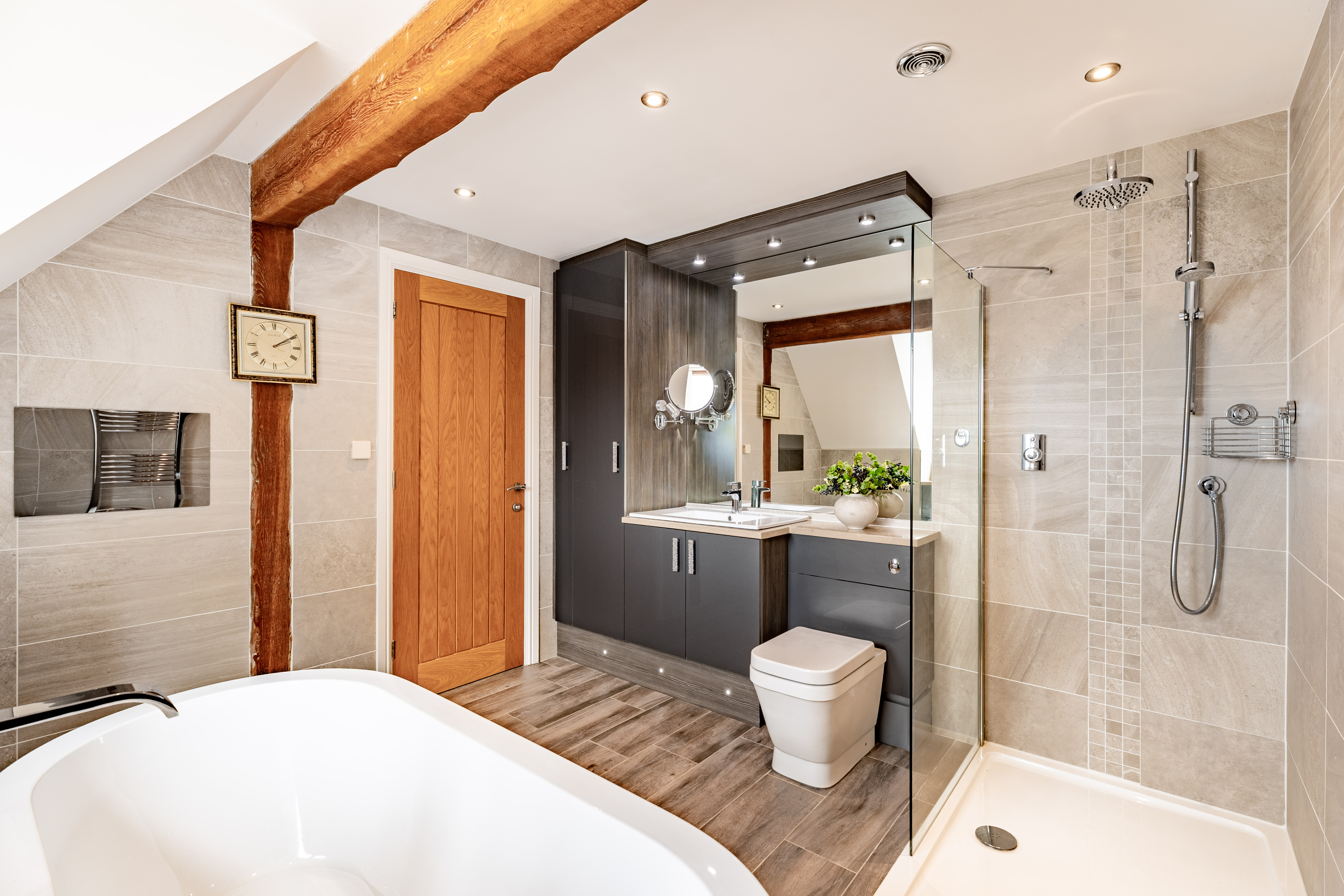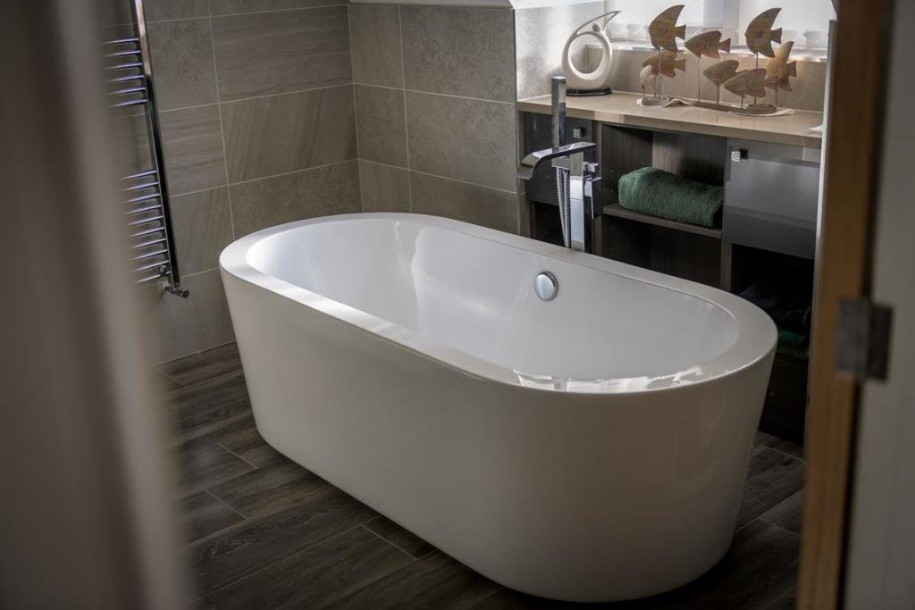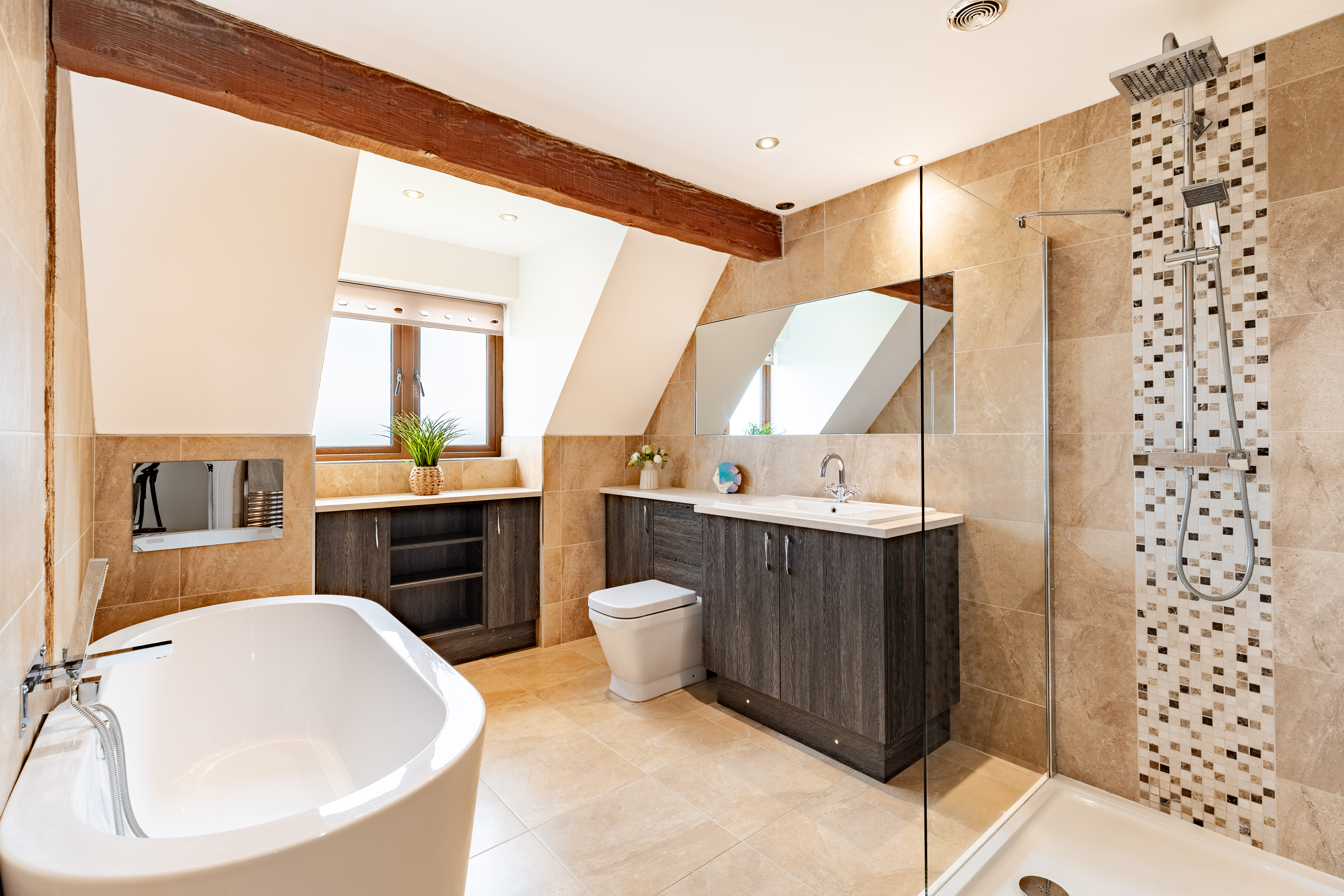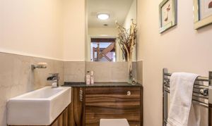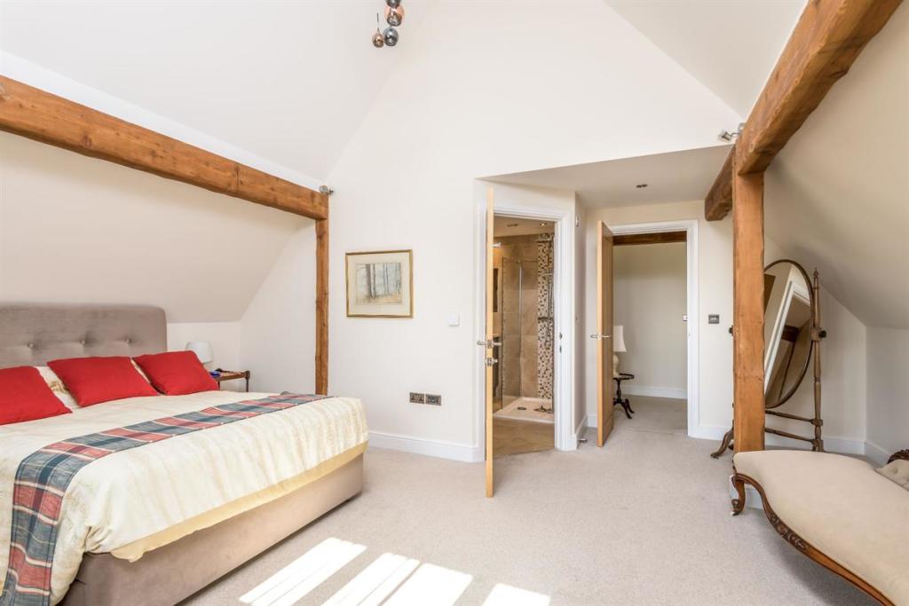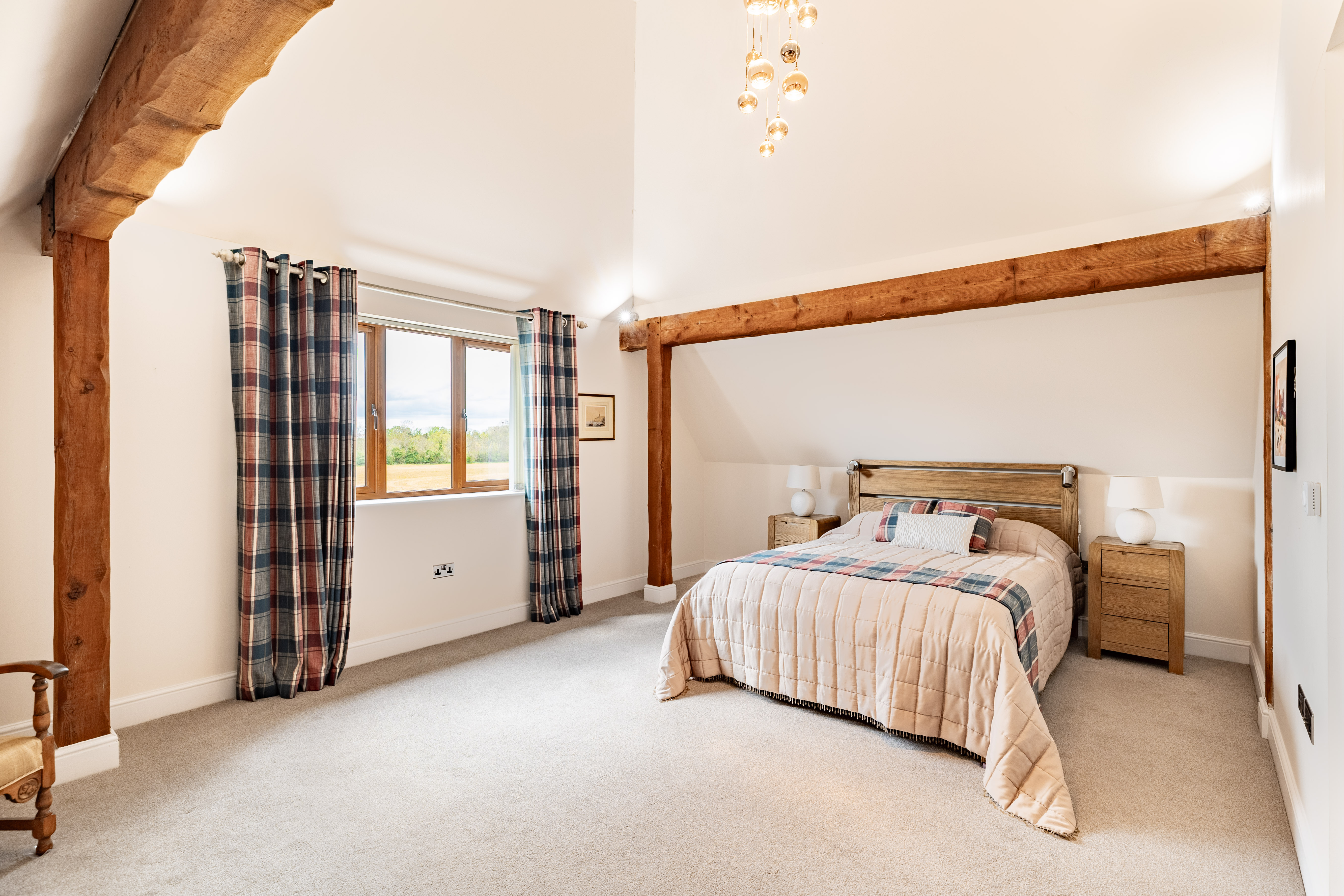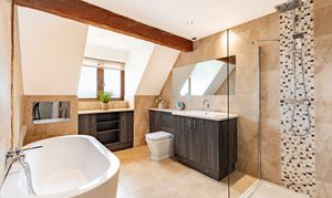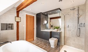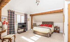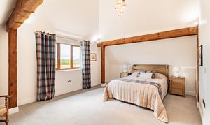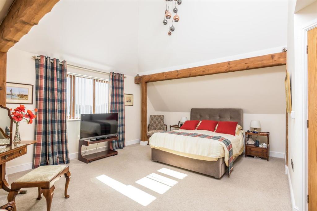 As the sun sets and it's bedtime, the stairs lead up to a central landing space. The master bedroom has a wonderfully high, vaulted ceiling with exposed beams. This room is ideal for a grown-up oasis of calm to allow you to rest and recharge after a busy day. The en suite bathroom is peaceful, perfect for soaking your troubles away whilst catching up on your favourite shows with the in-built TV.