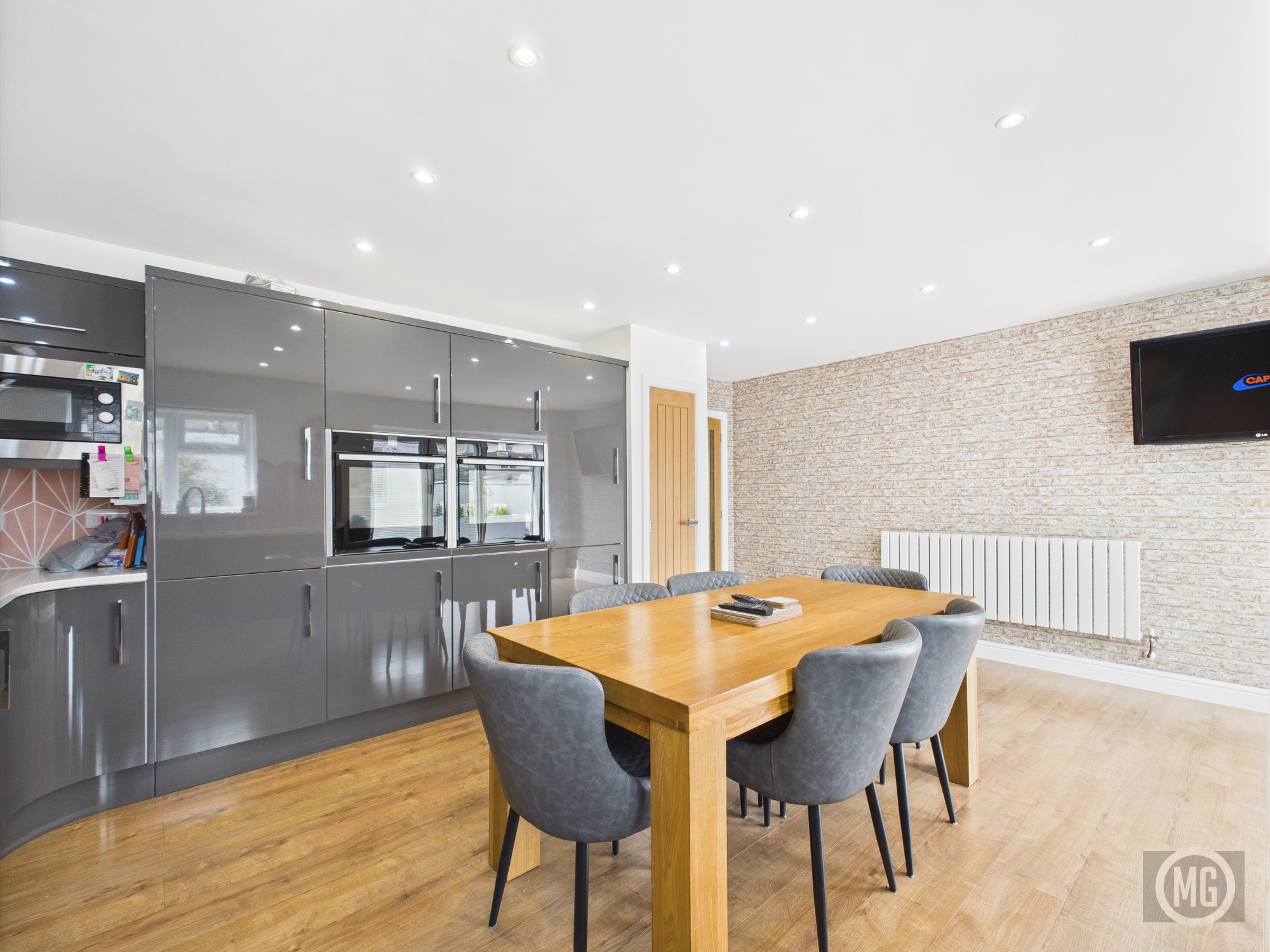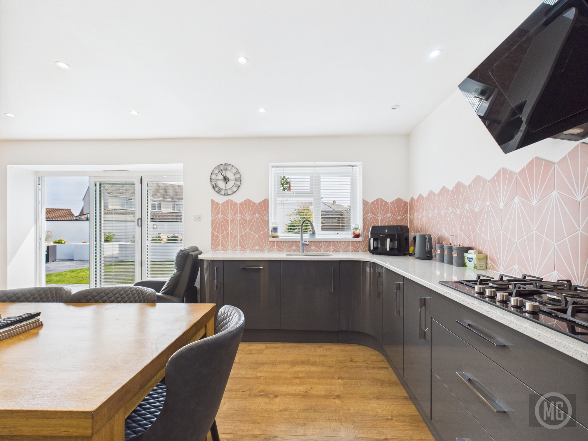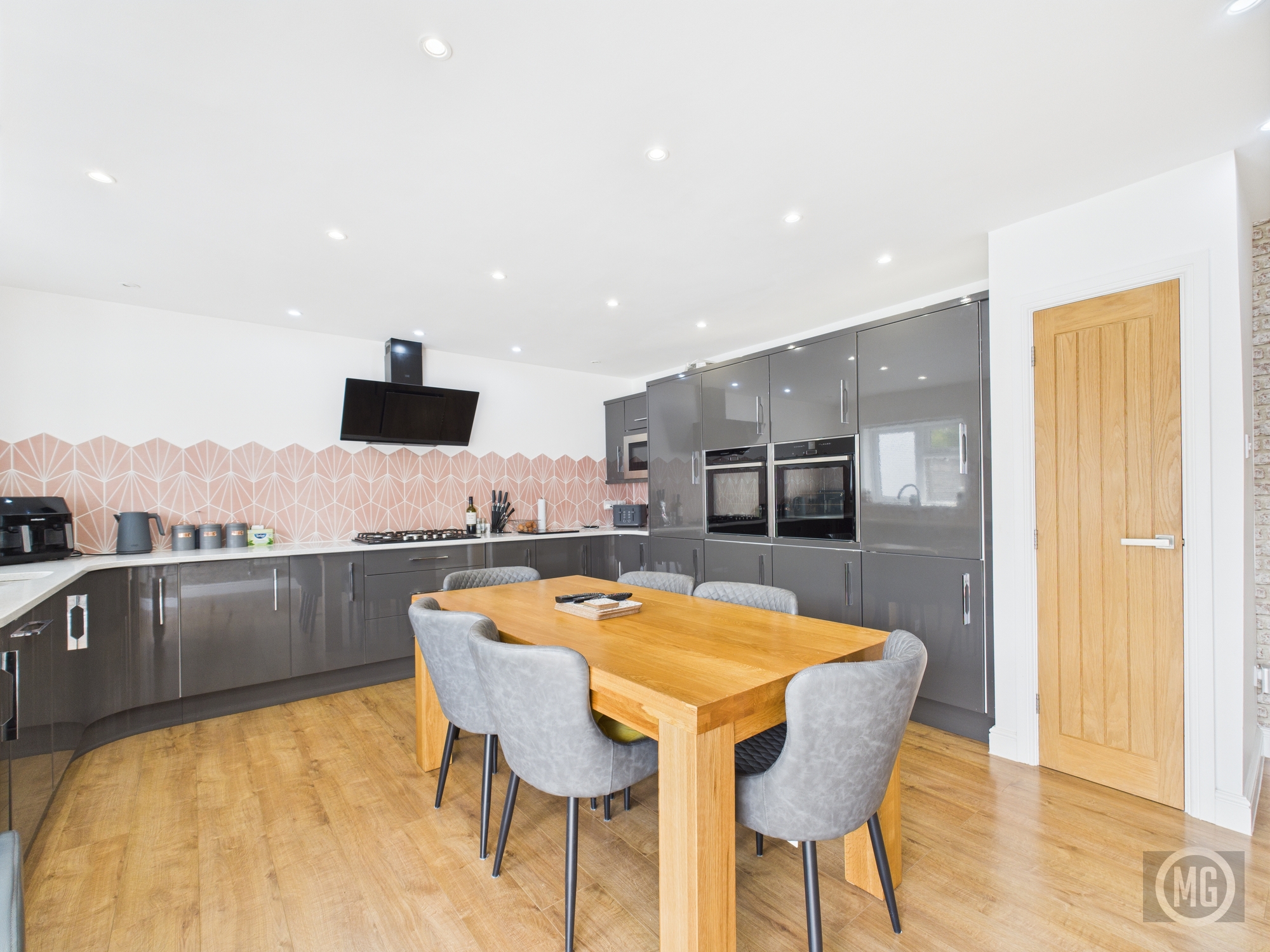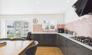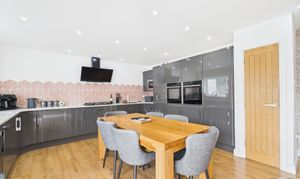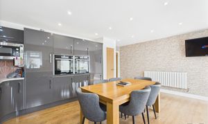 Range of high gloss wall and base units, integrated Double electric NEFF (hide and slide) oven, gas hob with overhead extractor, integrated microwave, integrated dishwasher, integrated fridge/freezer, full length pantry, deep pan drawers feature tiled splashback, quartz worktop, window with rear aspect, bi-fold doors, storage cupboard with oak door.