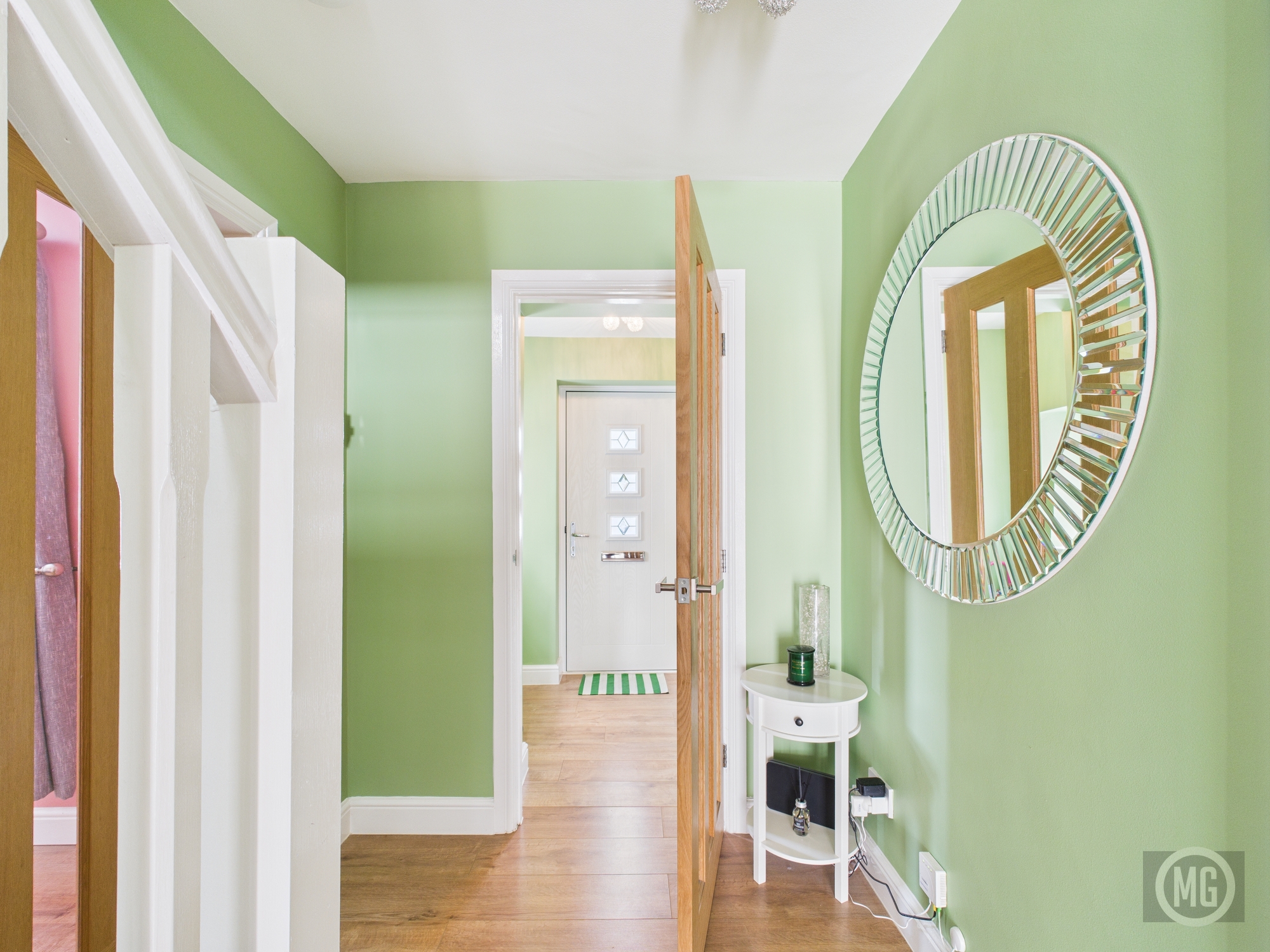 Composite front door, laminate flooring, window with side aspect, oak door leading into hallway