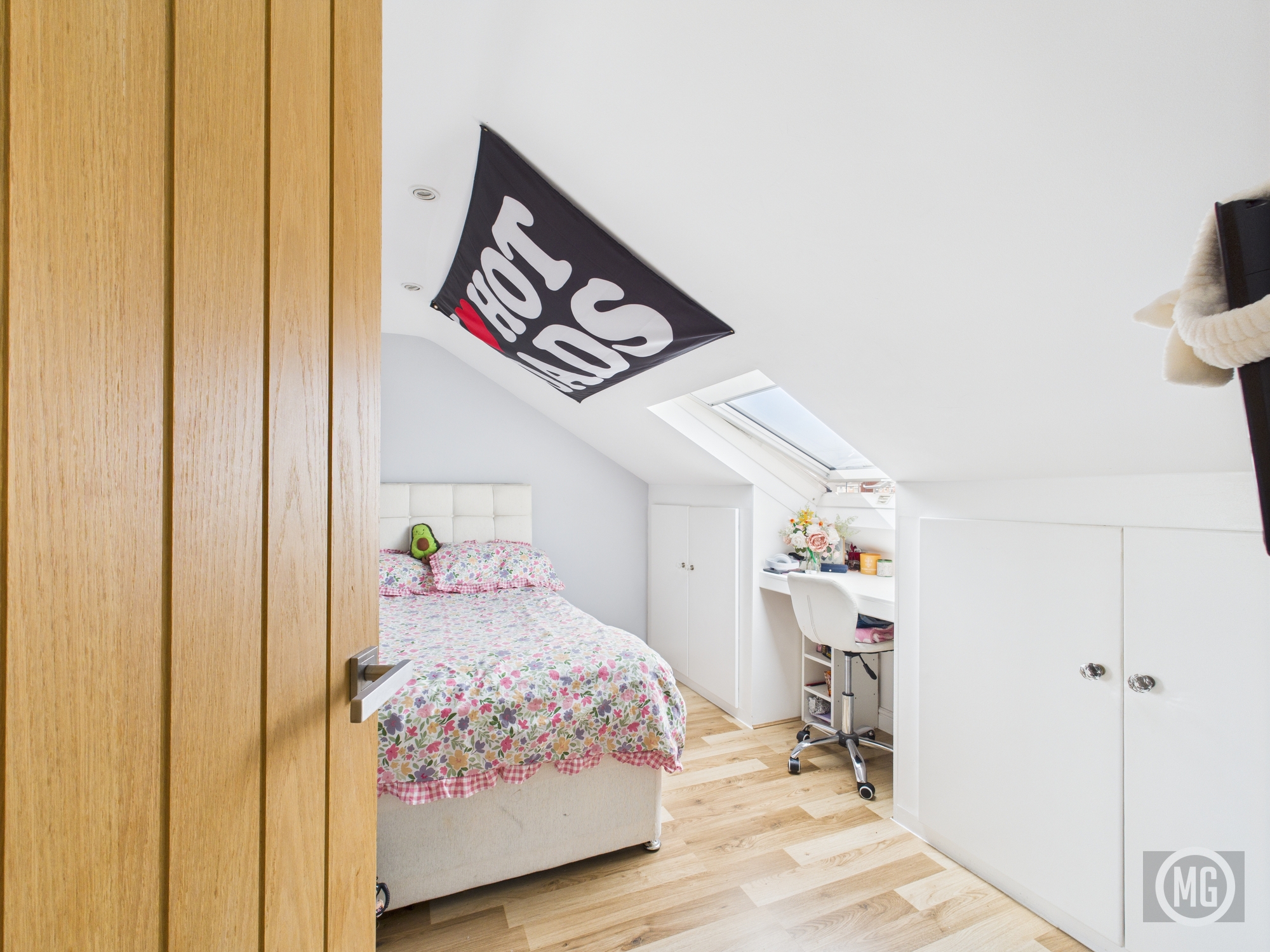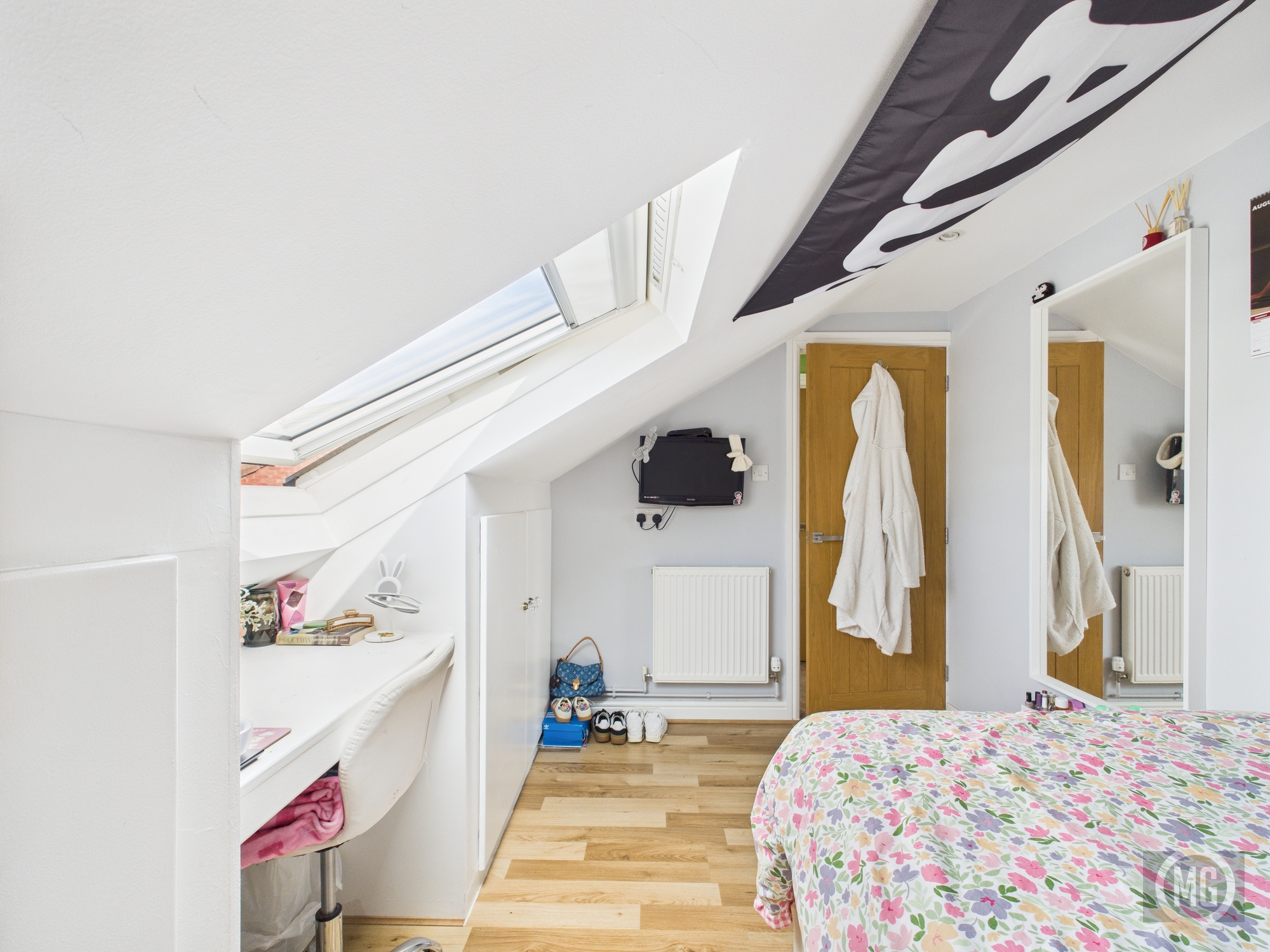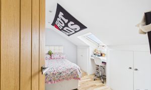 Laminate flooring, radiator, Velux window with front aspect, eaves storage, oak door