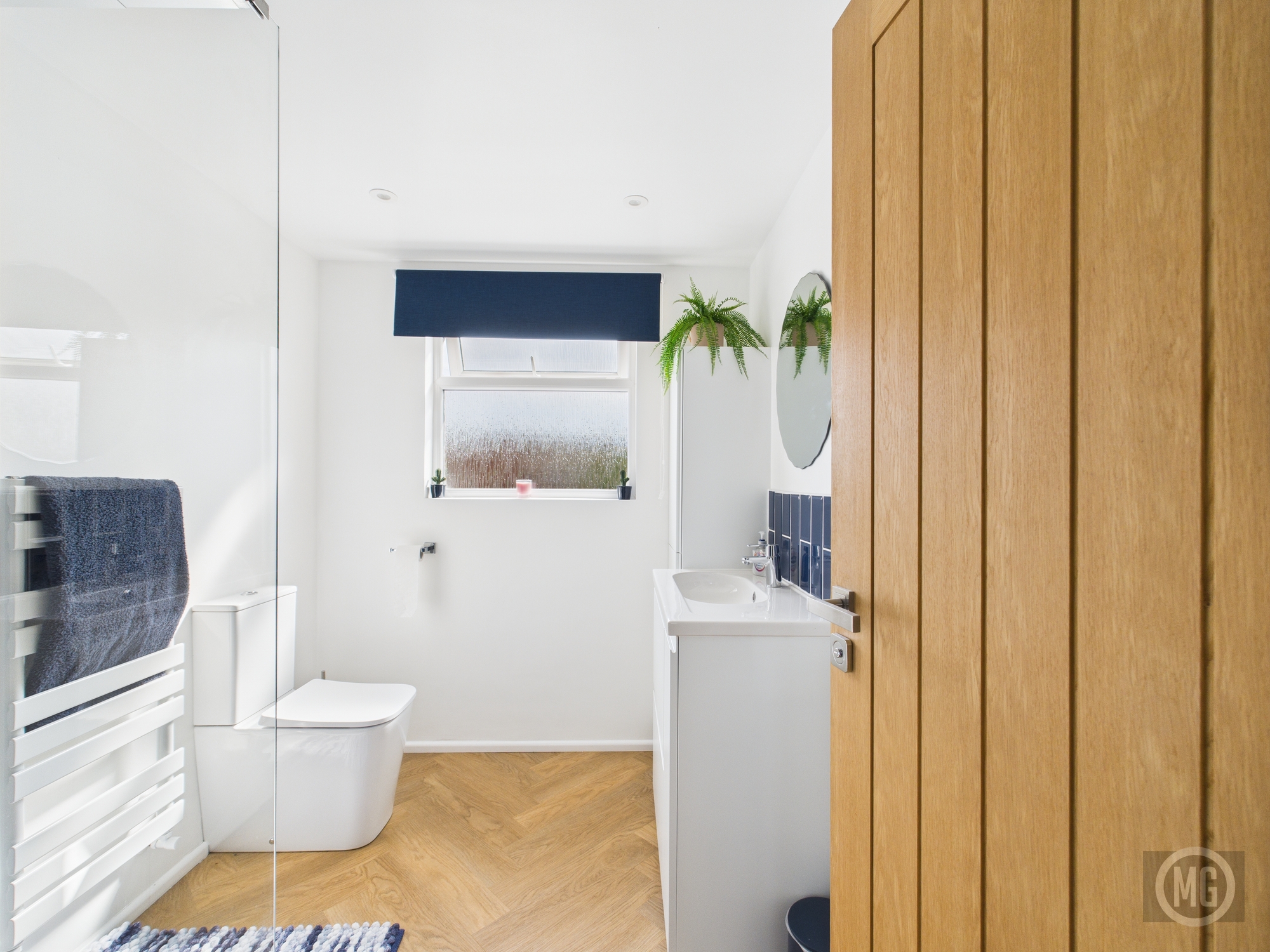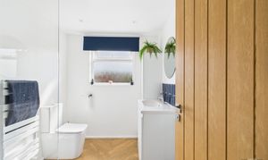 Laminate flooring, hand basin within vanity unit, WC, double walk in shower, heated towel rail, window with rear aspect, oak door