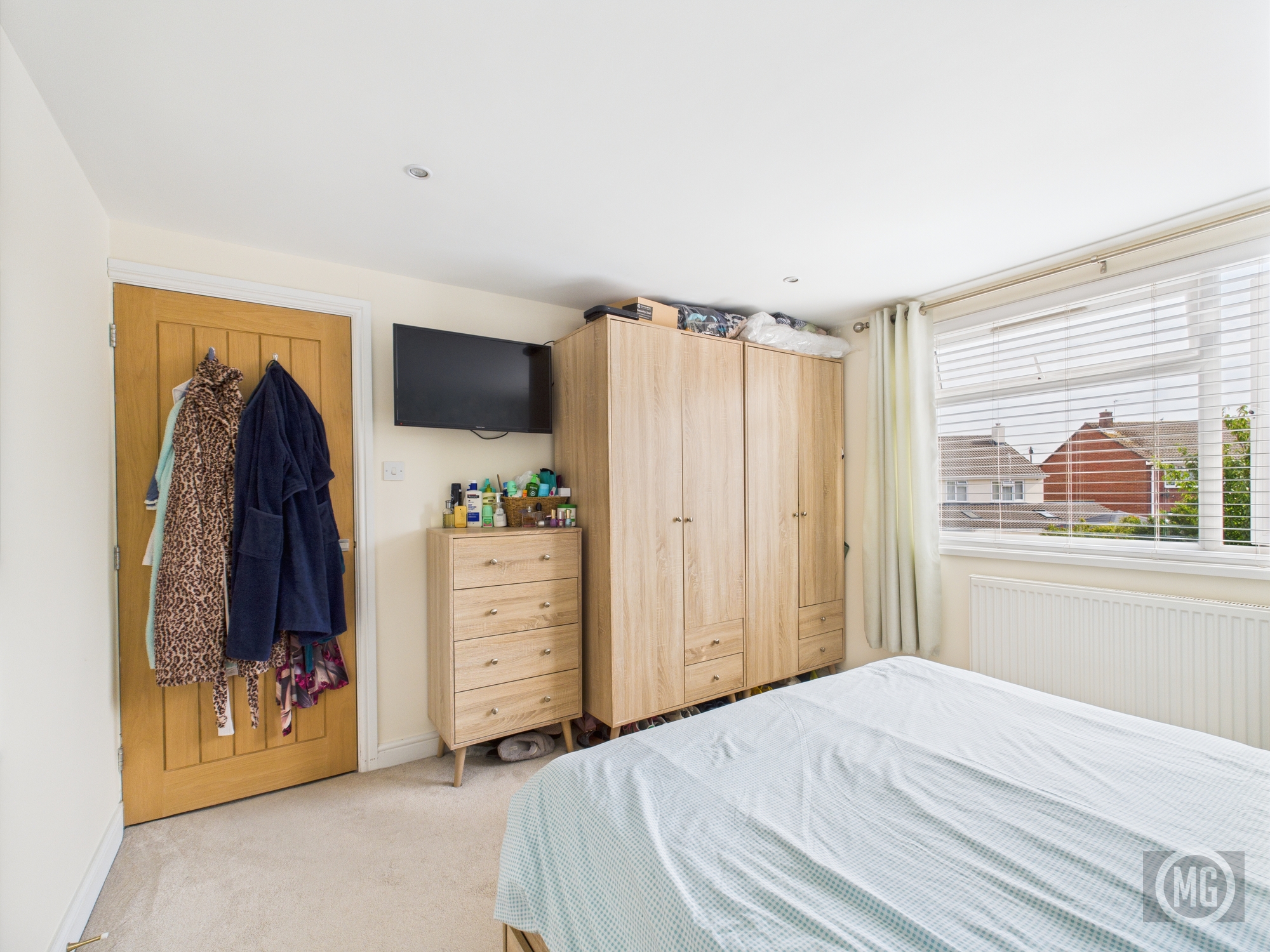 Carpet flooring, radiator, window with rear aspect, oak door